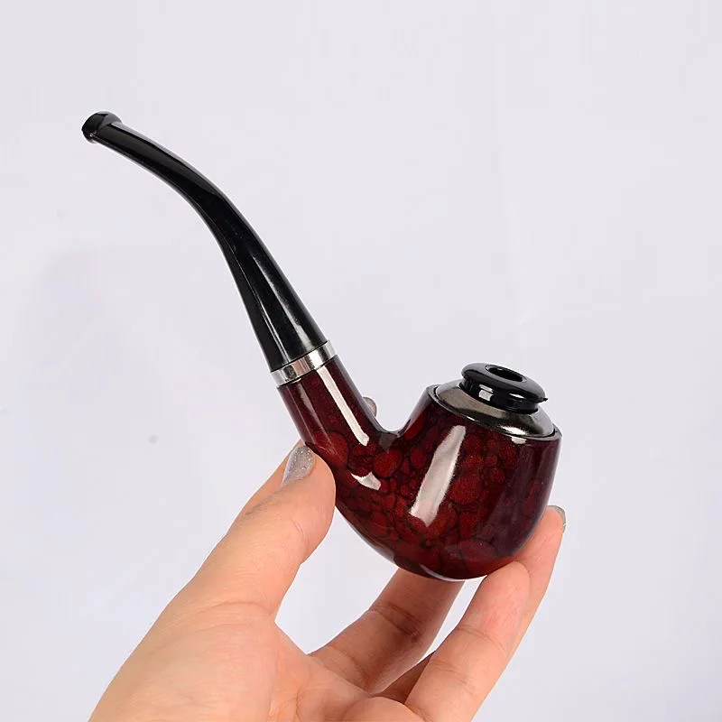 Experience the timeless charm of this handcrafted tobacco pipe, designed for both collectors and enthusiasts who appreciate fine craftsmanship. Its vintage, bent shape offers a comfortable grip and a classic aesthetic that stands out in any collection. Crafted from glossy acrylic material, this pipe features a rich, deep reddish-brown, marbled bowl with a smooth, polished finish that exudes elegance. The deep hue and textured pattern evoke a sense of tradition and sophistication. The slender black stem curves gracefully, seamlessly connecting to the bowl with a silver metallic band that adds a refined touch. Versatile and durable, this pipe combines form and function, delivering a satisfying smoking experience every time you indulge in your favorite tobacco blend.