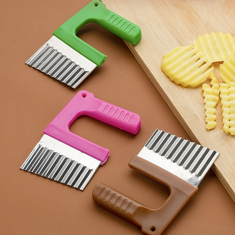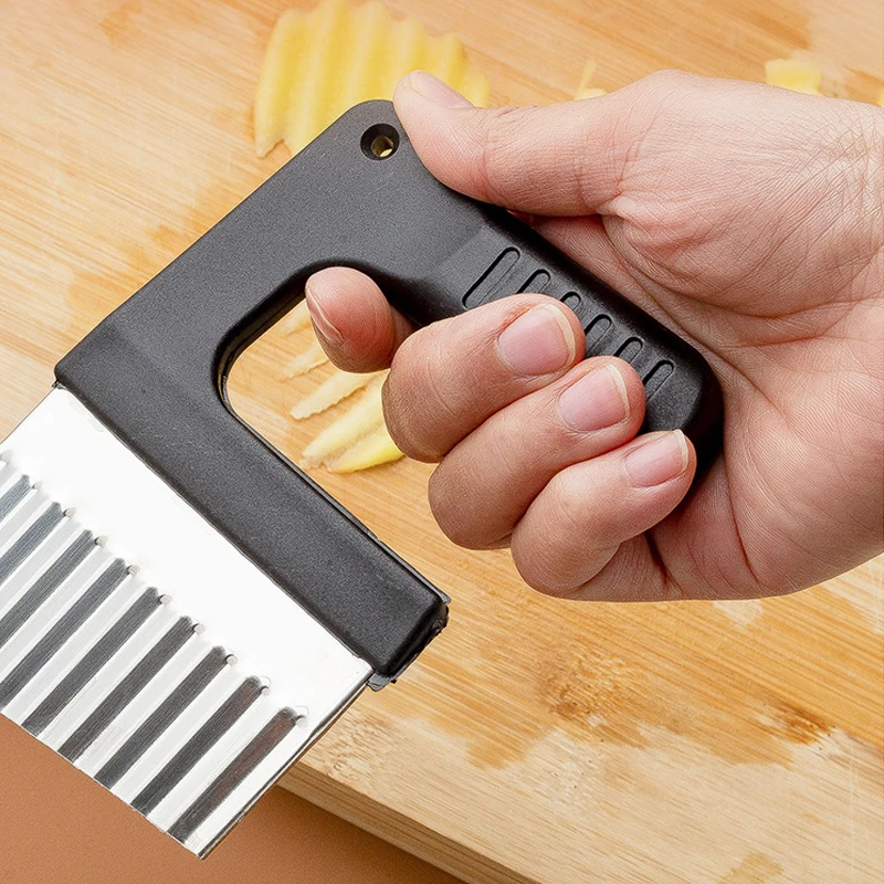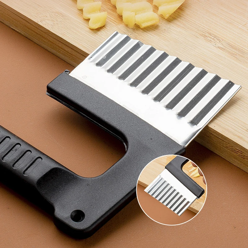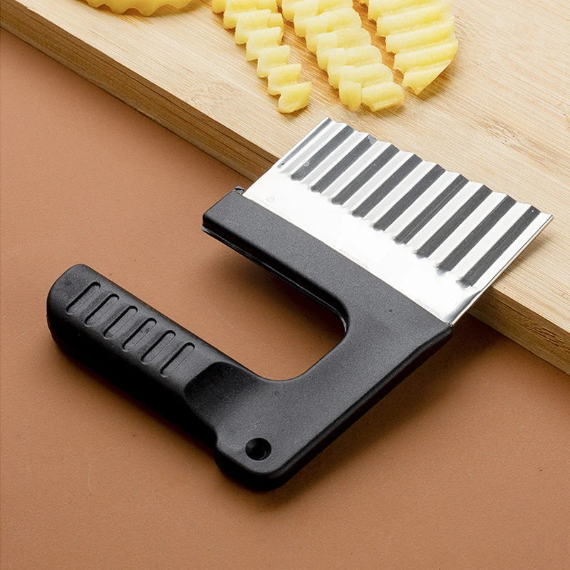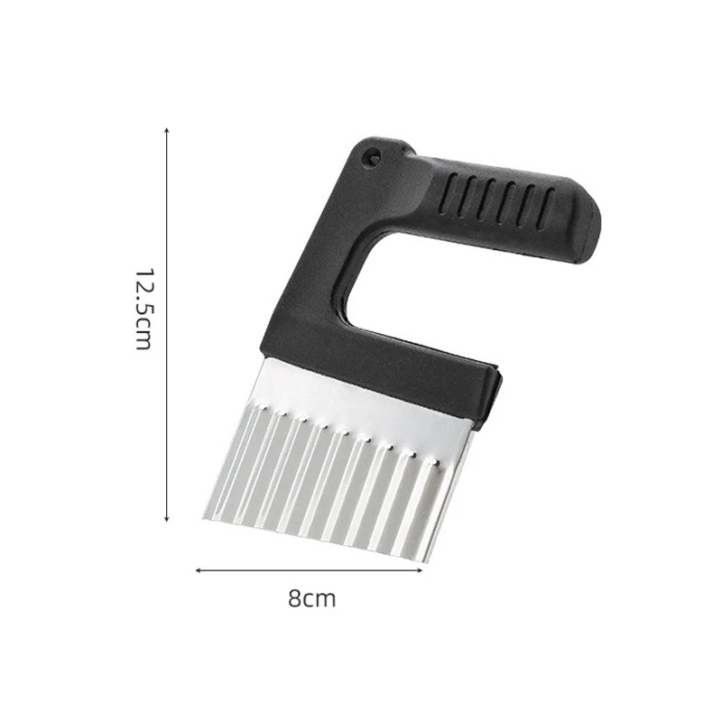 Experience effortless and precise crinkle-cutting with this handheld potato chip slicer featuring a durable stainless steel blade designed for wavy vegetable and fruit slices. Crafted from eco-friendly PP plastic, the ergonomic black handle provides a comfortable grip, making it easy to create decorative French fries and other wavy cuts. Its lightweight and compact design ensure convenient use in your home kitchen, all while emphasizing safety and environmental consciousness. Perfect for adding a touch of style to your culinary creations, this versatile slicer is ideal for those who love to prepare visually appealing, uniform ingredients with ease.