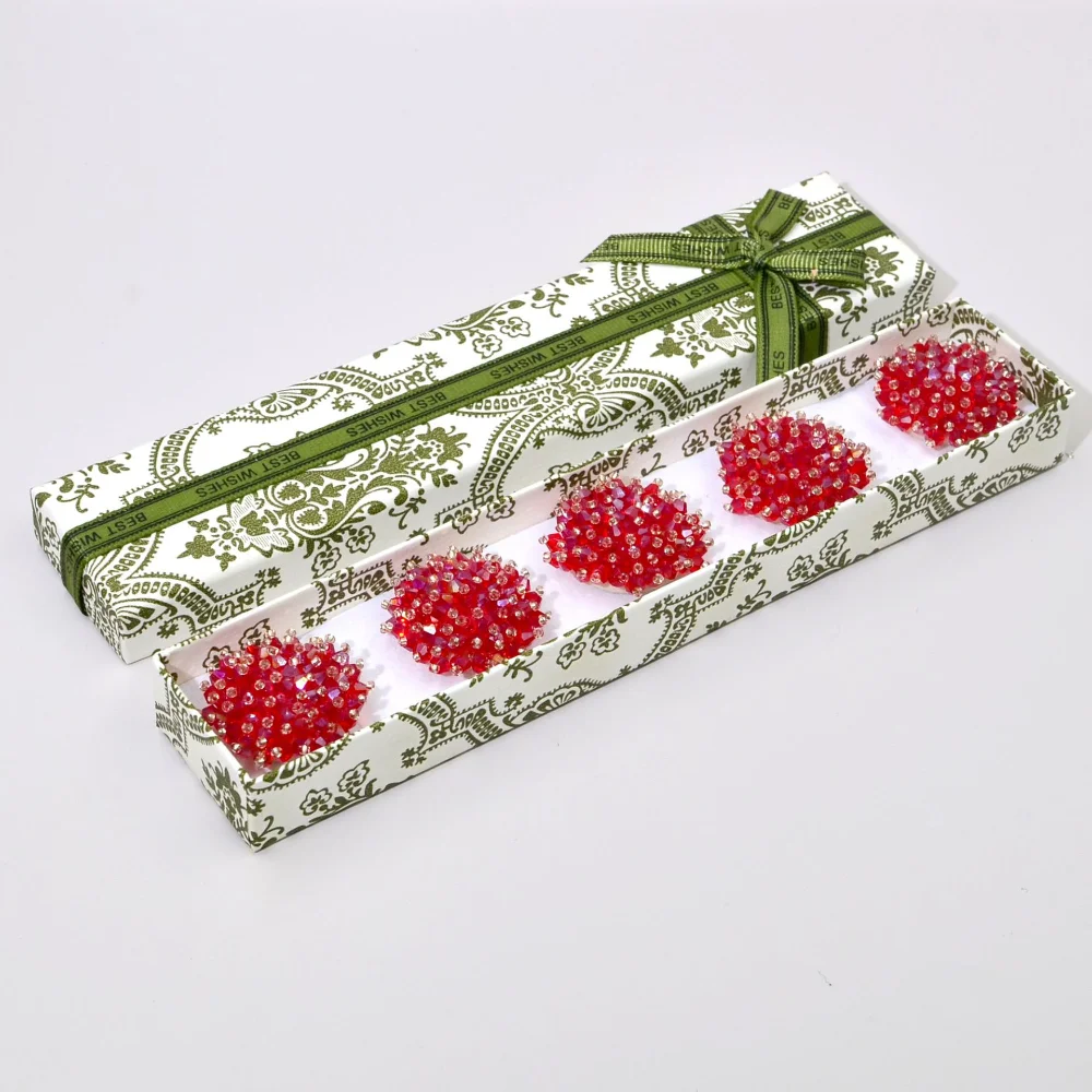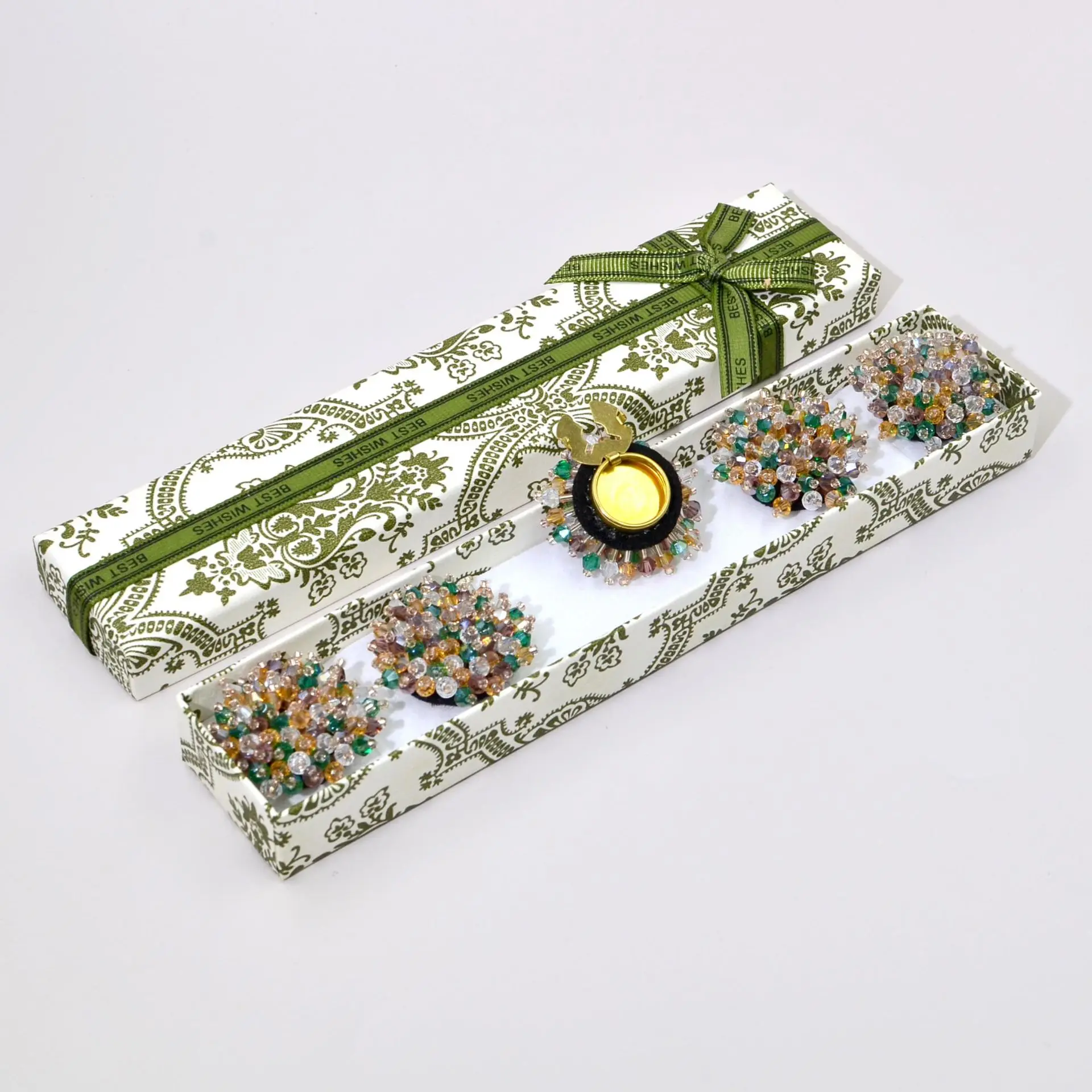 Experience the elegance and charm of this beautifully crafted Handmade Beaded Brooch Set. Each piece is meticulously designed with rich dark blue hues and a stunning array of glittering beads that create a luxurious three-dimensional effect. Nestled in a charming open gift box adorned with green paisley patterns and a vibrant green ribbon, these brooches make a perfect statement accessory. Whether you’re dressing up a jacket, enhancing a backpack, or adding flair to a hat, this versatile set is designed for both male and female wearers. The central gold-toned accent on one brooch adds a striking touch of sophistication to your collection. Let these exquisite pieces enhance your unique style.