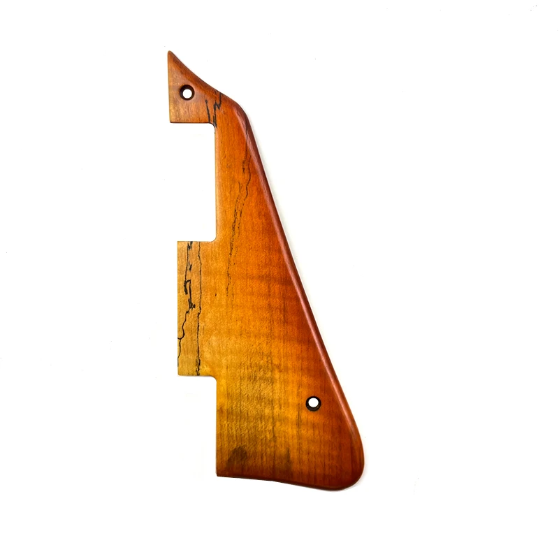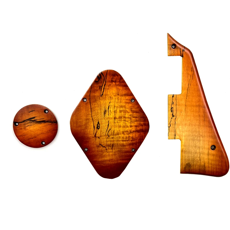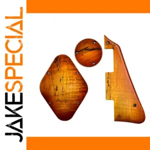 - Includes a teardrop-shaped pickguard, circular control cavity cover, and an elongated switch cavity cover, all crafted from maple wood with a warm, orange-brown stain for natural aesthetic appeal.