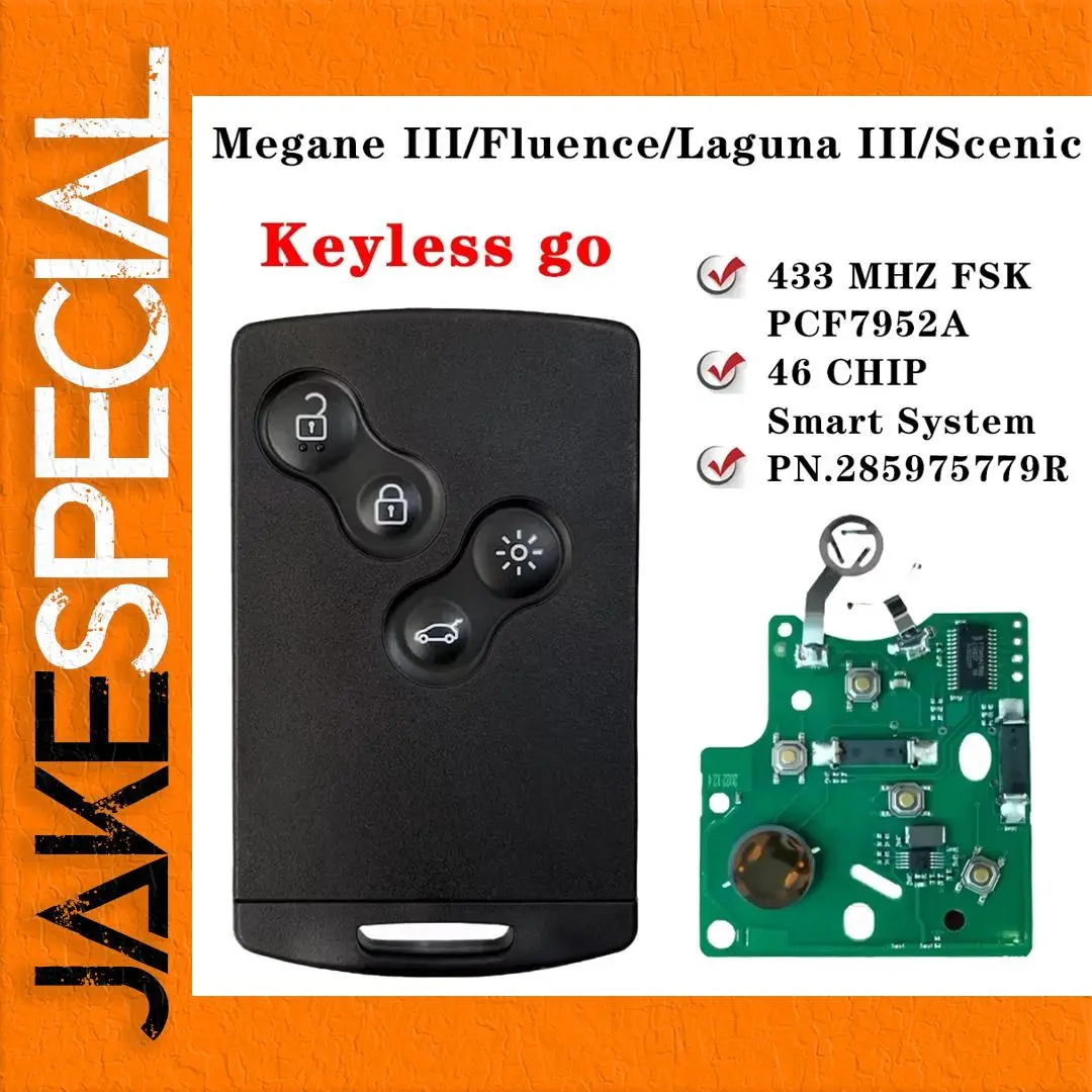 The hands-free keyless smart card key is a perfect accessory for your Renault, providing you seamless convenience and modern style. Designed to be compatible with models such as the Megane III, Fluence, Laguna III, Scenic, and Grand Scenic between 2009 and 2015, it operates at 433.92MHz using FSK modulation. This sleek, predominantly black key features easy-to-use tactile buttons for locking, unlocking, and opening the trunk, all housed within a streamlined design. Internally, it has a PCF7952A chip and a CR2032 battery compartment, ensuring dependable performance. With customization options available, this smart card key balances practicality with a contemporary aesthetic, making it a valuable addition to your driving experience.