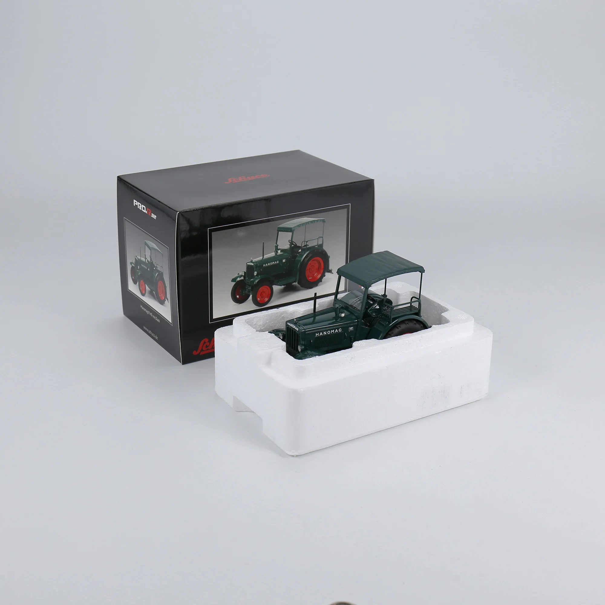 Experience the charm of vintage farming with this meticulously crafted Hanomag R 40 resin model featuring a roof. Made with durable metal, it exhibits a glossy deep green finish, accentuated by contrasting red rims on black textured tires. The rounded front hood with vertical grille slats and small round headlights provide authentic retro appeal. The sturdy rear wheels highlight rugged functionality while a lightweight, light-colored roof supported by thin black rods adds a delicate touch. This exquisite miniature captures intricate details such as the operator's seat, steering wheel, dashboard, and a small metal platform at the back. Perfect for collectors, this model brings an elegant, nostalgic slice of agricultural history into your space.