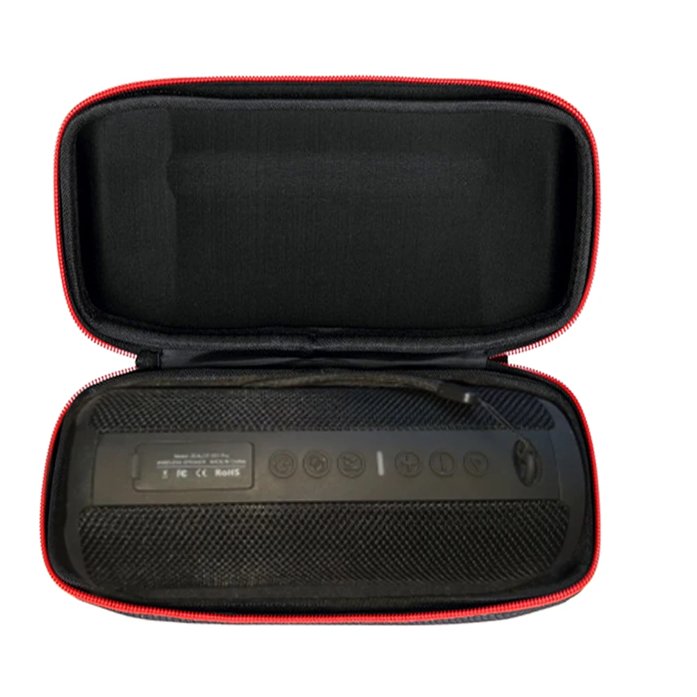 The hard EVA outdoor travel storage bag is expertly designed for the ZEALOT S51 Pro Bluetooth speaker. It measures 250mm in length, 125mm in width, and 95mm in height, with a net weight of 195g. The sleek black exterior features a stylish grid pattern and a striking red accent along the zipper. Built for protection, it is waterproof, shockproof, and dustproof, constructed from eco-friendly EVA material. The bag includes a durable carrying handle and an adjustable shoulder strap for convenience. A delicate yet sturdy double zipper ensures long-lasting usability, while the soft-lined interior prevents scratches.
