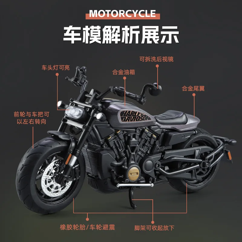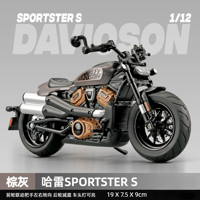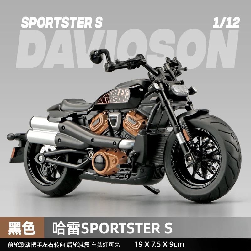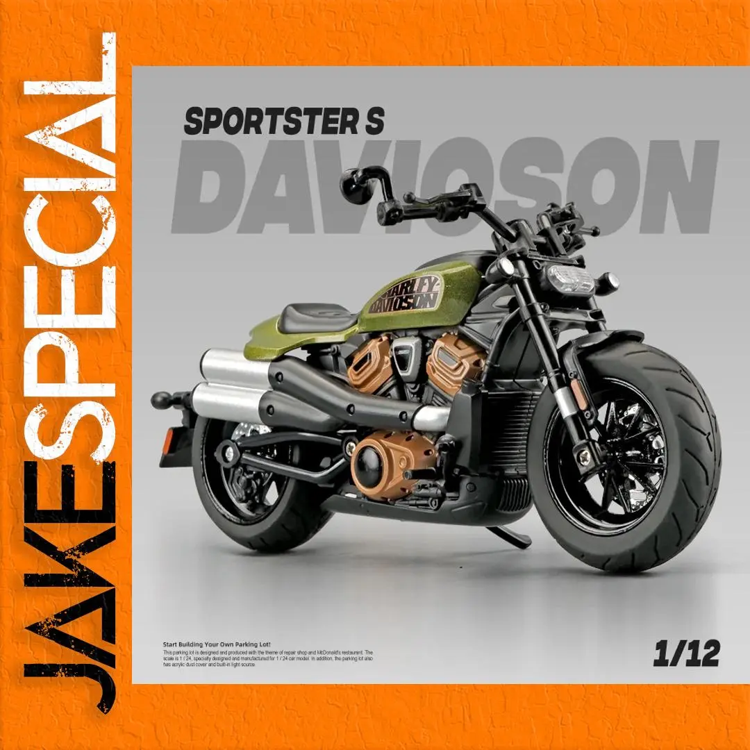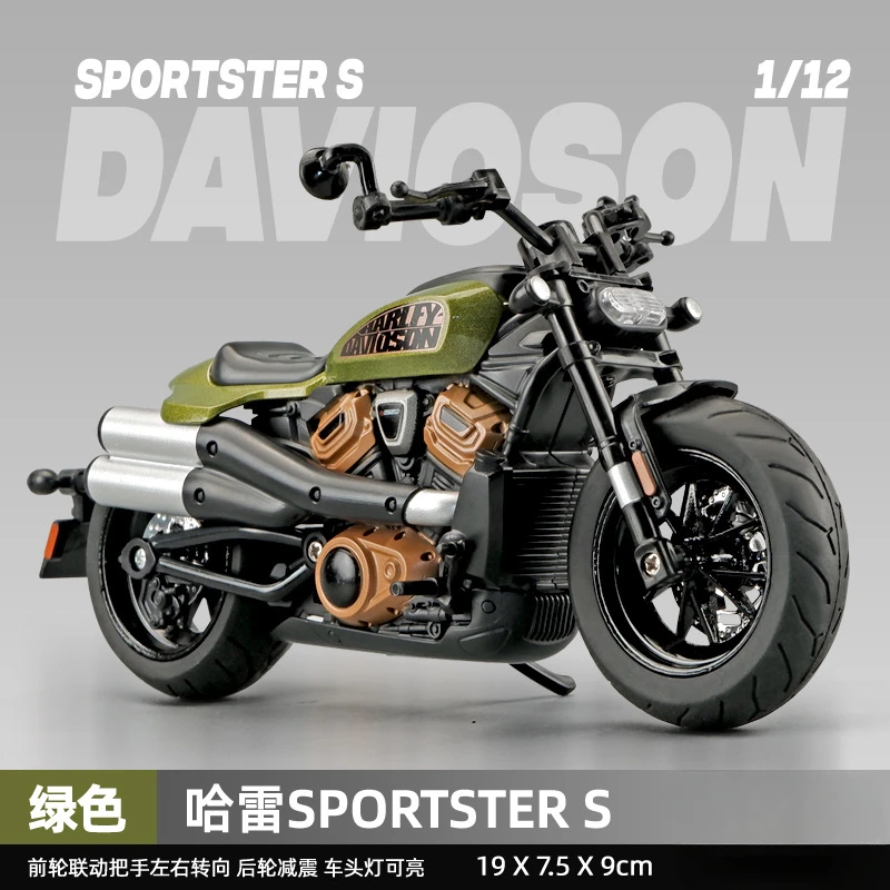 Introducing the 1:12 scale diecast metal alloy model of the Harley Sportster S, a stunning collectible designed for enthusiasts. Finished in a striking metallic green, this model features prominent “HARLEY DAVIDSON” branding, a robust black frame, and large chrome-accented exhaust pipes. The meticulously detailed engine includes gold and bronze parts, along with a sleek black seat and stylish black handlebars. Its realistic appearance is enhanced by large tires with pronounced tread patterns. This model incorporates sound and light effects, creating an engaging display piece, and it operates without the need for batteries, combining durability with eye-catching aesthetics.