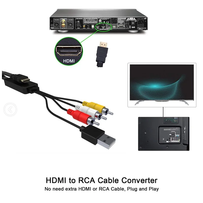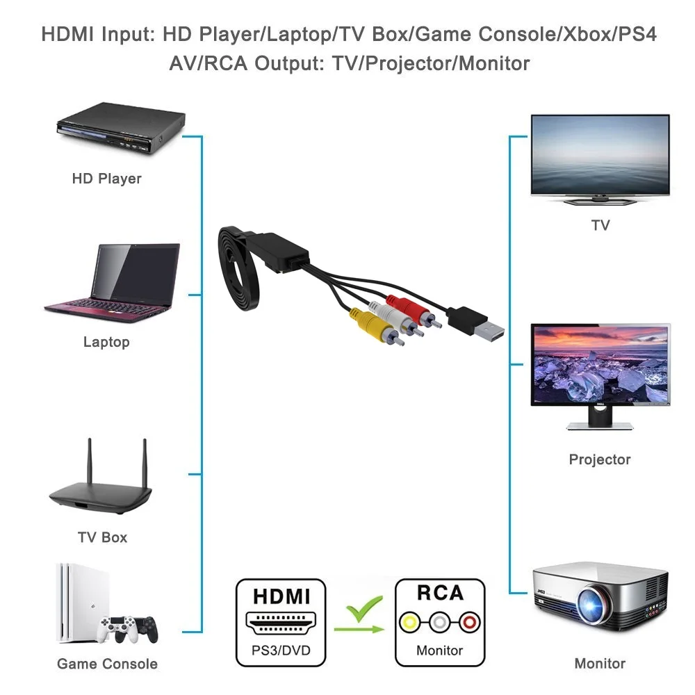 Experience effortless integration with this sleek HDMI to RCA adapter, designed to connect modern devices to older TVs and projectors. The compact, black, matte-finish main body features a stylish, minimalist look, highlighting simplicity and durability. With a length of 2 meters, the cable provides flexible setup options. The gold-plated HDMI male connector ensures superior signal quality, while the three RCA connectors—yellow for video, white and red for stereo audio—allow smooth transmission of high-definition video up to 1080p resolution with synchronized sound. Powered via a USB connection, this adapter requires no drivers and offers a straightforward plug-and-play experience. Its universal compatibility spans PCs, laptops, DVD players, gaming consoles, media streaming devices, monitors, and projectors, making it an essential tool for multimedia enthusiasts who want reliable performance and clarity.