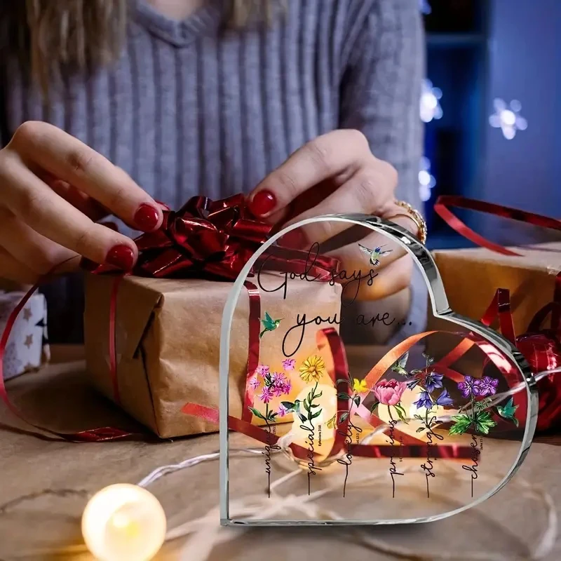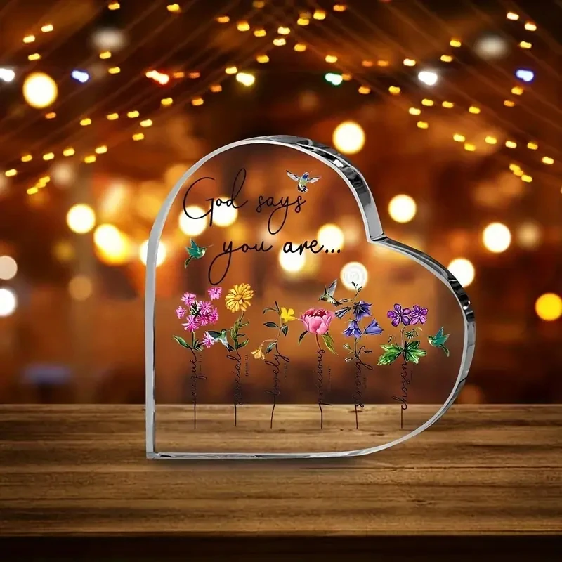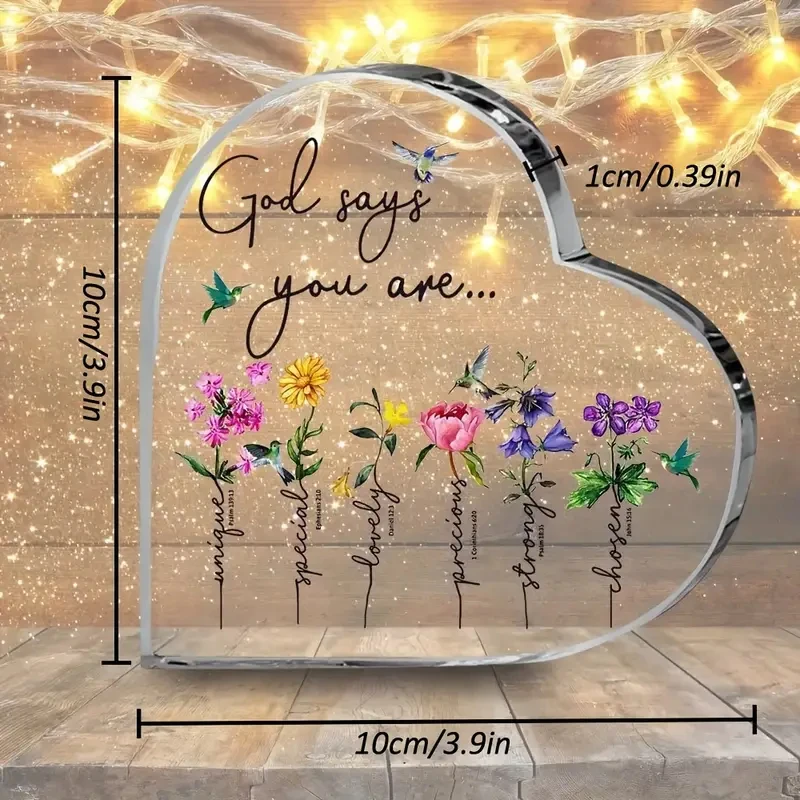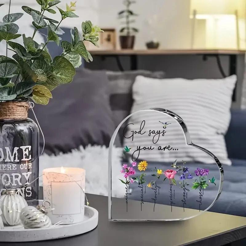 Imagine adding a touch of inspiration and elegance to your space with this stunning acrylic decor piece. Crafted from lightweight yet sturdy plastic, it features a smooth, polished surface that beautifully reflects light. Its symmetrical heart shape, with a rounded top and flat base, allows it to stand upright effortlessly on any desk or shelf. The front showcases a heartfelt Christian-themed message in elegant cursive and handwritten styles, reading “God Bless You” and “Thank You.” Vibrant floral illustrations, including purple, pink, yellow, and violet flowers with green leaves, are vertically aligned alongside the words, complemented by lively, colorful hummingbirds fluttering around. This decorative sign combines spiritual sentiment with cheerful floral artwork, making it perfect for celebrating faith, expressing gratitude, or elevating your office or holiday decor.