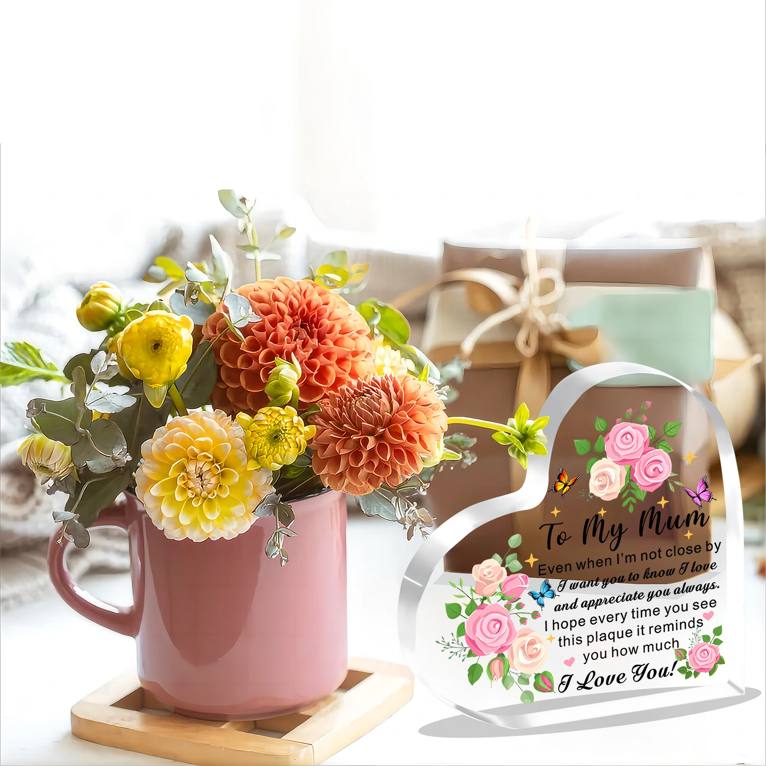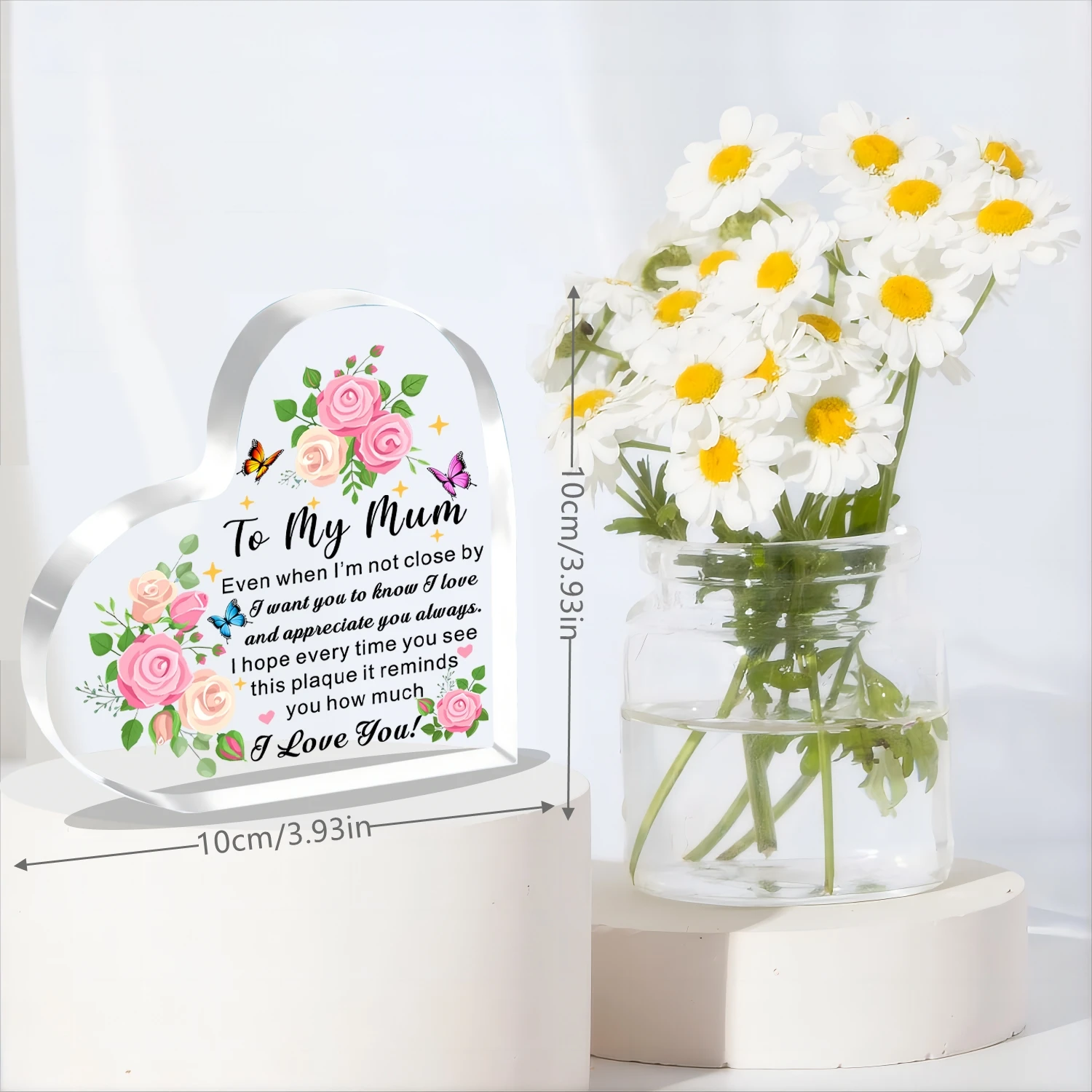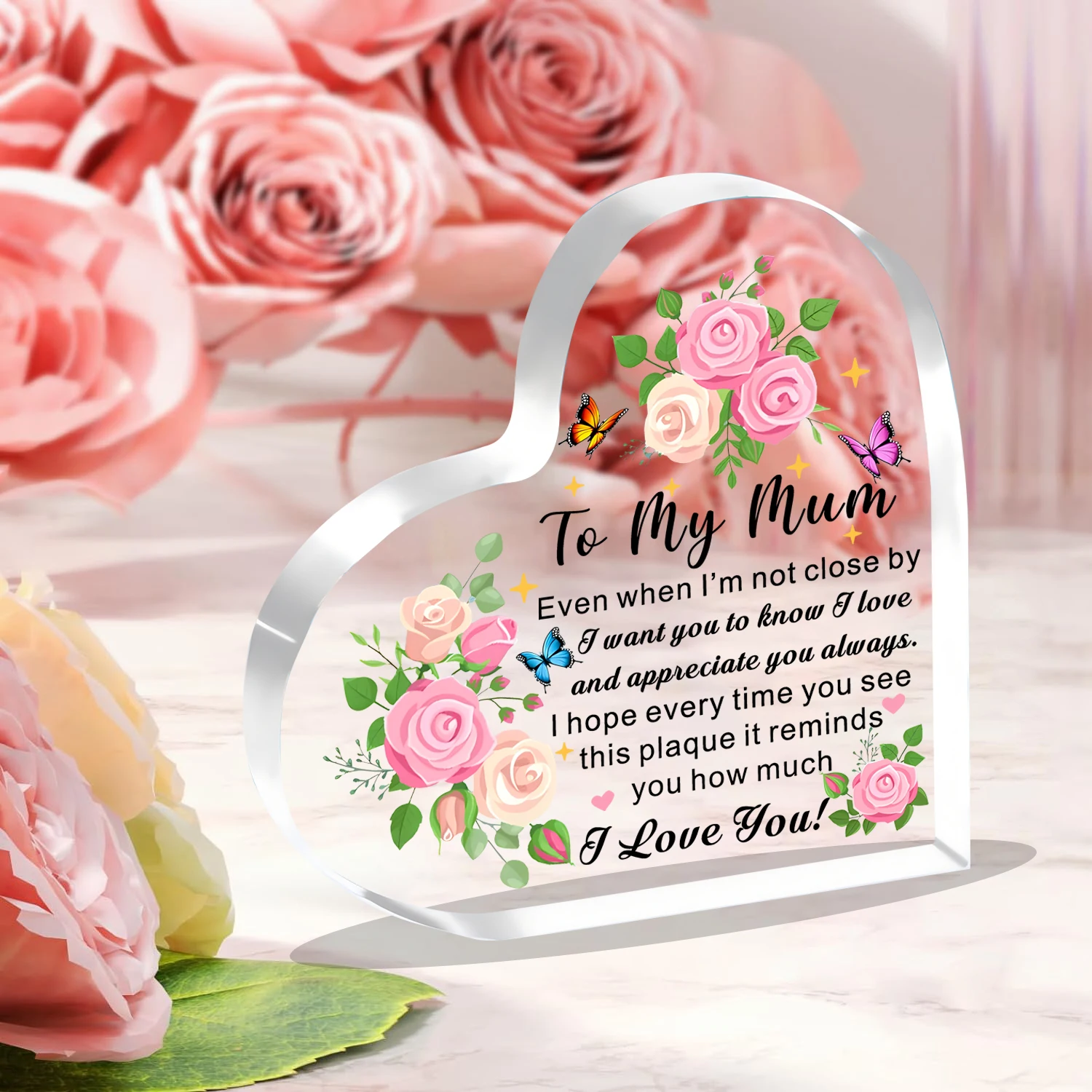 Imagine gifting this beautiful acrylic heart-shaped plaque to your beloved mother, capturing her heart with its vibrant design and heartfelt message. Crafted from clear, durable plastic, this plaque’s sleek, polished edges complement its transparent surface, making it an eye-catching decorative piece. Adorned with detailed artwork featuring pink and cream roses, lush green leaves, and tiny rosebuds, it evokes warm feelings of love and appreciation. Playful butterflies—orange, pink, and blue—flutter across the floral display, adding whimsy and liveliness. Scattered yellow star-like sparkles further enhance its celebratory aura. The heartfelt message, “To My Mum,” combined with loving words, makes this plaque perfect for Mother’s Day or any special occasion to remind her of your deepest affection.