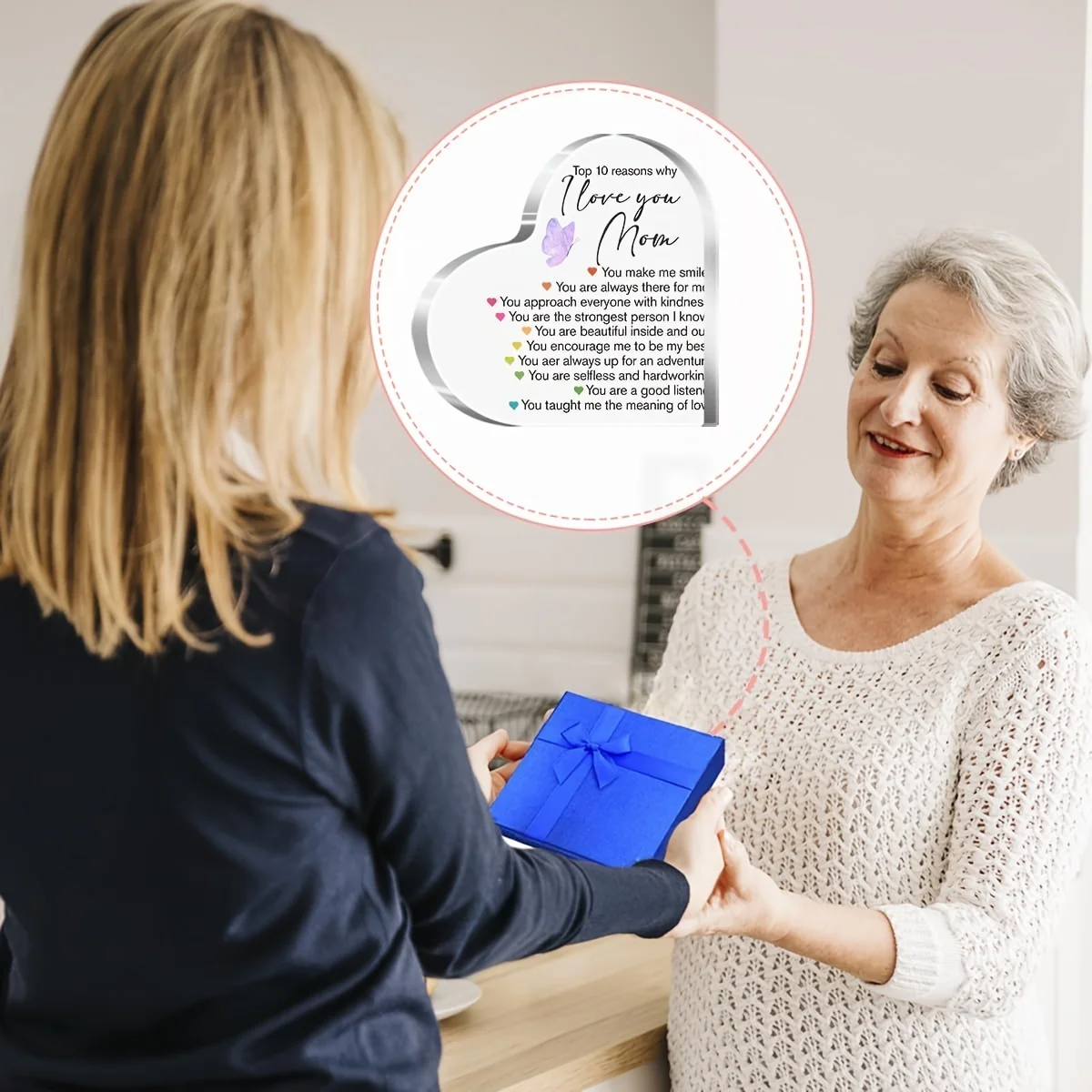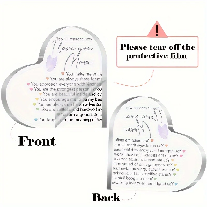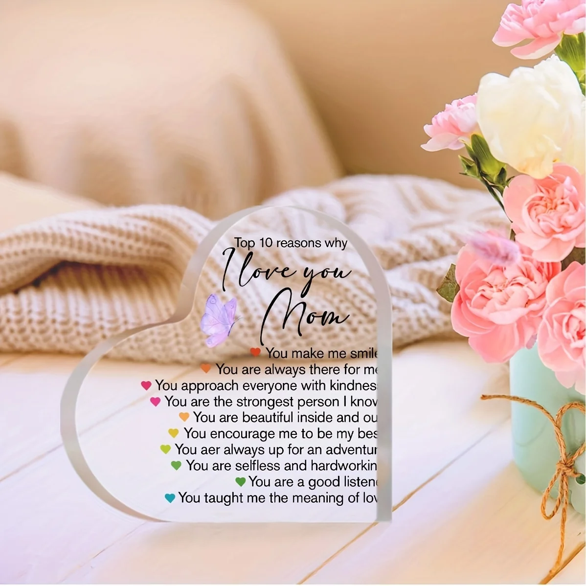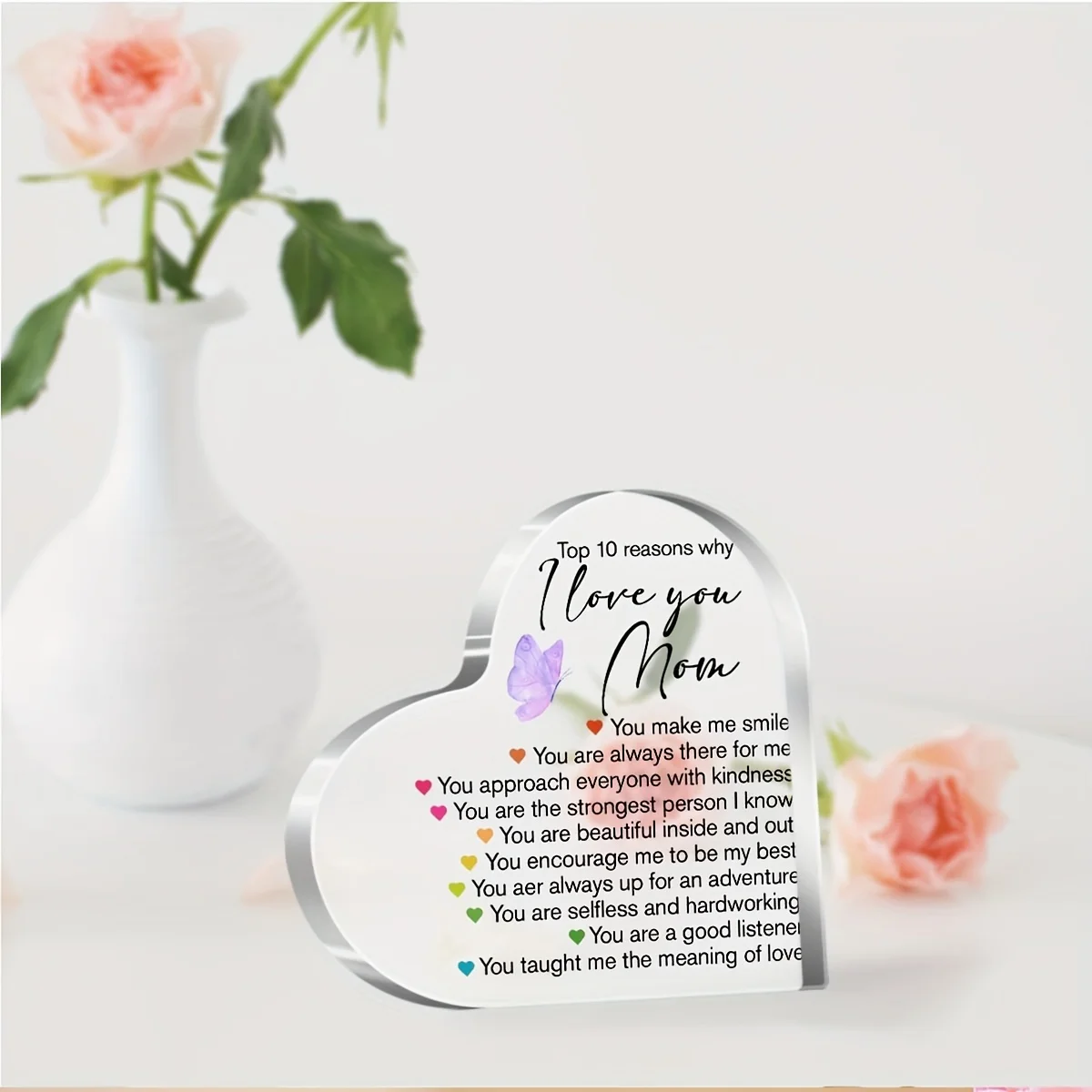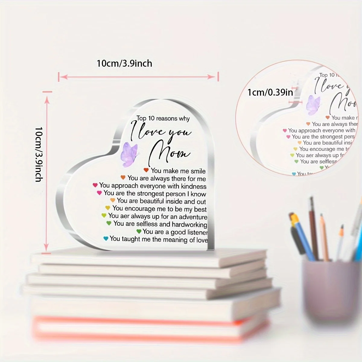 Imagine presenting this beautifully crafted acrylic heart sign to your mother — a heartfelt gift that celebrates your love and appreciation. The transparent design features an elegant, minimalist style, with the main message “I love you Mom” written in flowing, cursive font that radiates warmth and sincerity. Surrounding the message are vibrant, colorful heart-shaped icons in red, pink, orange, yellow, green, and teal, each representing one of the top ten reasons why you cherish her. A delicate purple butterfly embellishment adds a touch of whimsy and grace, making this sign a truly special keepsake. Perfect for Mother’s Day or any occasion, this piece captures your love in a simple yet meaningful way, turning everyday moments into lasting memories.