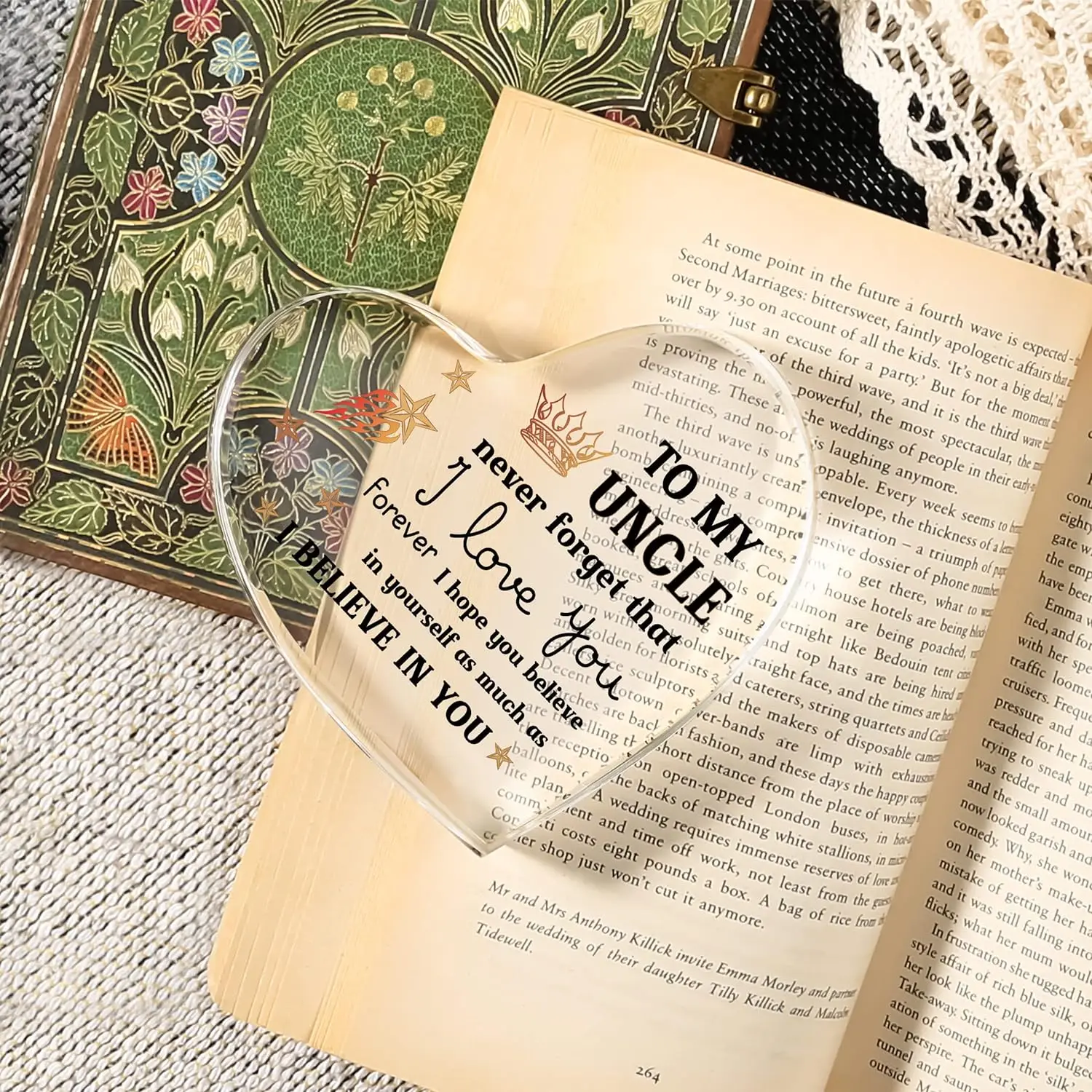 Imagine gifting this touching acrylic heart-shaped keepsake that beautifully combines elegance and warmth. Crafted from transparent, glossy plastic, it reflects light with a polished finish, creating an eye-catching display. The front features a heartfelt message, “TO MY UNCLE never forget that I love you,” complemented by a crown graphic outlined in reddish-brown. Surrounding the message are decorative stars in gold and reddish-brown, some outlined and some solid, with one star trailing fiery flames depicted with swirling reddish-orange lines. The design balances sophistication and a casual vibe, perfect for occasions like Father’s Day or as a token of appreciation. As you hold it in your hand, you can feel the smooth edges and luminous quality that evokes affection and encouragement. Imagine giving this gift to your special uncle, showing your love with a keepsake he will treasure forever.