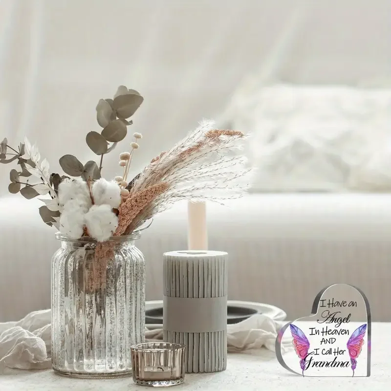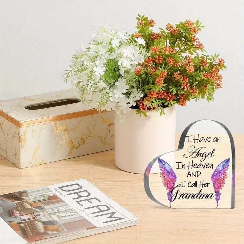 Imagine holding a heartfelt keepsake that beautifully symbolizes love and remembrance. This heart-shaped acrylic ornament features a smooth, glossy surface that gleams with elegance, making it perfect for displaying somewhere special. Its transparent and sleek design offers durability for both indoor and outdoor placement, ensuring your cherished memories are always visible. The tender inscription, “I Have an Angel In Heaven AND I call Her Grandma,” is complemented by vibrant butterfly illustrations in shades of purple, pink, and orange, adding a touch of gentle color and delicate charm. Rounded, beveled edges give it a polished, modern look that resonates with warmth and sophistication, allowing your heartfelt message to be beautifully showcased in any setting.