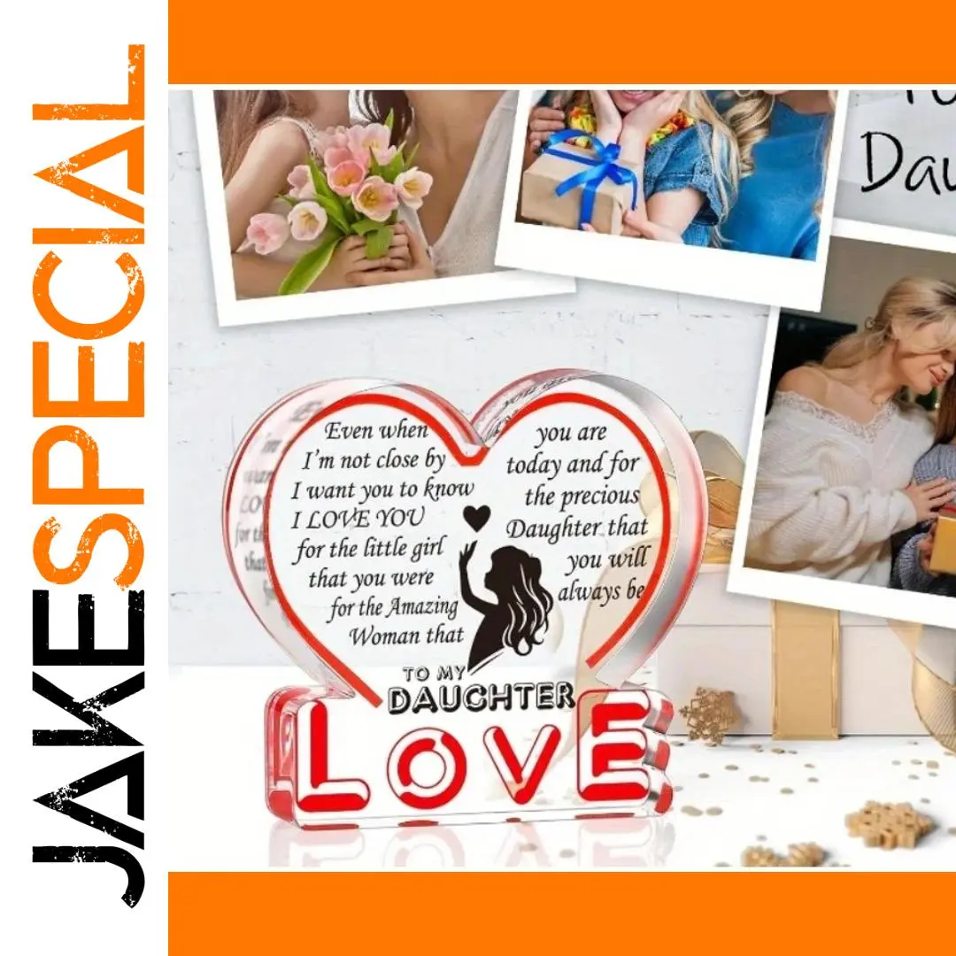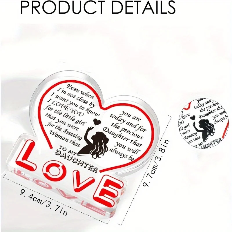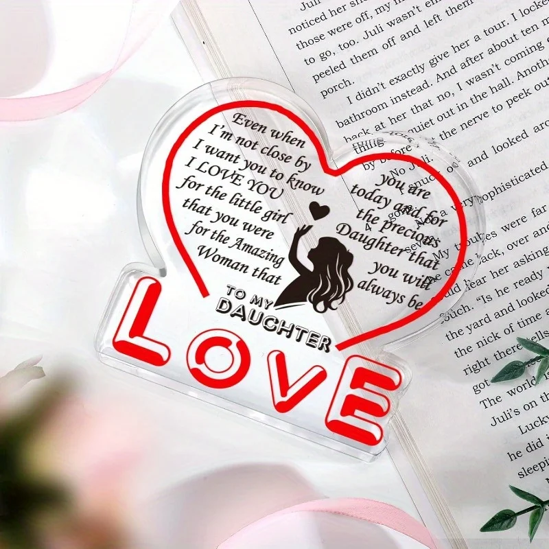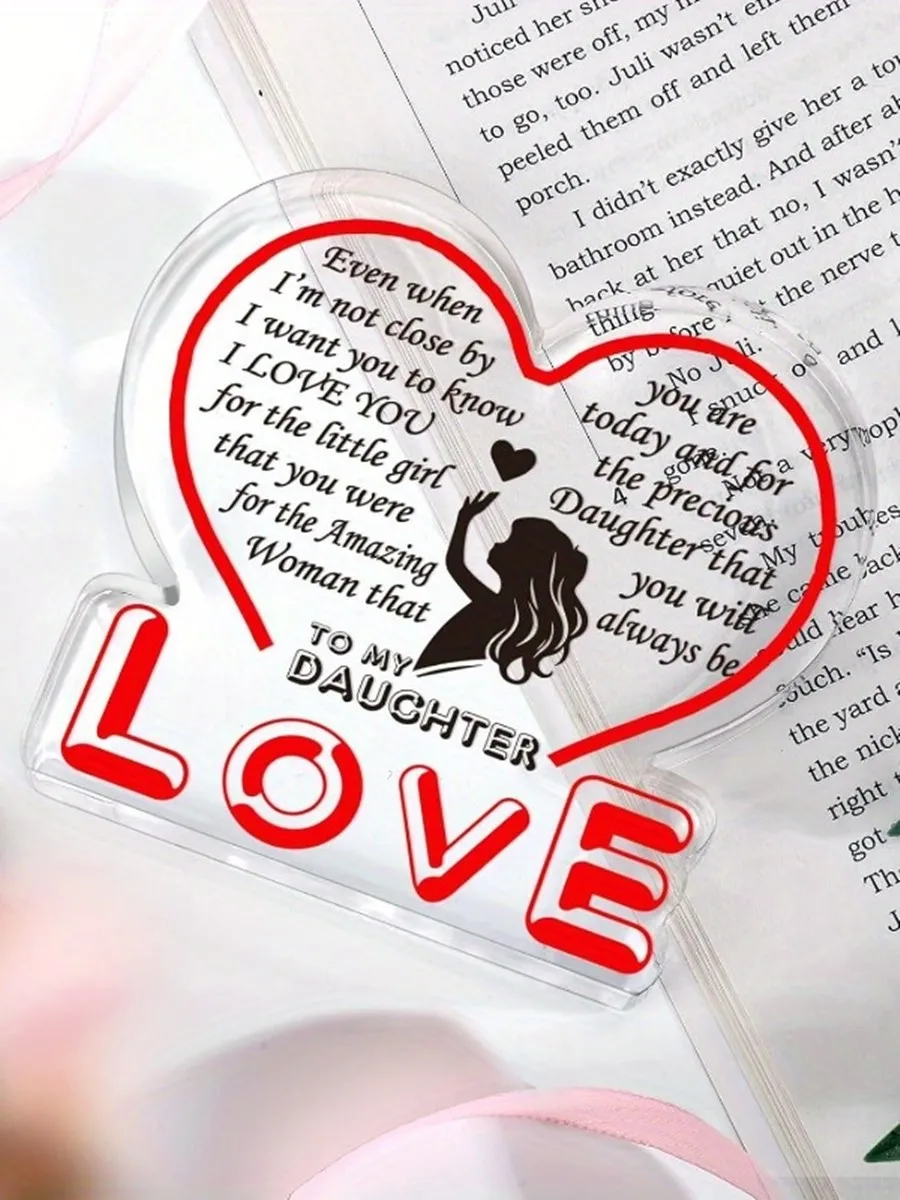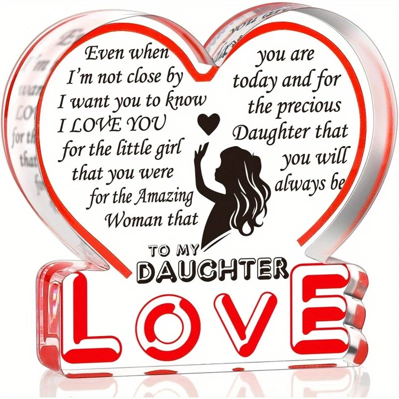 Imagine gifting this beautiful acrylic plaque to your daughter, a keepsake that expresses your love and appreciation in a stylish, touching way. Crafted from durable, glossy plastic, this heart-shaped design radiates warmth and elegance, making it perfect for birthdays, Christmas, or special anniversaries. The transparent surface allows the vibrant printed message to stand out, featuring a silhouette of a girl with long flowing hair, and the bold red “LOVE” with its heart-shaped “O” adds a lively pop of color. The red outline tracing the heart shape completes the look with a refined, modern touch. Whether displayed on a desk or carried as a sentimental token, it’s a perfect gift to remind her of your love every day.