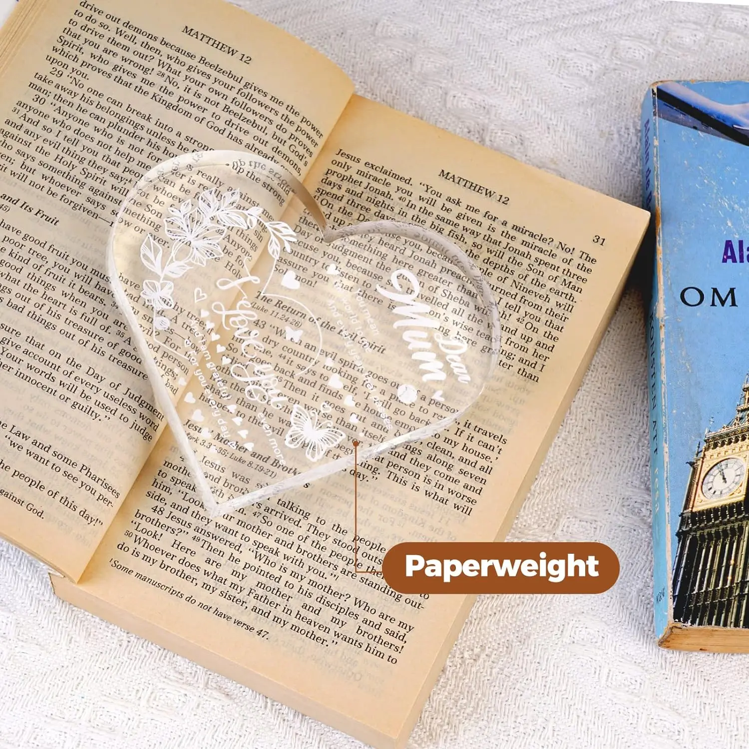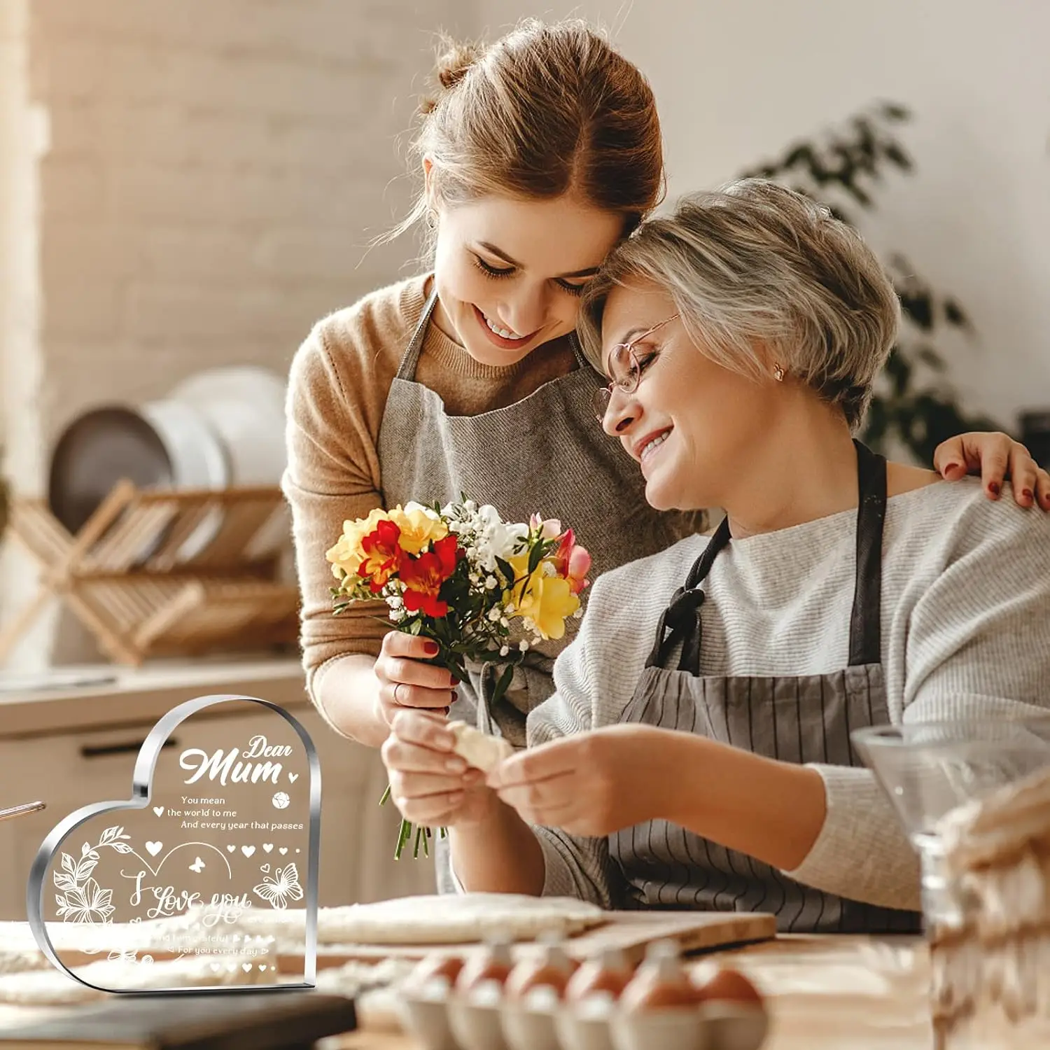 Imagine gifting this beautiful, personalized heart-shaped plaque that perfectly captures your love and appreciation for your mum. Crafted from high-quality clear plastic with a glossy finish, this keepsake features a smooth, symmetrical heart shape that radiates elegance. The engraved design includes heartfelt messages like “Dear Mum,” “Love you,” along with delicate motifs such as small hearts, butterflies, and floral patterns, creating a warm and personal feel. The engraved text combines graceful cursive and standard fonts, with some words accentuated to enhance sentiment. Suitable for display on a stand, this sleek, timeless decorative piece serves as a lasting reminder of your affection, making it an ideal gift to preserve your special bond.
