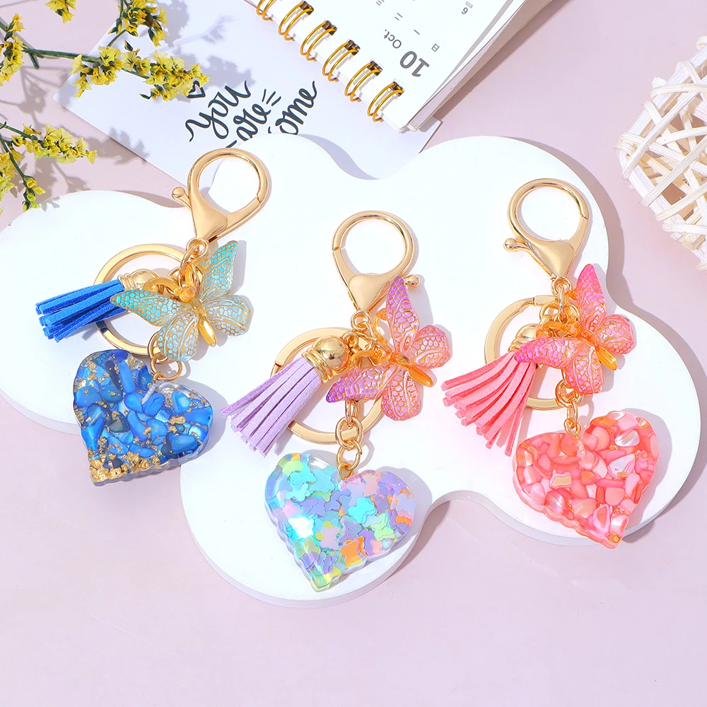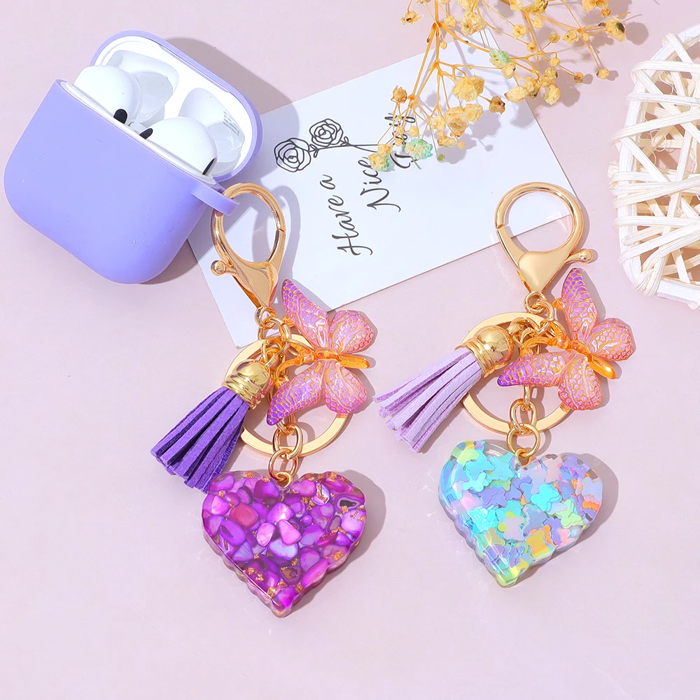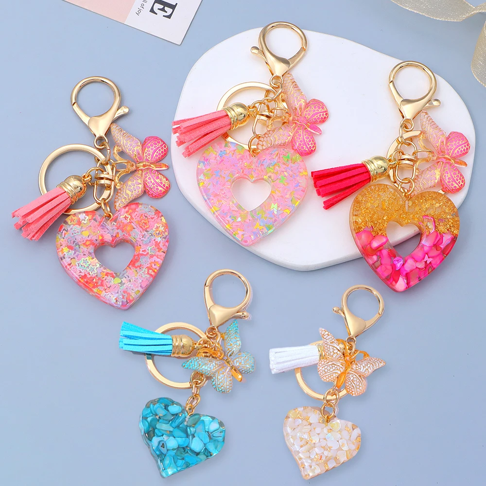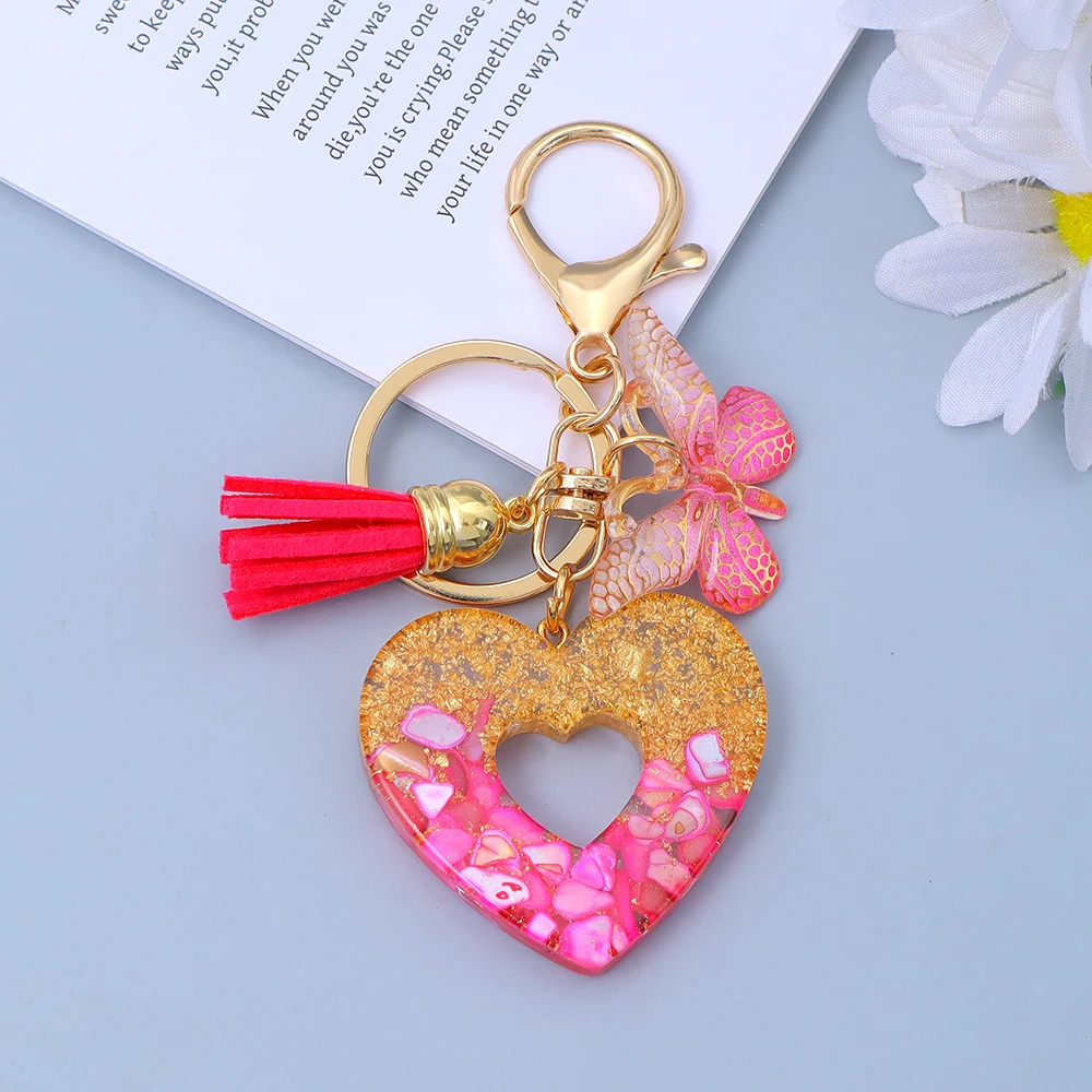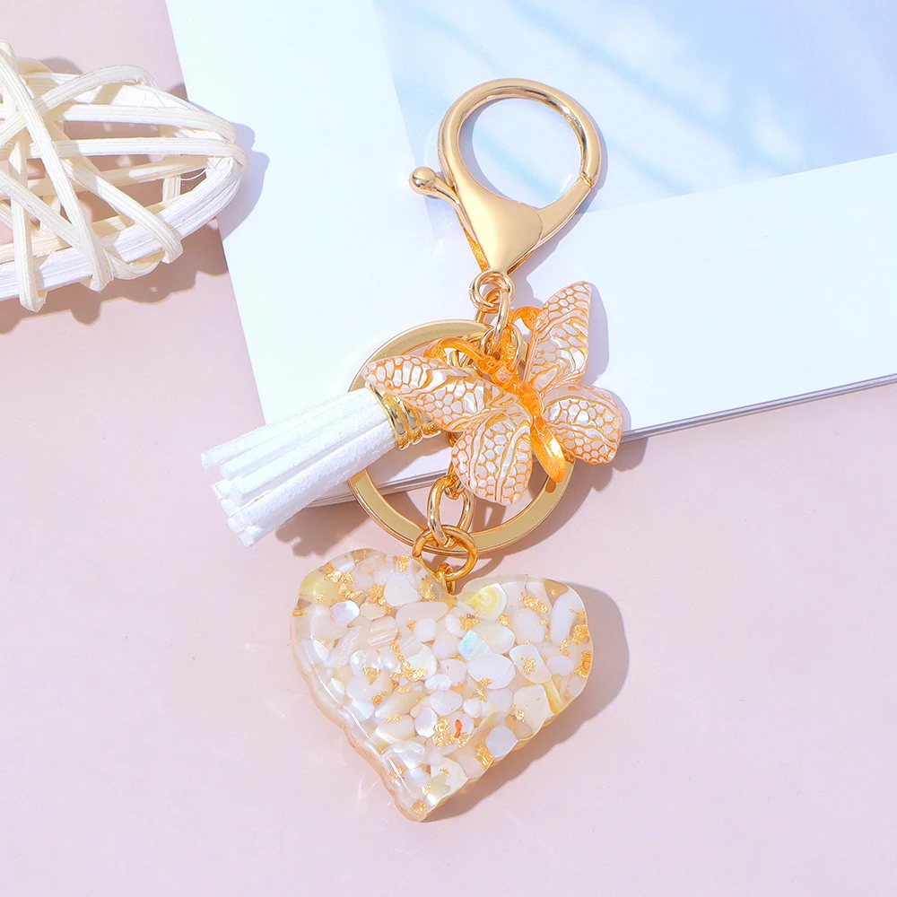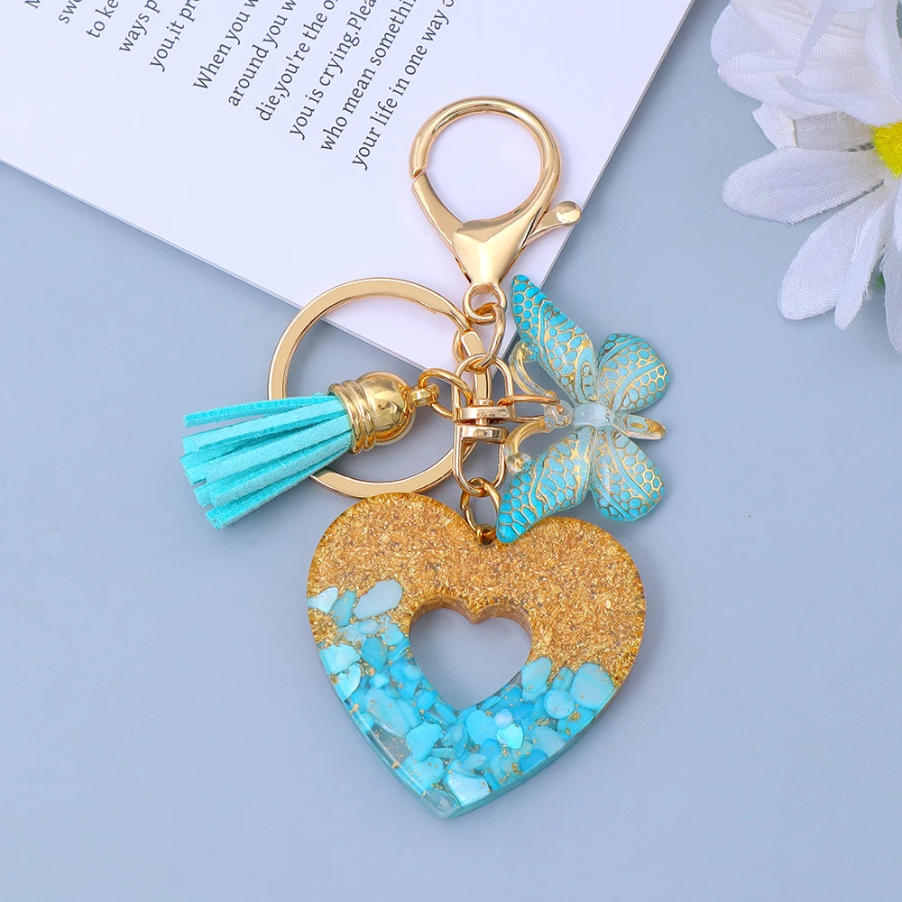 - Technical specifications: Resin body, zinc alloy connectors and rings, champagne gold finish, lobster clasp attachment, heart-shaped design, detailed butterfly and tassel embellishments.