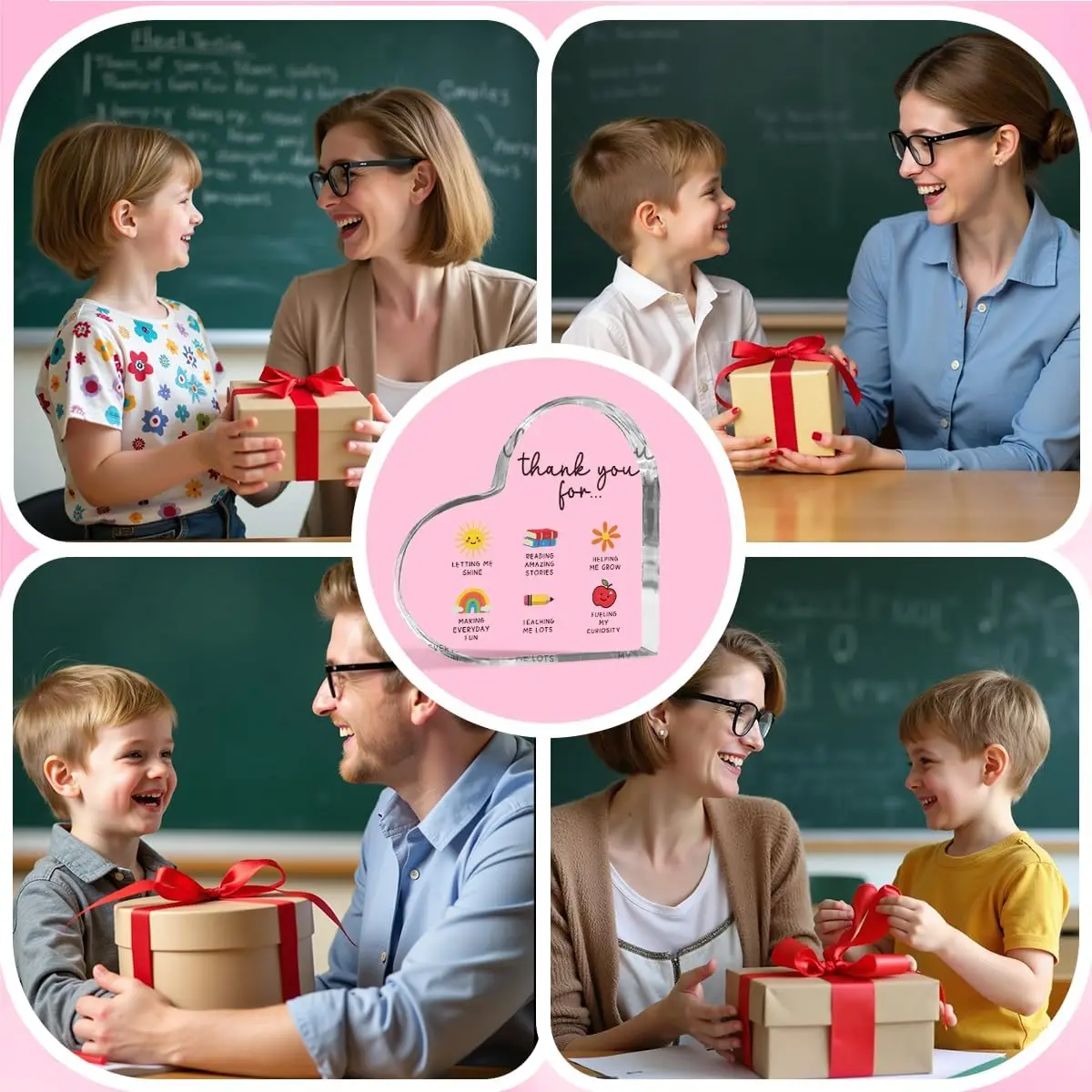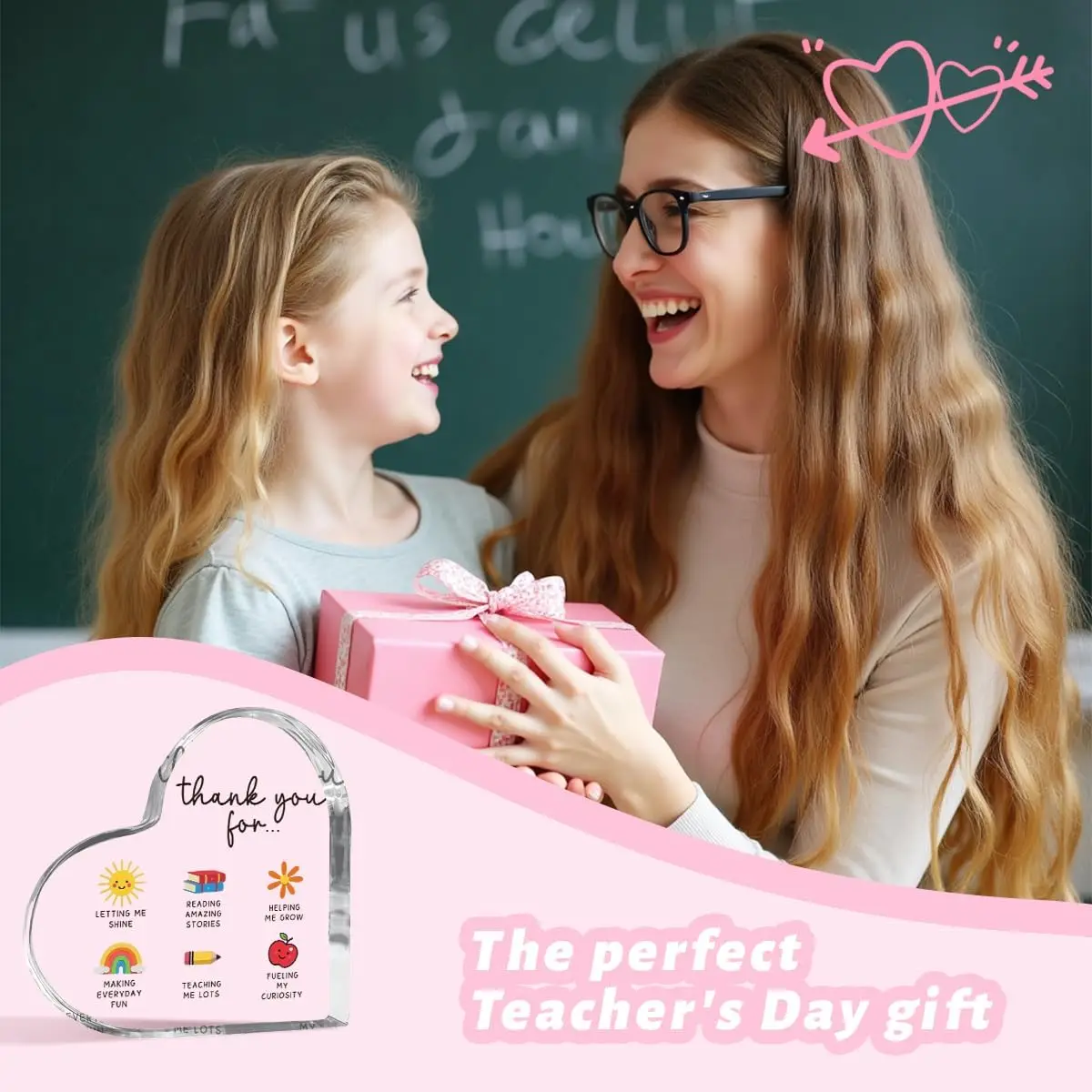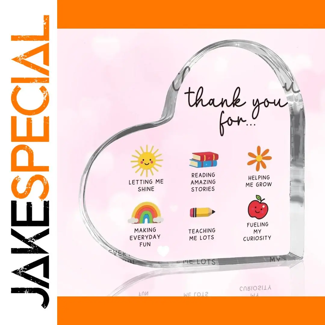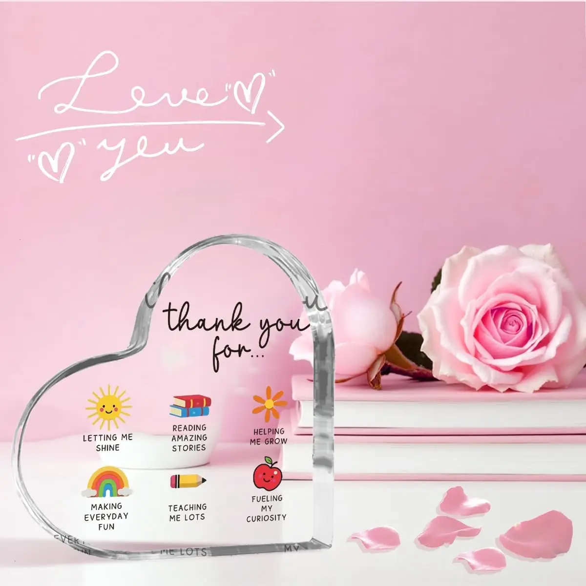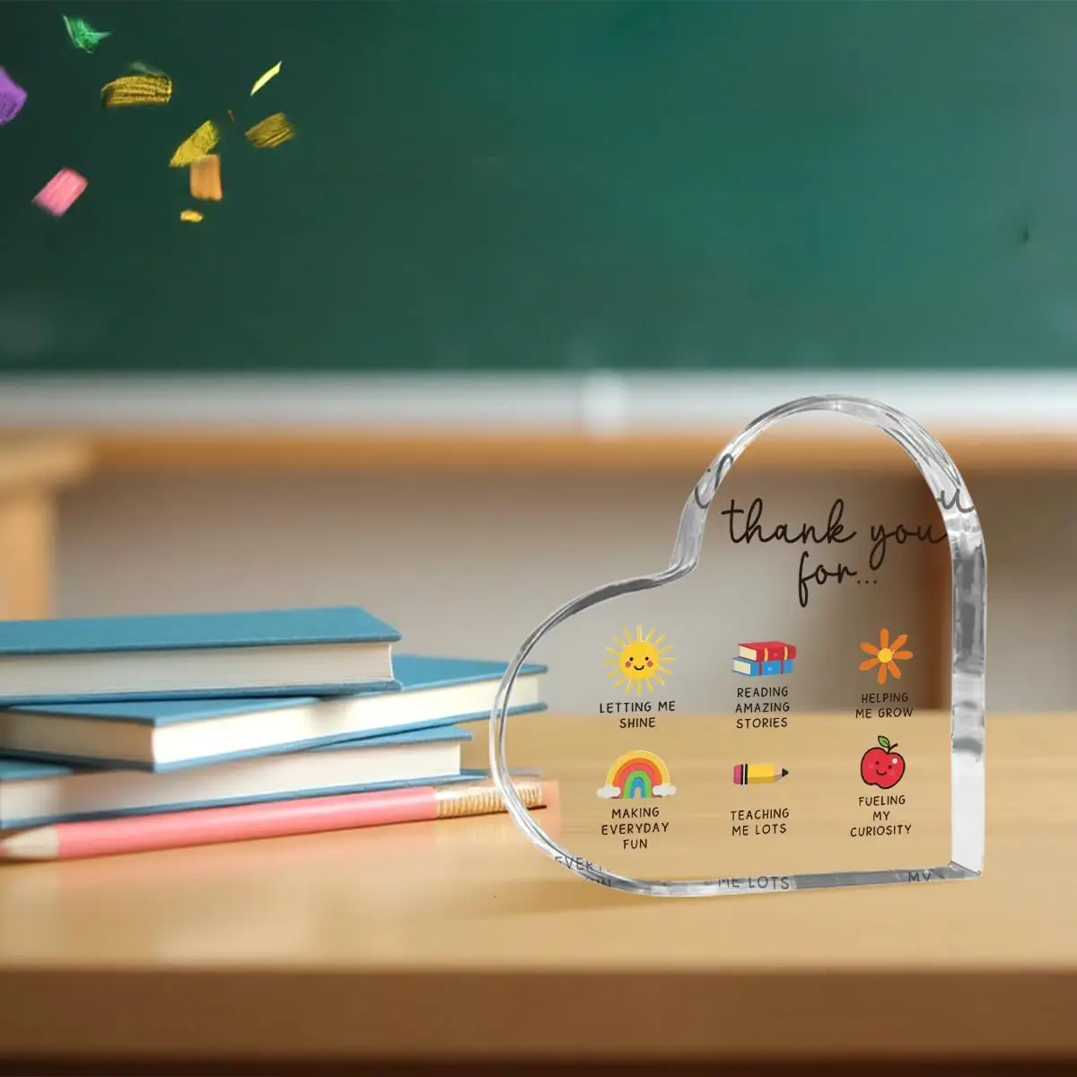 Imagine expressing your gratitude with this charming, heart-shaped gift plaque that combines vibrant design and heartfelt sentiment. Crafted from durable, lightweight plastic, it features a sleek, glossy finish that captures light beautifully, making it perfect for brightening up any workspace or home. The front showcases cheerful cartoon-style illustrations, including a smiling sun, colorful stacked books, an orange flower, a rainbow with clouds, a yellow and red pencil, and a friendly red apple with a leaf—all arranged vertically beside handwritten-style “thank you for…” wording. Faint decorative text along the edges adds a delicate touch of charm. Whether for a teacher, mentor, or colleague, this acrylic plaque radiates warmth and appreciation, making every gift memorable and special.