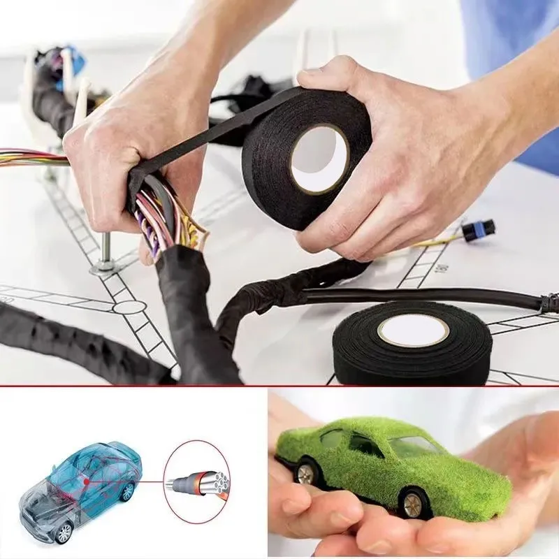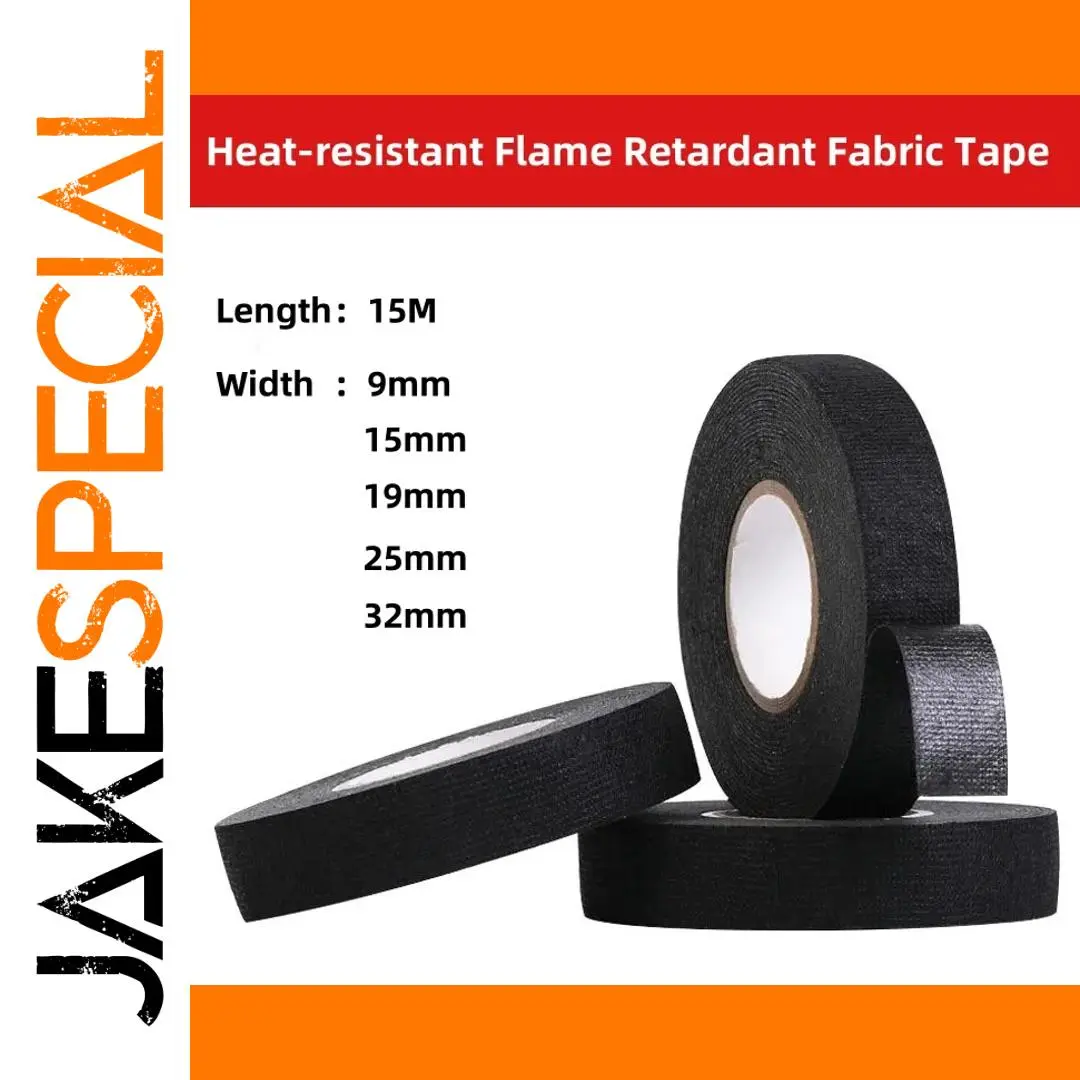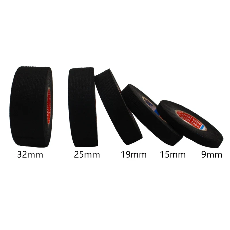 This this heat-resistant flame retardant cloth tape is designed to provide reliable insulation and protection for electrical wiring in high-temperature environments. Crafted from soft, textured black flannel, it offers excellent flexibility and conformability around wiring harnesses. Each roll is 15 meters long, with width options of 9mm, 15mm, 19mm, 25mm, and 32mm, catering to various application needs. Its reinforced adhesive ensures a secure bond that resists corrosion and wear while maintaining excellent adhesion over time. The tape's utility extends to waterproof, anti-aging, shock absorption, and noise reduction properties, making it ideal for electrical applications in automotive, industrial, or technical settings. Its robust construction guarantees durability and safety even under demanding conditions, ensuring your wiring remains protected and well-organized.