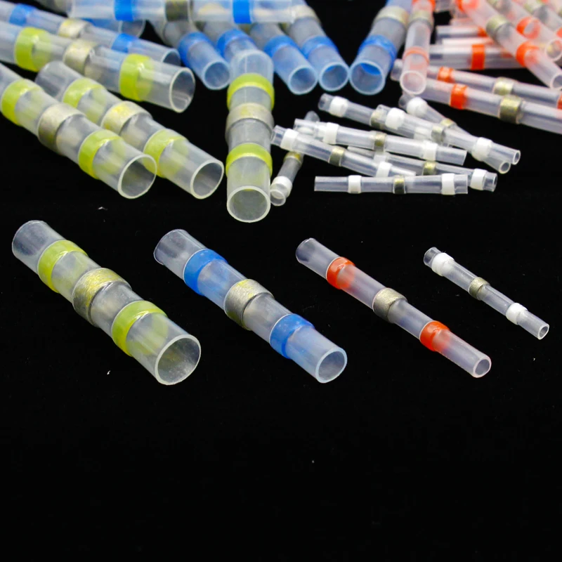 - Each connector features a cylindrical shape with a metal crimp area covered by transparent plastic, ensuring a secure, insulated connection for various wire gauges.
