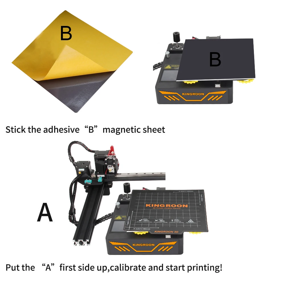 Elevate your 3D printing experience with this flexible magnetic sticker designed for hotbeds. Available in sizes of 180x180mm, 235x235mm, and 310x310mm, this product ensures optimal adhesion for your first layer while making the removal of completed prints remarkably simple. The sleek black surface features a textured finish and a clear grid for accurate alignment, with directional arrows indicating the “X axis” and “Y axis.” The noticeable brand name “KINGROON” in vibrant orange adds a touch of style, making these magnetic stickers not just functional but visually striking. Perfect for various 3D printer models, including KP3S, Ender 3, and CR10, it’s the ultimate companion for all printing enthusiasts.