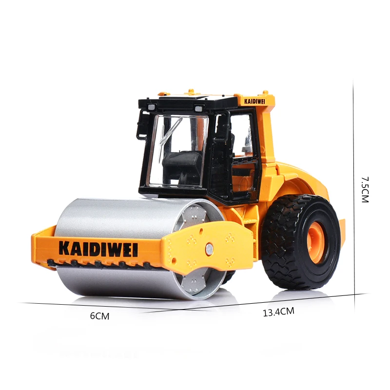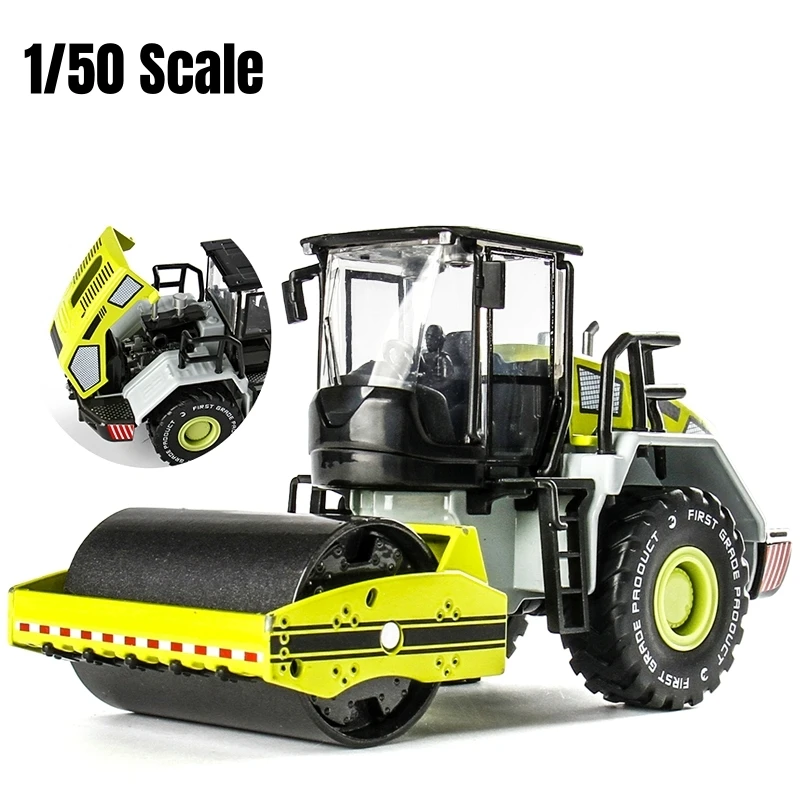 - Made from durable metal with textured roller drums, sculpted lines, transparent windshields, and molded tires with textured treads for rugged realism.