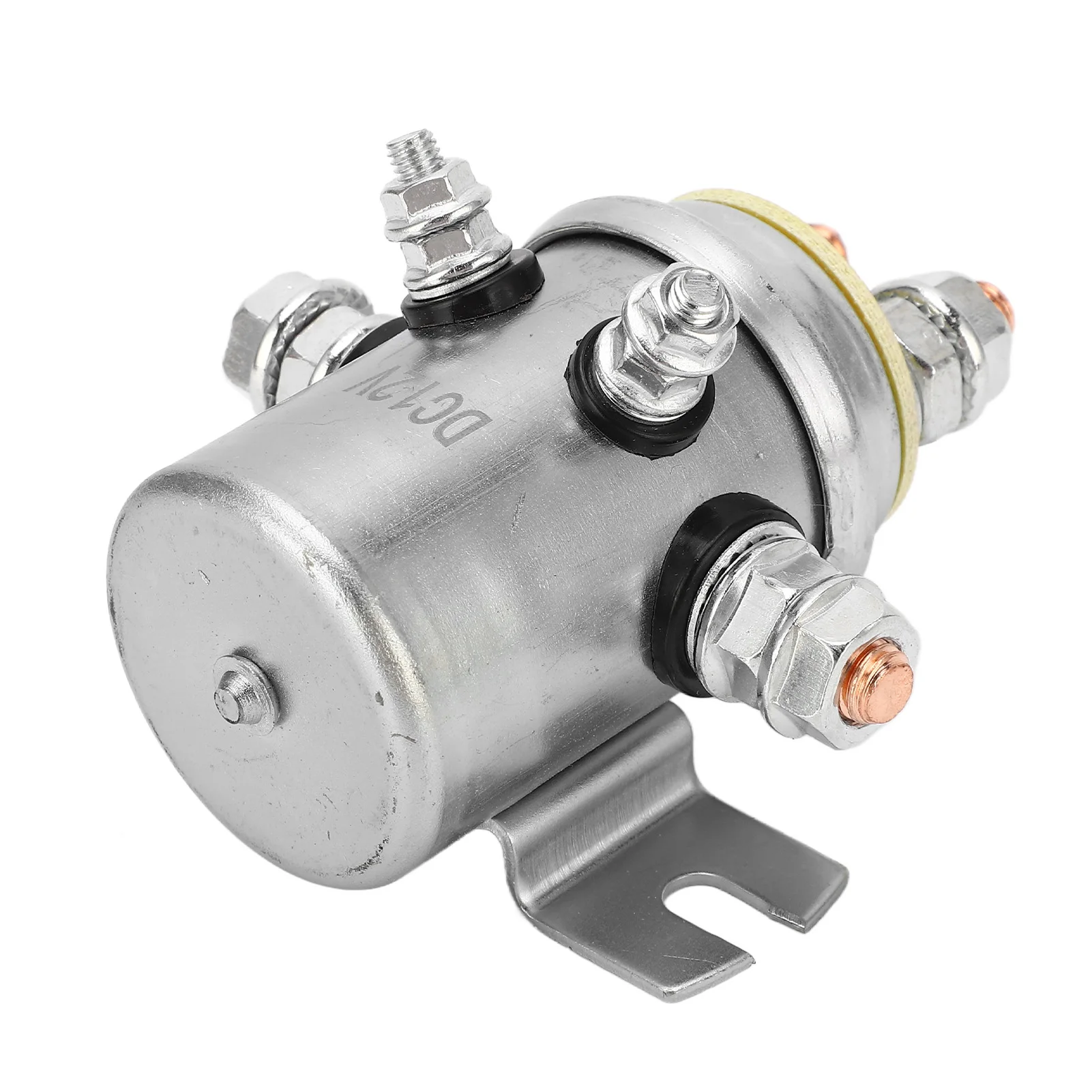 Experience reliable power switching with this high-capacity electric winch relay. Designed for outdoor adventures and heavy-duty tasks, it features a sleek metallic silver cylindrical housing with a matte finish, ensuring durability and a professional look. The shiny copper connectors provide excellent conductivity, while a vibrant yellow gasket offers sealing and insulation. Built to withstand harsh conditions, this relay's sealed, one-piece molded ABS housing is flame retardant, enhancing safety. With a brass coil enabling quick motor starts and a current capacity of 300A at 12V, it ensures stable, high-performance operation. Its rugged construction makes it ideal for off-road vehicles, snowmobiles, garden tractors, and utility applications, providing peace of mind in critical moments.