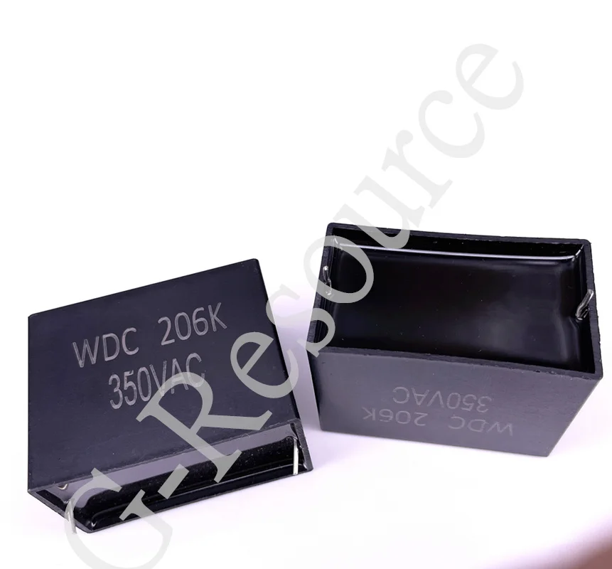 This high-quality, new film capacitor features a sleek black rectangular design with a smooth matte finish, ideal for air conditioning and refrigeration systems. Rated for 350VAC, it offers capacitance values of 106K (106,000 pF), 156K (156,000 pF), and 206K (206,000 pF). Available in models such as 106K P 37.5mm, 106K P 45mm, 156K P 45mm, and 206K P 45mm, with compact dimensions of 37.5mm or 45mm in size. Its minimalist, professional appearance, combined with precise technical specifications, makes it a reliable and efficient internal component for heavy-duty electrical appliances.