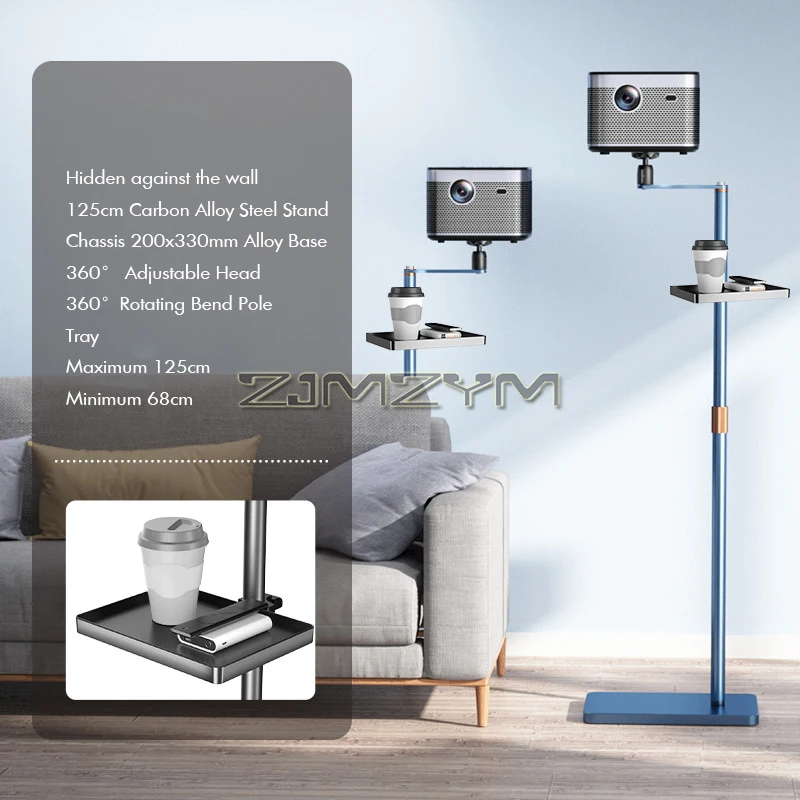 Experience professional versatility with this heavy-duty projector stand crafted from durable carbon steel, featuring adjustable height and tilt angle for optimal positioning. Designed for stage, studio, and office environments, it includes a convenient storage tray for remote controls, cables, or accessories. Available in standing and hidden configurations, the stand’s sleek, modern design highlights a metallic blue cylindrical pole complemented by black components and subtle copper or bronze accents. Its broad, stable black base ensures safety during use, making it the perfect accessory for professionals seeking a reliable, functional, and aesthetically appealing solution to enhance their presentation or projection setups.