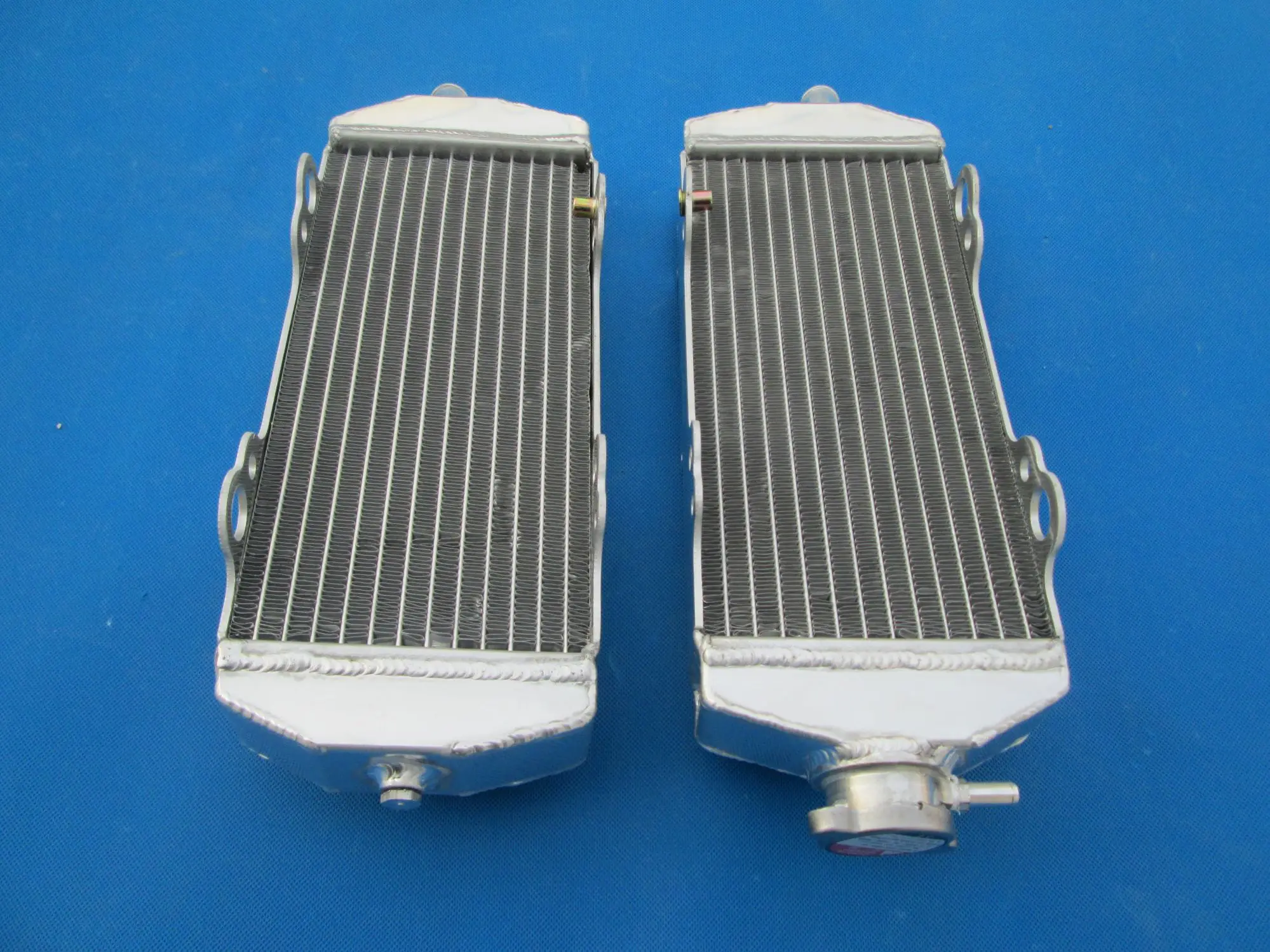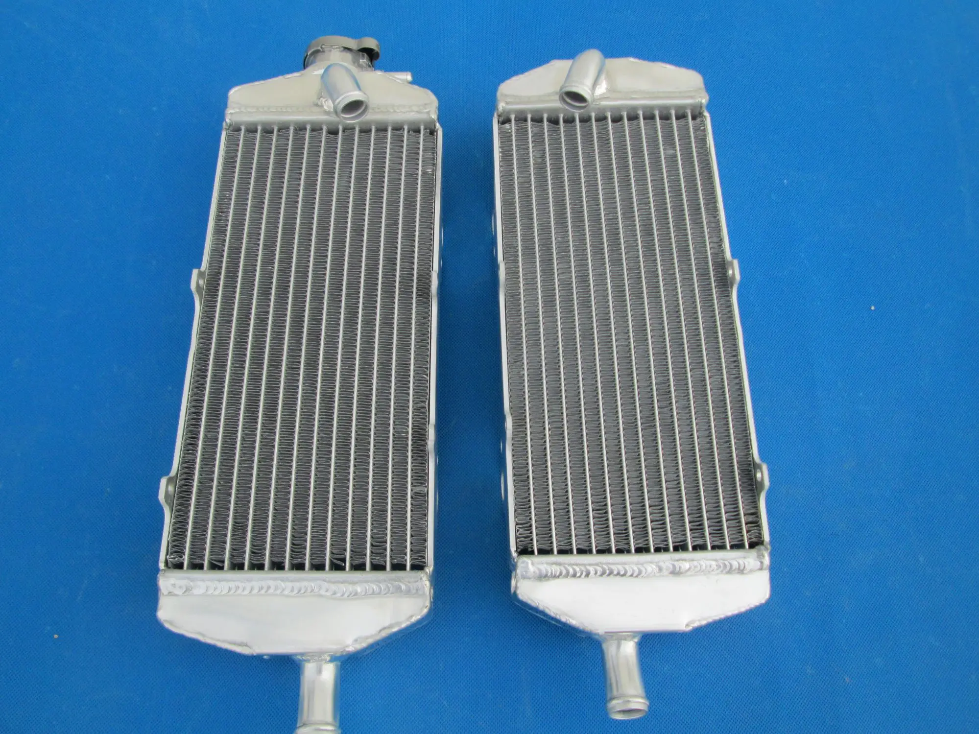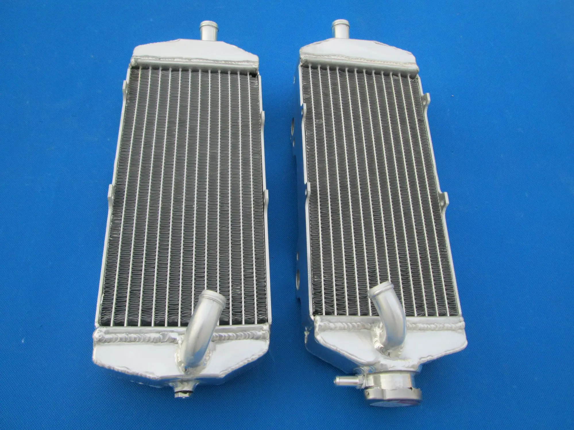 Experience a significant upgrade in your KTM's cooling system with this pair of high-performance aluminum radiators, designed specifically for 2003-2006 models including 560 SMR, 450 SMR, 525 SMR, 450 SX, and 525 SX. Crafted from lightweight yet robust T-6061 aluminum, they feature a sleek, metallic silver finish that enhances your bike’s aesthetic. The core's thin, horizontal fins facilitate efficient heat dissipation, while the solid, TIG-welded tanks ensure durability and leak-proof operation. One radiator includes a slightly angled inlet/outlet pipe for easier hose connection, and a drain plug at the bottom for maintenance. These radiators provide about 40% more cooling capacity than standard OEM parts, helping your engine run smoothly under demanding conditions. Their heavy-duty construction guarantees resilience and long-lasting performance on the trail or track.