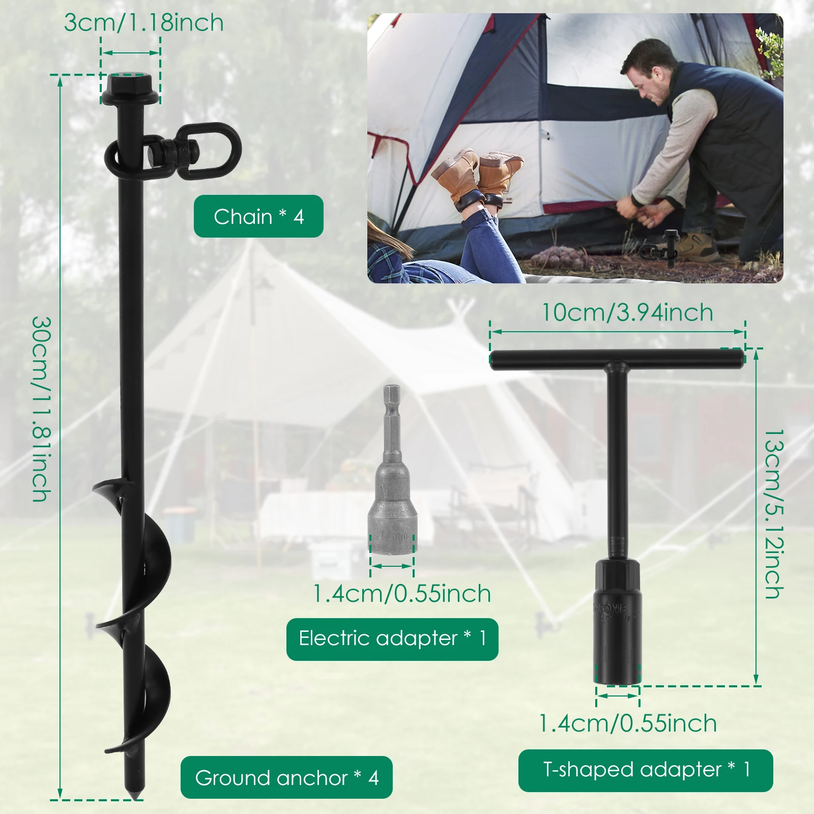 Experience peace of mind with this set of four heavy-duty black steel ground anchors, designed to secure outdoor structures firmly. Each anchor measures approximately 30 centimeters long and 3 centimeters in diameter, featuring a spiral tip for effortless soil penetration in various ground types, including sandy and hard soils. Constructed from rustproof steel, these anchors withstand harsh weather conditions, tested to resist winds up to 50 mph. The set includes four steel chains, a T-shaped adapter measuring 10×13 centimeters with a 1.4-centimeter interface, and an electric adapter of the same diameter, making installation quick whether manually or with a drill. Versatile and reliable, they are perfect for trampolines, tents, fences, and more, ensuring your outdoor setup stays secure.