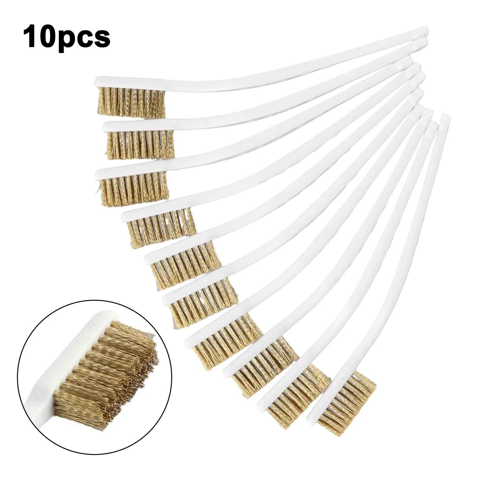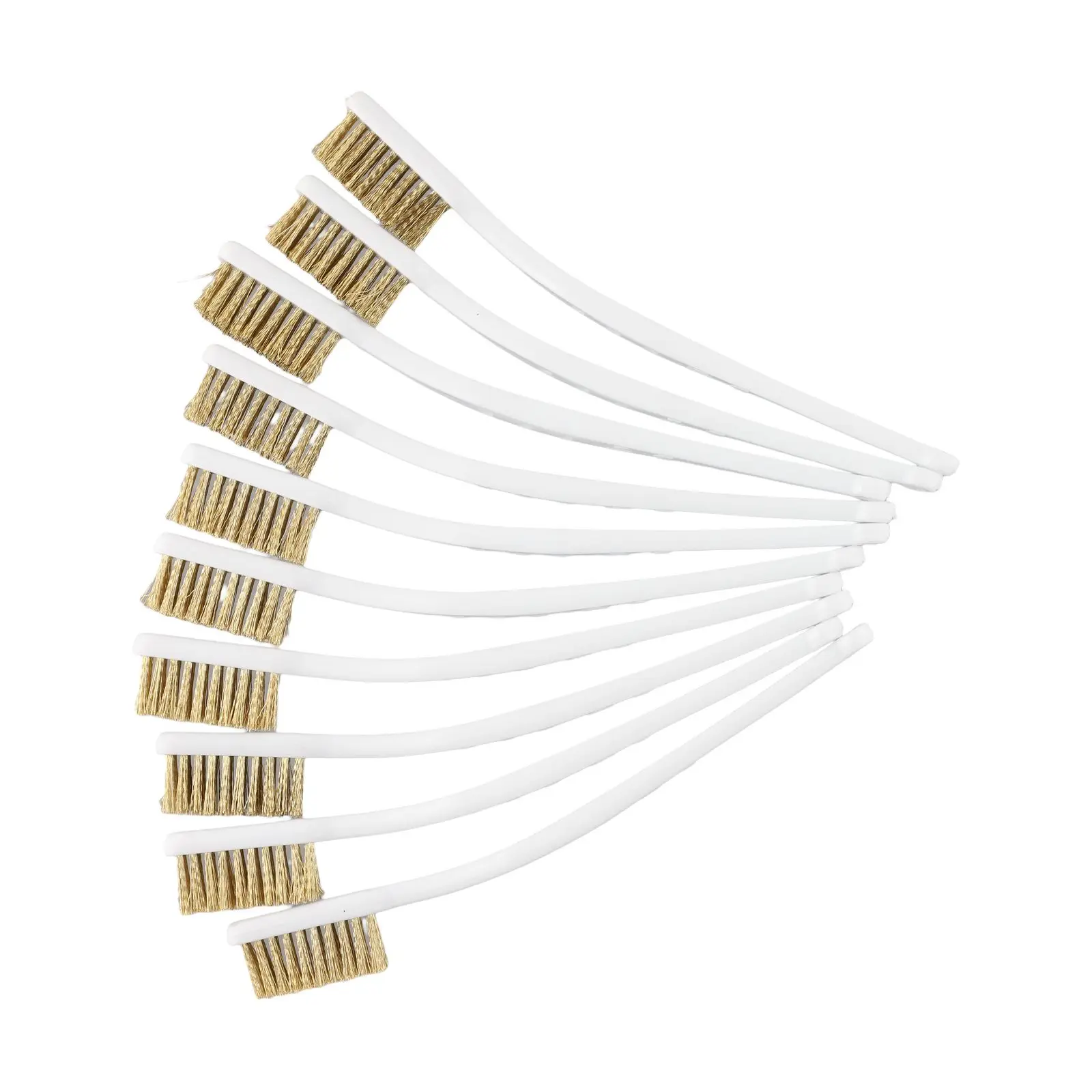 Experience the reliability and efficiency of this set of ten high-quality brass wire brushes, perfect for tackling tough cleaning tasks across various industries. Each brush features a sleek white plastic handle with an ergonomic curve, ensuring comfortable grip and control during use. The shiny, gold-colored brass wires are densely packed and precisely cut to maximize scrubbing power, making rust removal, machine polishing, and decontamination effortless. With a length of approximately 170mm-180mm (6.69-7″), these versatile tools are suitable for use on metal surfaces, barbecue nets, kitchen utensils, and more. Designed to withstand heavy-duty tasks, they combine durability with a professional aesthetic suitable for industrial, automotive, shipbuilding, and construction applications.