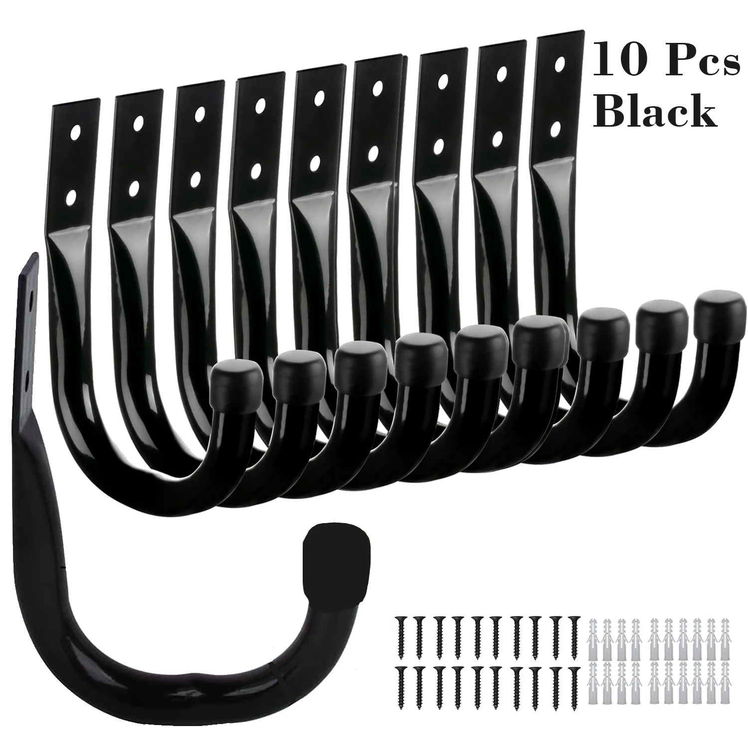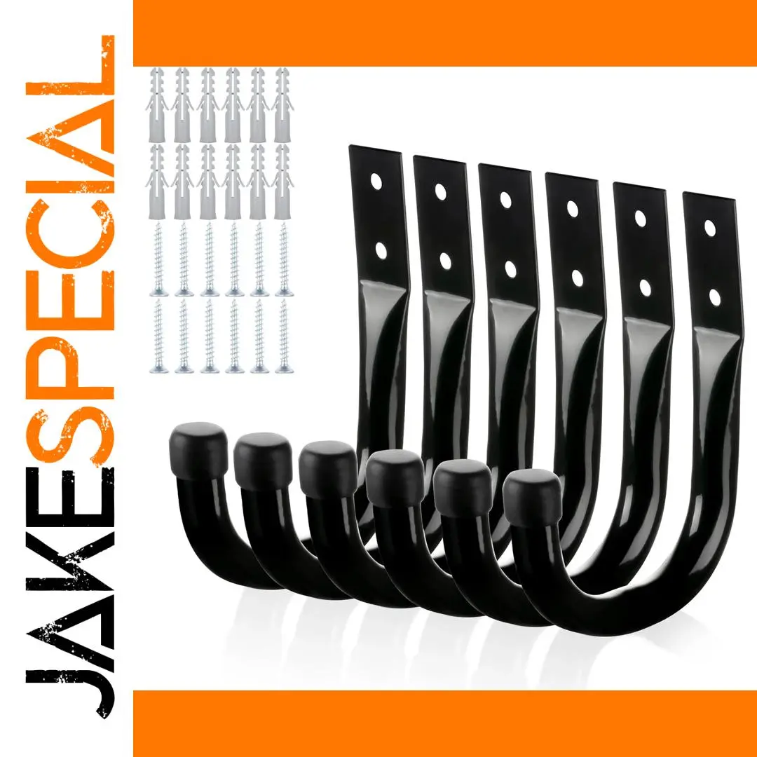 Transform your garage organization with this set of six heavy-duty wall-mounted hooks, expertly crafted from durable cast iron in sleek black finish. Designed for maximum strength, these hooks are perfect for hanging extension cords, tools, cables, or other bulky items. The smooth, elongated curved shape with rounded tips ensures your belongings stay safe without damage. The sturdy rectangular mounting brackets feature a subtle upward curve, providing excellent stability upon installation. Complemented by included silver wall anchors and screws, these hooks are easy to install and built to last, offering a reliable storage solution for large garages and workshops. Upgrade your space with these practical, industrial-style hooks and enjoy a clutter-free environment every day.