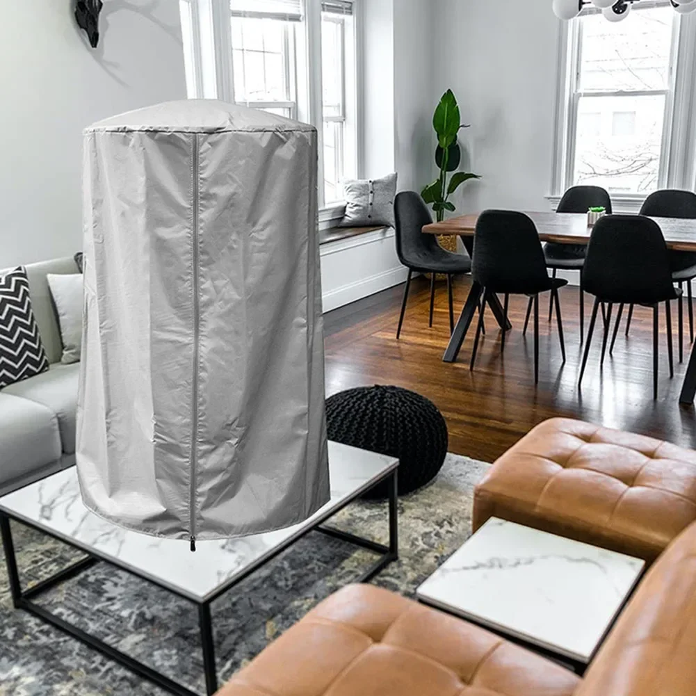Imagine your outdoor space protected rain or shine with this reliable, stylish cover. Crafted from 190T Oxford fabric, it offers excellent waterproof, windproof, tear-resistant, and fade-resistant properties to safeguard your heater from any weather conditions. Its streamlined, minimalist design features a smooth matte grey finish, seamlessly conforming to the shape of your cylindrical pyramid heater. The cover includes a hidden, vertical zipper for easy access, concealed beneath a stitched flap to protect against elements. An adjustable, elasticized windproof cord ensures a snug fit at the base, preventing it from being blown away by strong winds. Durable and lightweight, this cover not only shields your heater but also simplifies maintenance and storage, making it an essential outdoor accessory.
