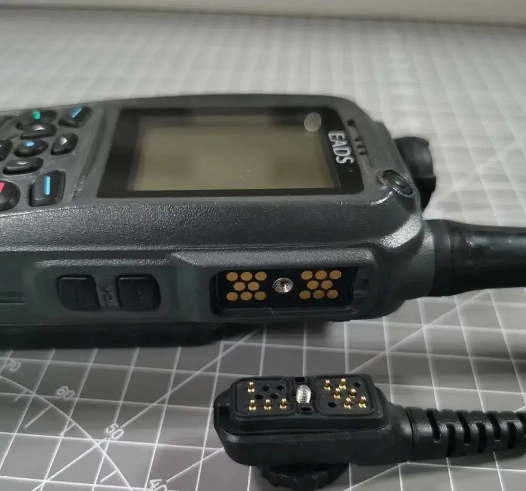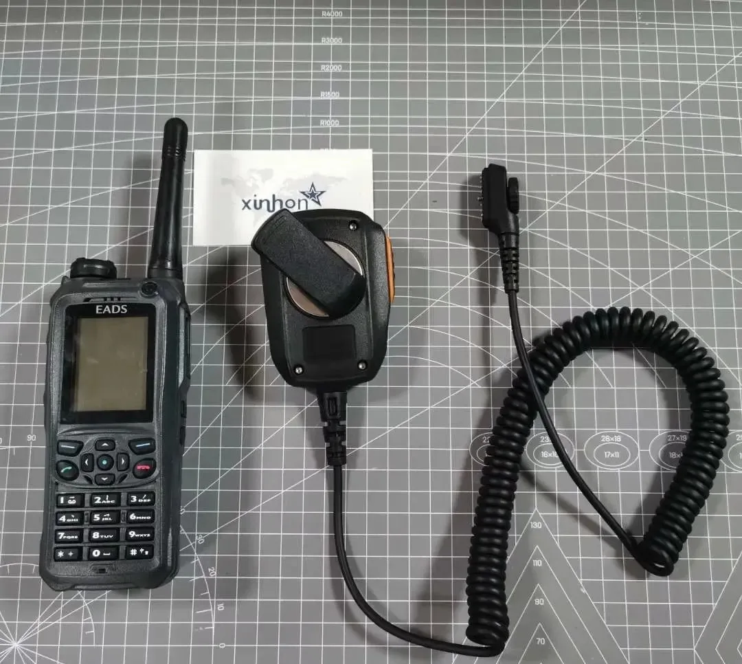 The Heavy Duty Handheld Intercom Remote Speaker Microphone is expertly designed for EADS two-way radios, specifically the THR9 model. With its rugged black casing and textured surface, this microphone ensures a secure grip while delivering clarity in communication. An eye-catching orange button for easy access dominates the design, complemented by a digital display and a numeric keypad on the radio for user-friendly operation. A prominent antenna enhances signal transmission, while the coiled cable provides flexibility and durability. Built for demanding environments, this microphone is your reliable partner for effective communication across various settings.