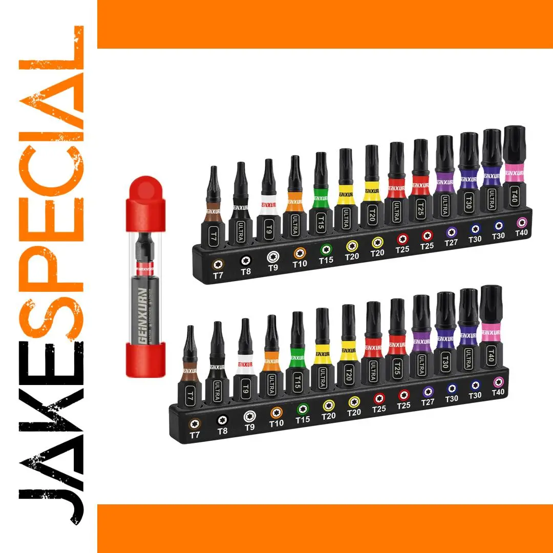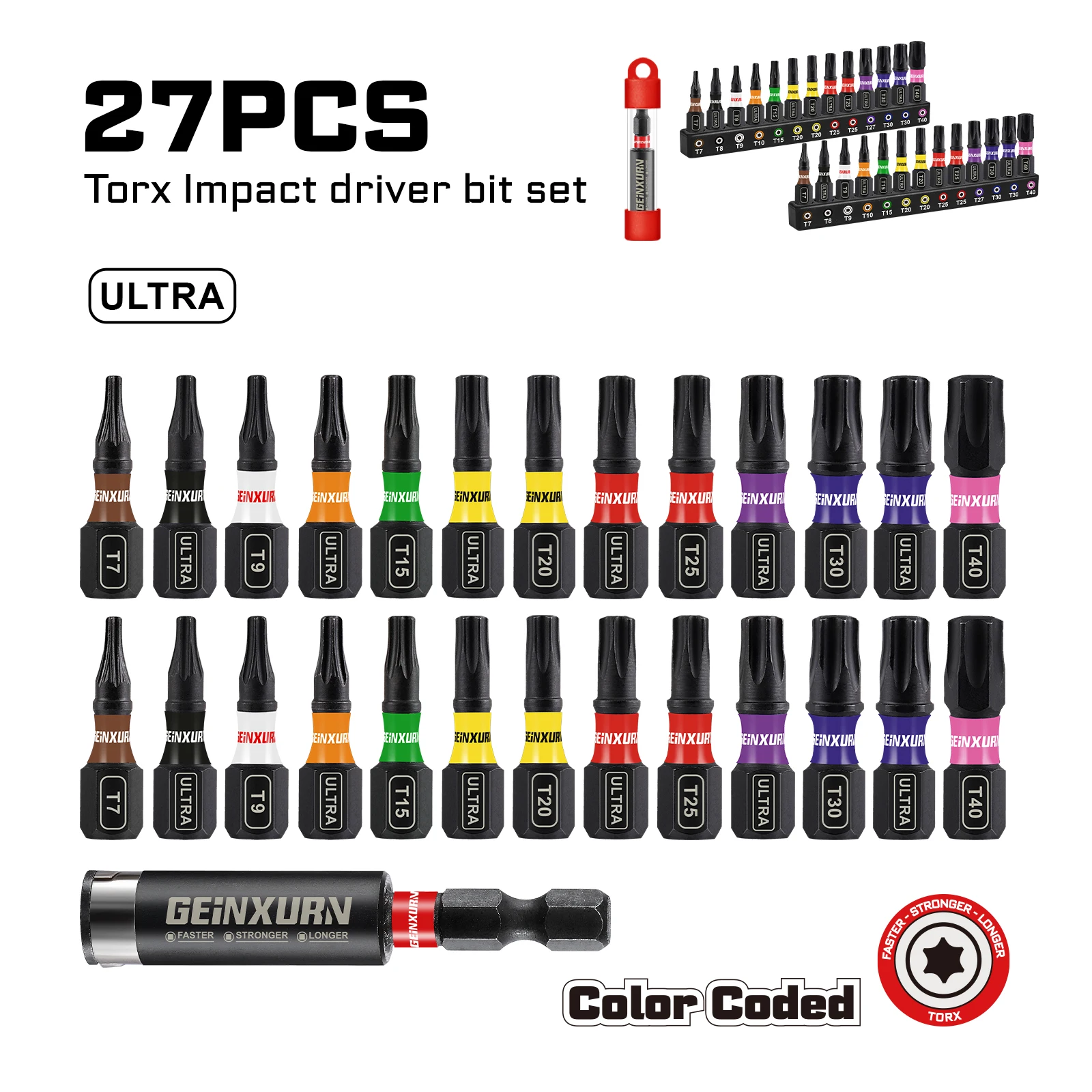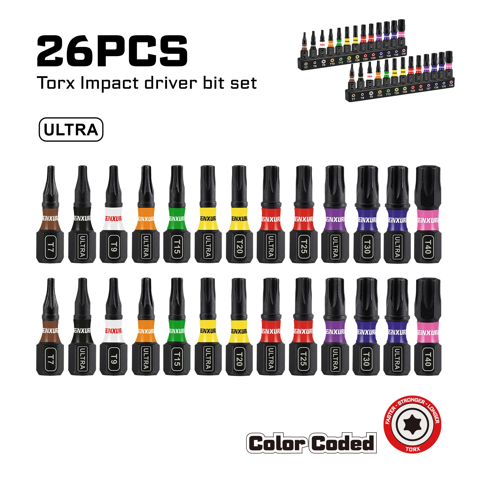 - Includes 20, 26, or 27 pieces of high-hardness alloy steel Torx bits, each 1 inch long, designed for durability and industrial use with up to 30 times lifespan enhancement.