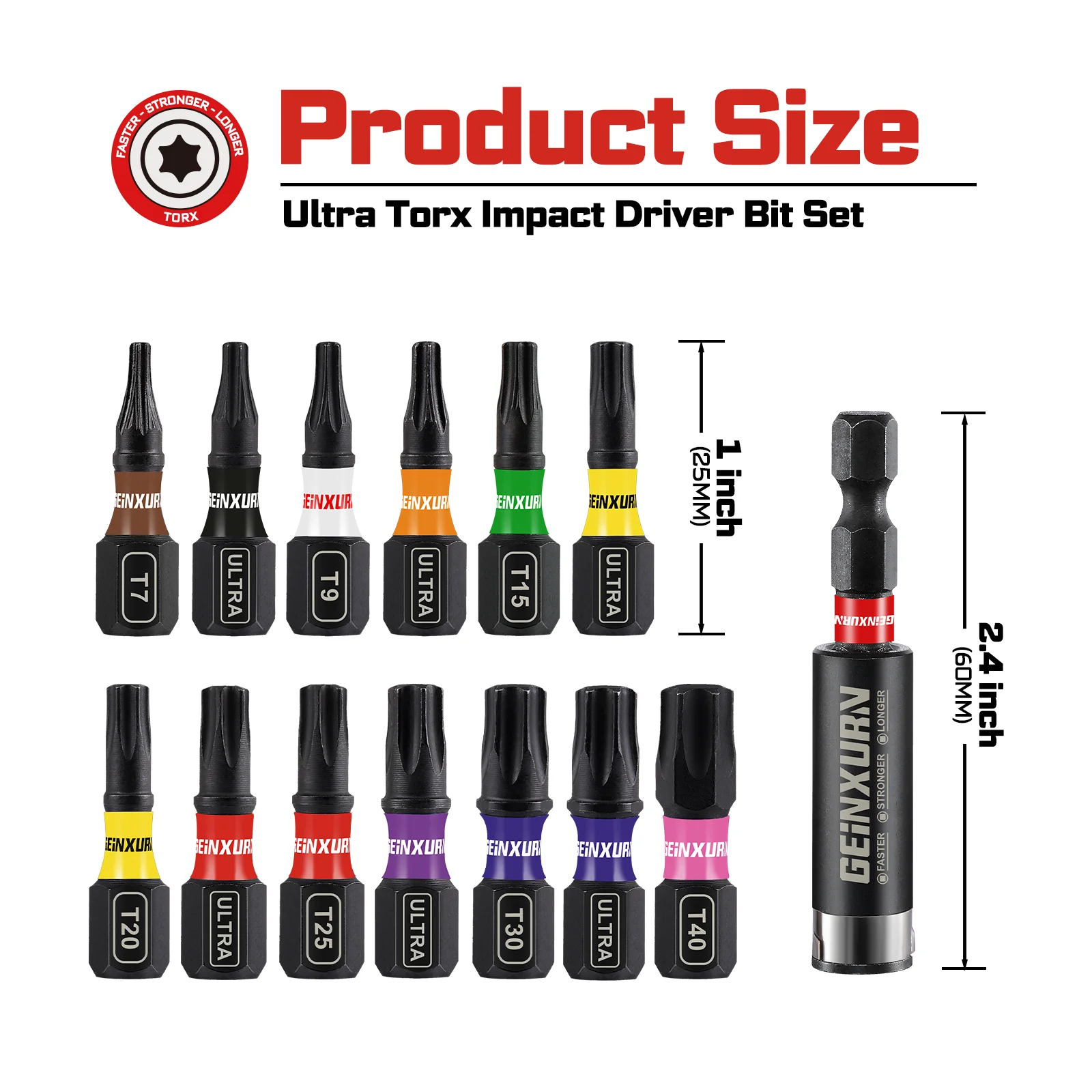 - All bits are precisely heat-treated for toughness, resilience, and resistance, making them ideal for heavy-duty fastening, with sizes from T7 to T40 clearly marked on each black plastic shank.