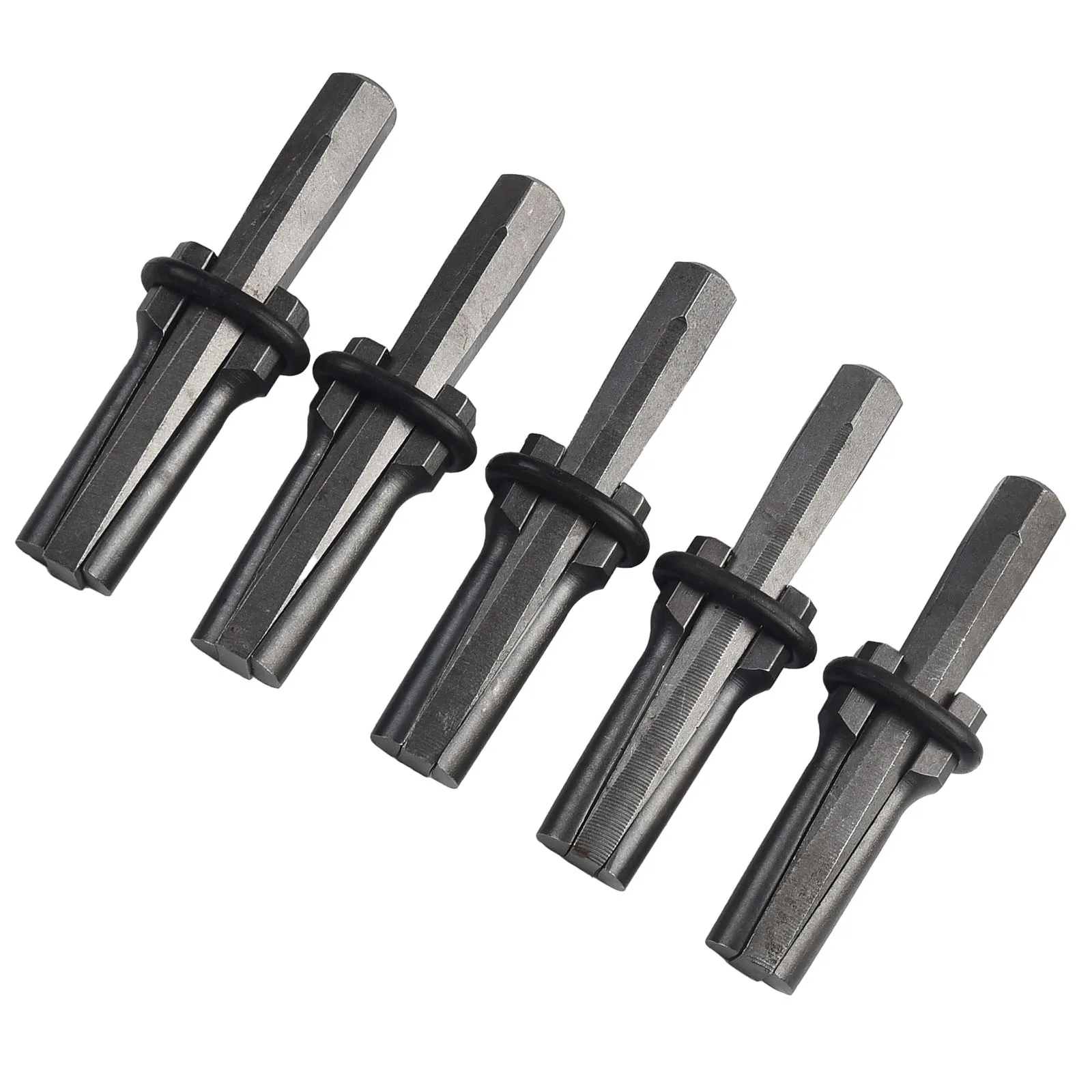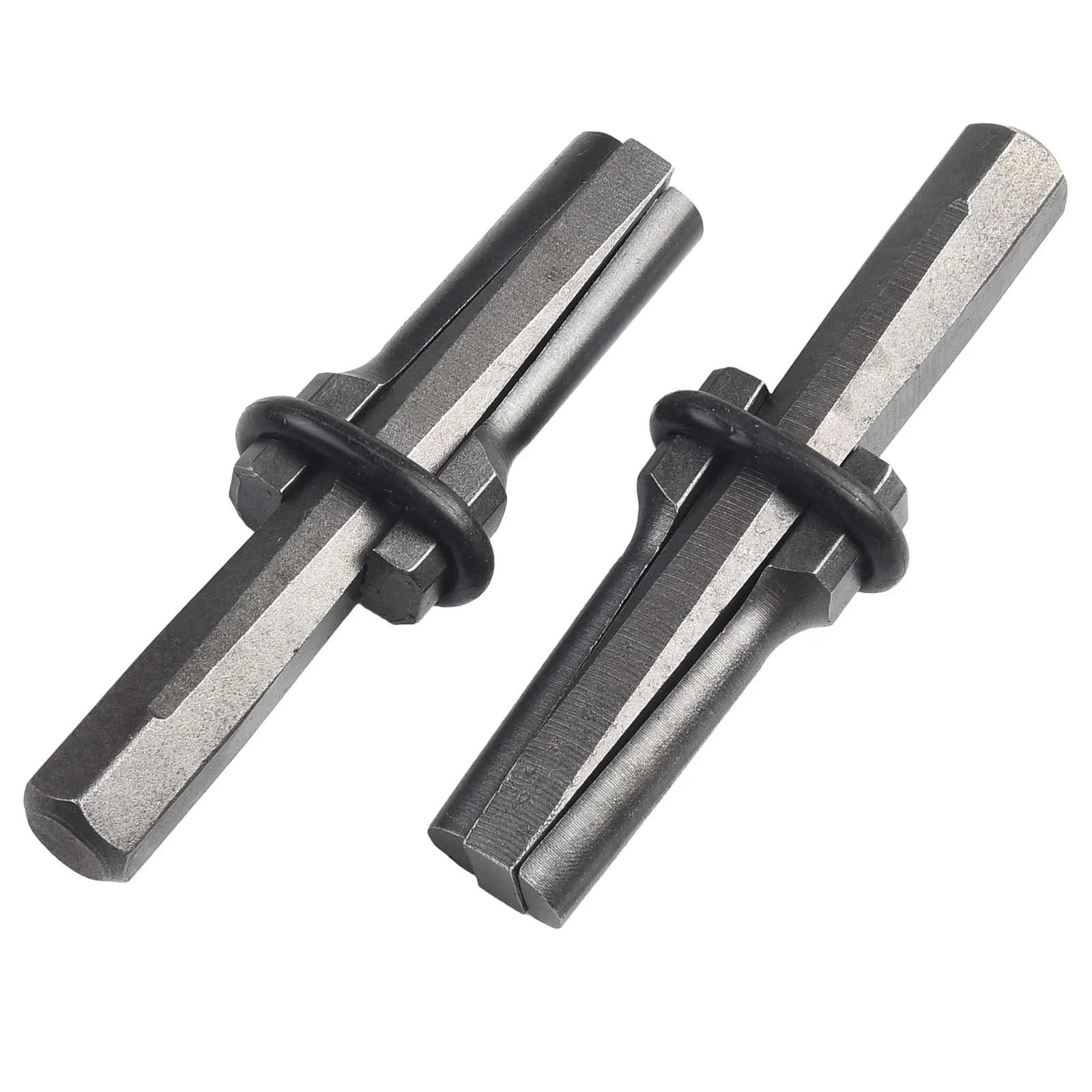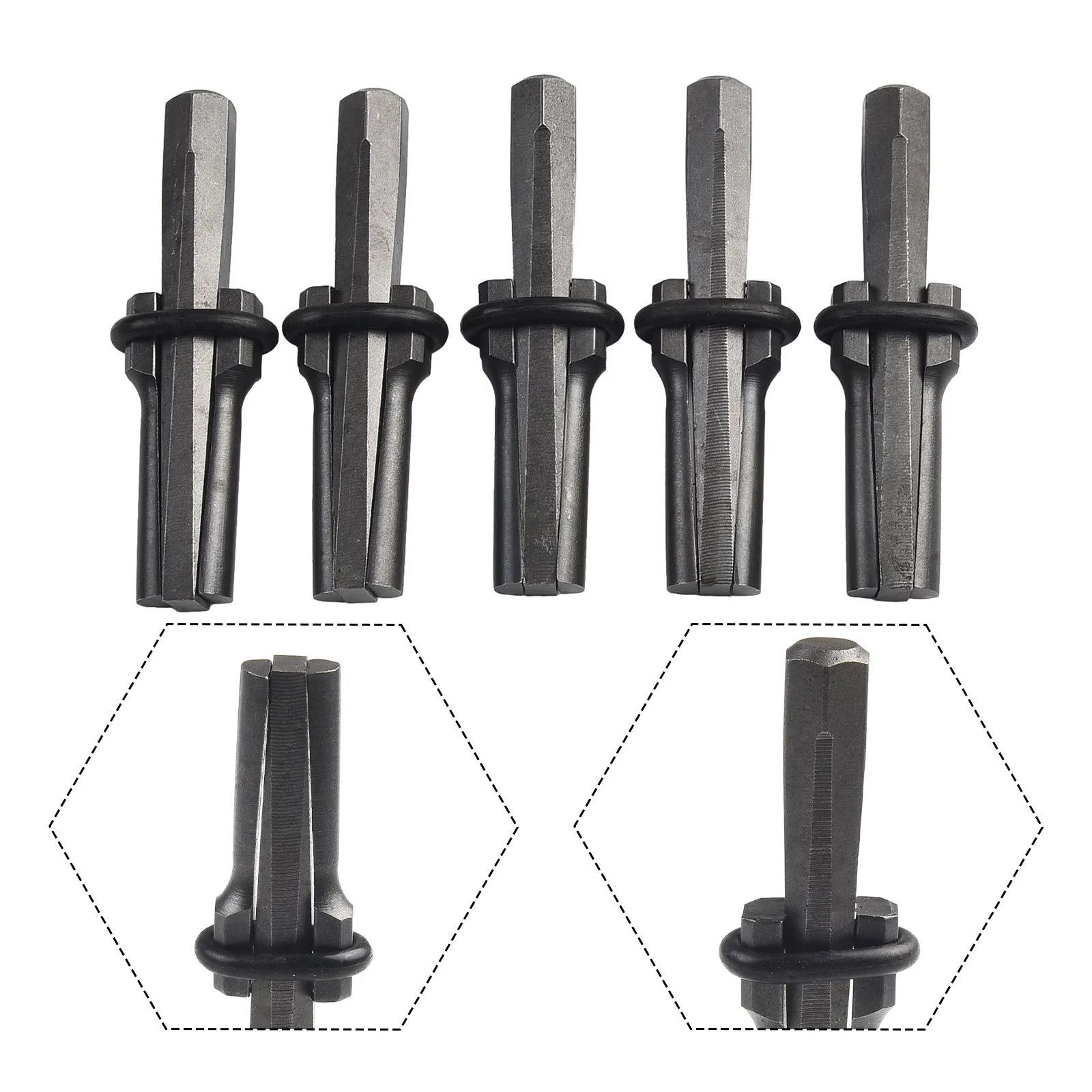 Experience effortless stone splitting with this set of five high-quality chromium vanadium alloy steel splitters. Designed for professional use, these tools measure approximately 105mm in length, with an 18mm drill diameter and 50mm drilling depth. The heat-treated steel construction ensures maximum hardness and toughness, making them perfect for splitting the toughest materials like granite, marble, concrete, basalt, and sandstone. The flat, rectangular shafts taper slightly at the ends, while the wider impact zones feature multi-faceted or hexagonal shapes that optimize striking accuracy. Black rubber rings encircle the impact zones, providing safer grip and protection during use. Trust these industrial-grade tools for reliable, precise results every time.