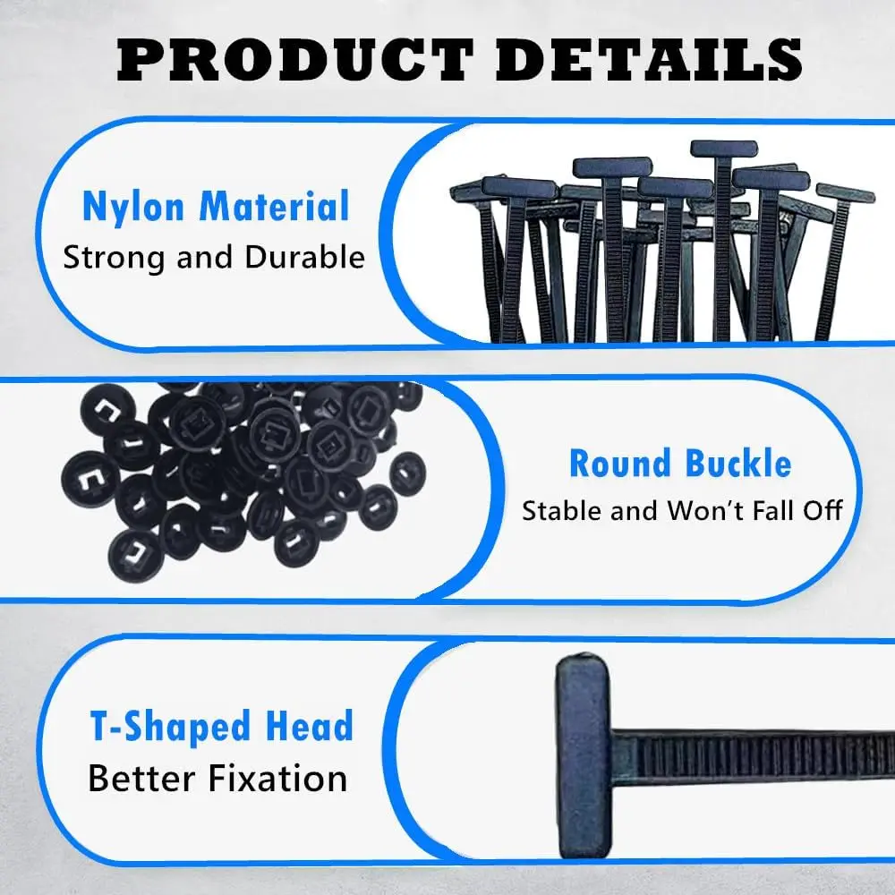 - Technical specifications include a T-shaped head with a broad, flat gripping surface, and a narrow, ridged vertical stem that securely locks cable ties in place, ensuring a firm hold and easy removal when needed.
