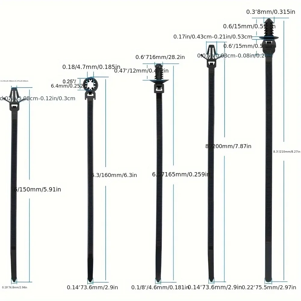 - Package contains 40 pieces of 8.3-inch ties, 25 of 6.7-inch, 15 of 5.9-inch, 15 aircraft nose clamps measuring 7.9″, and 15 M6 cable clamps for comprehensive use.
