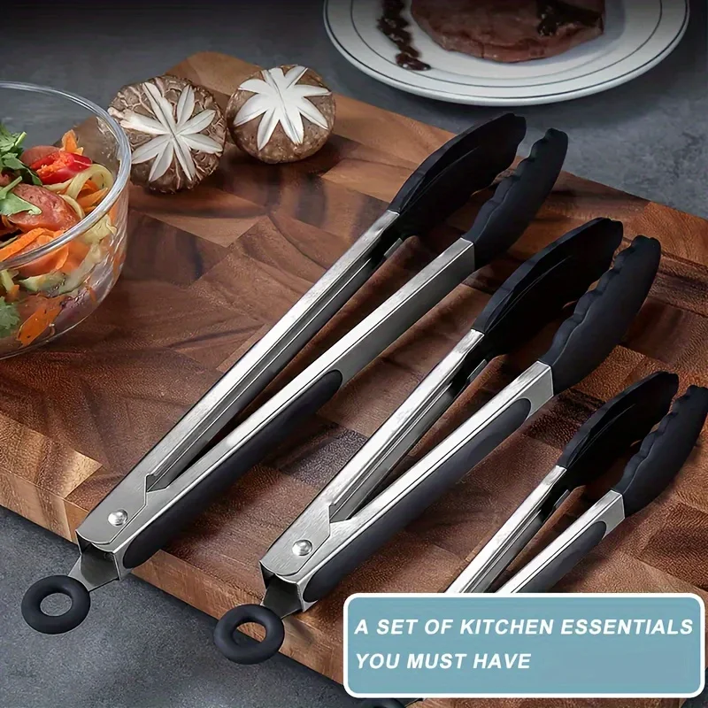 Experience the perfect blend of durability and functionality with these heavy-duty stainless steel kitchen tongs, available in three sizes and vibrant colors. Each pair features heat-resistant silicone tips with textured ridges for a secure grip and high-temperature resistance, making them ideal for grilling, roasting, and other high-heat cooking tasks. The ergonomic handles are finished with a black rubberized grip for comfort and a locking mechanism that allows for compact storage. Their sleek, modern design combines industrial chic with practicality, ensuring you have reliable, versatile tools that complement any contemporary kitchen setup.