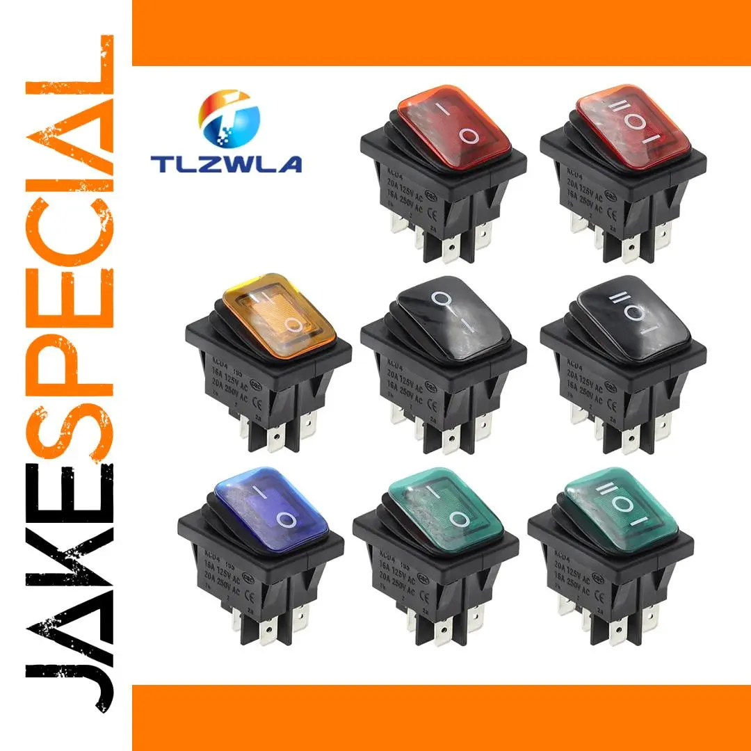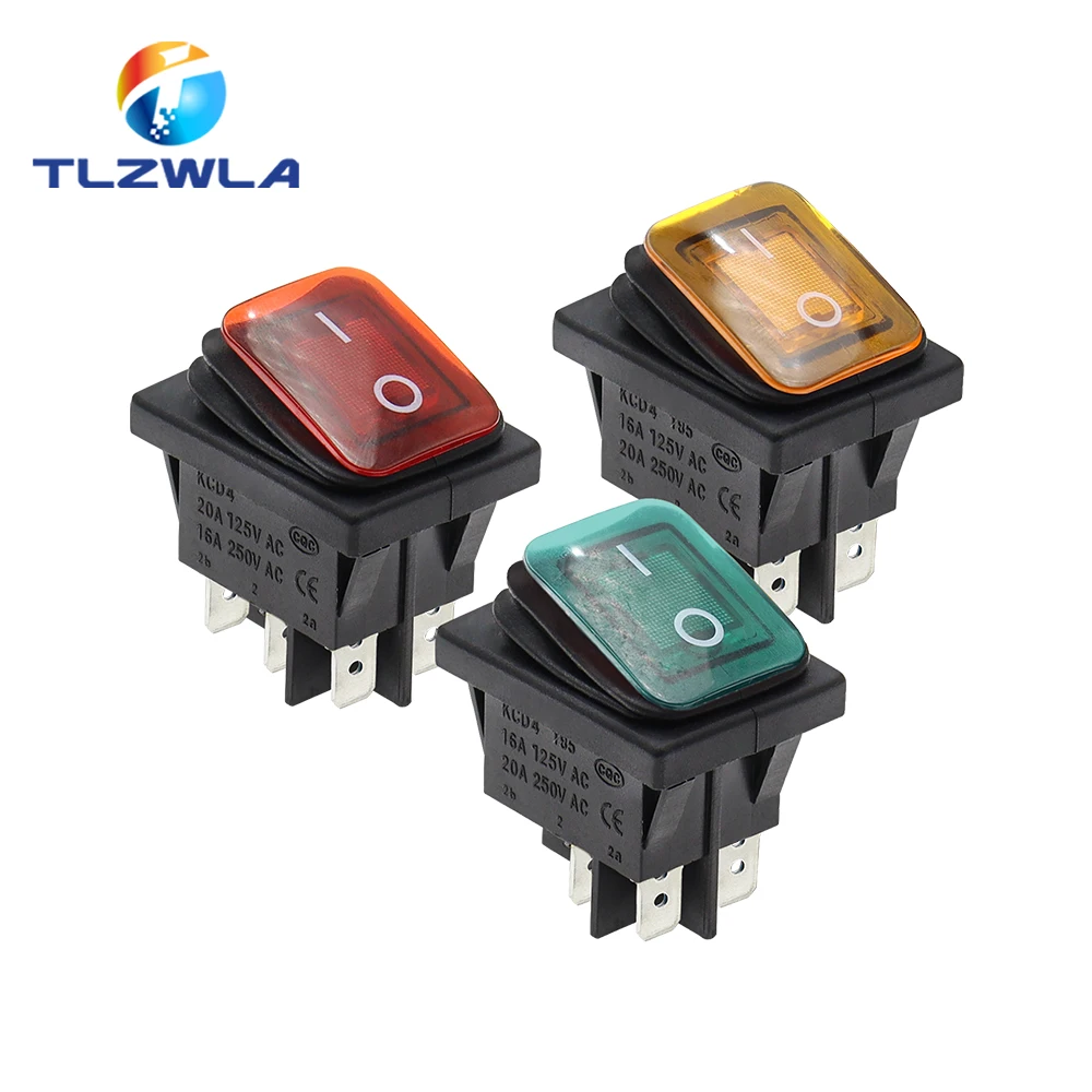 Experience reliable control with this rugged, waterproof rocker switch designed for demanding auto, marine, and industrial environments. Its sealed copper construction ensures durability and resistance to moisture, dust, and corrosion. Available in 4-pin or 6-pin configurations, it features clear LED indicator lights in vibrant colors like red, yellow, blue, and green, providing easy visual status at a glance. The switch's compact, rectangular, slightly curved overlays diffuse LED illumination for a soft glow, enhancing visibility and safety even in challenging conditions. With current ratings up to 20A at 250V, this switch guarantees peak performance for heavy-duty applications. Its sleek black housing contrasts sharply with the colorful overlays, offering a professional and functional aesthetic that blends seamlessly with any dashboard or control panel.