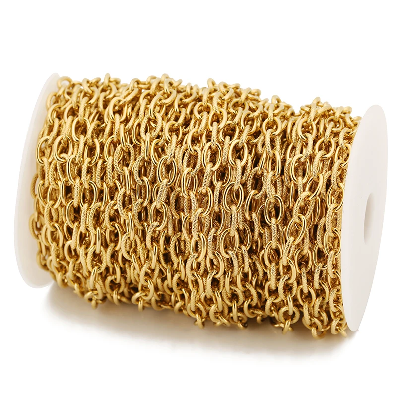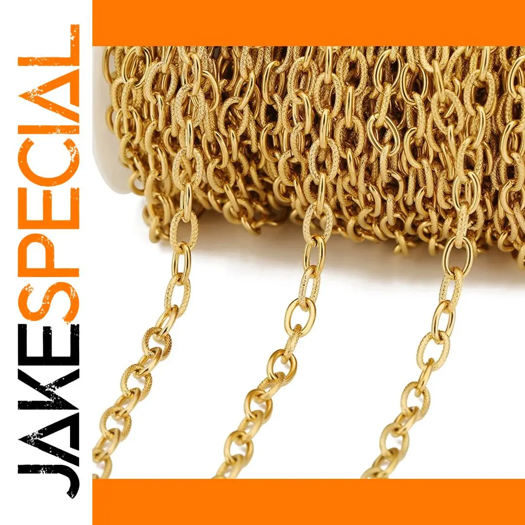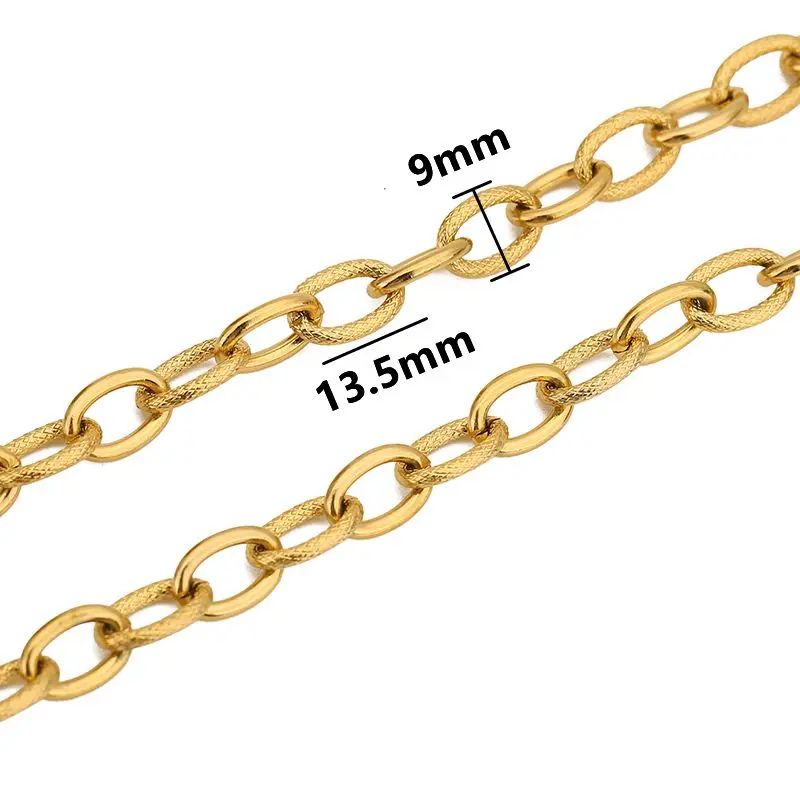 Create bold and stylish jewelry with this 1-meter stainless steel oval cable chain, measuring 9×13.5mm with a textured design, featuring heavy, wide links that reflect a rugged punk rock or hip hop aesthetic. Finished with a durable 18k gold plating that resists fading, this chain combines strength and luxury, making it perfect for DIY necklaces and bracelets. The chain’s links are approximately 0.9mm wide and high, with a diameter of 0.9mm, providing a flexible yet sturdy accessory option. Ideal for crafting statement pieces, it is suitable for both professional jewelers and DIY enthusiasts seeking high-quality, textured metal jewelry findings that exude strength and refinement.