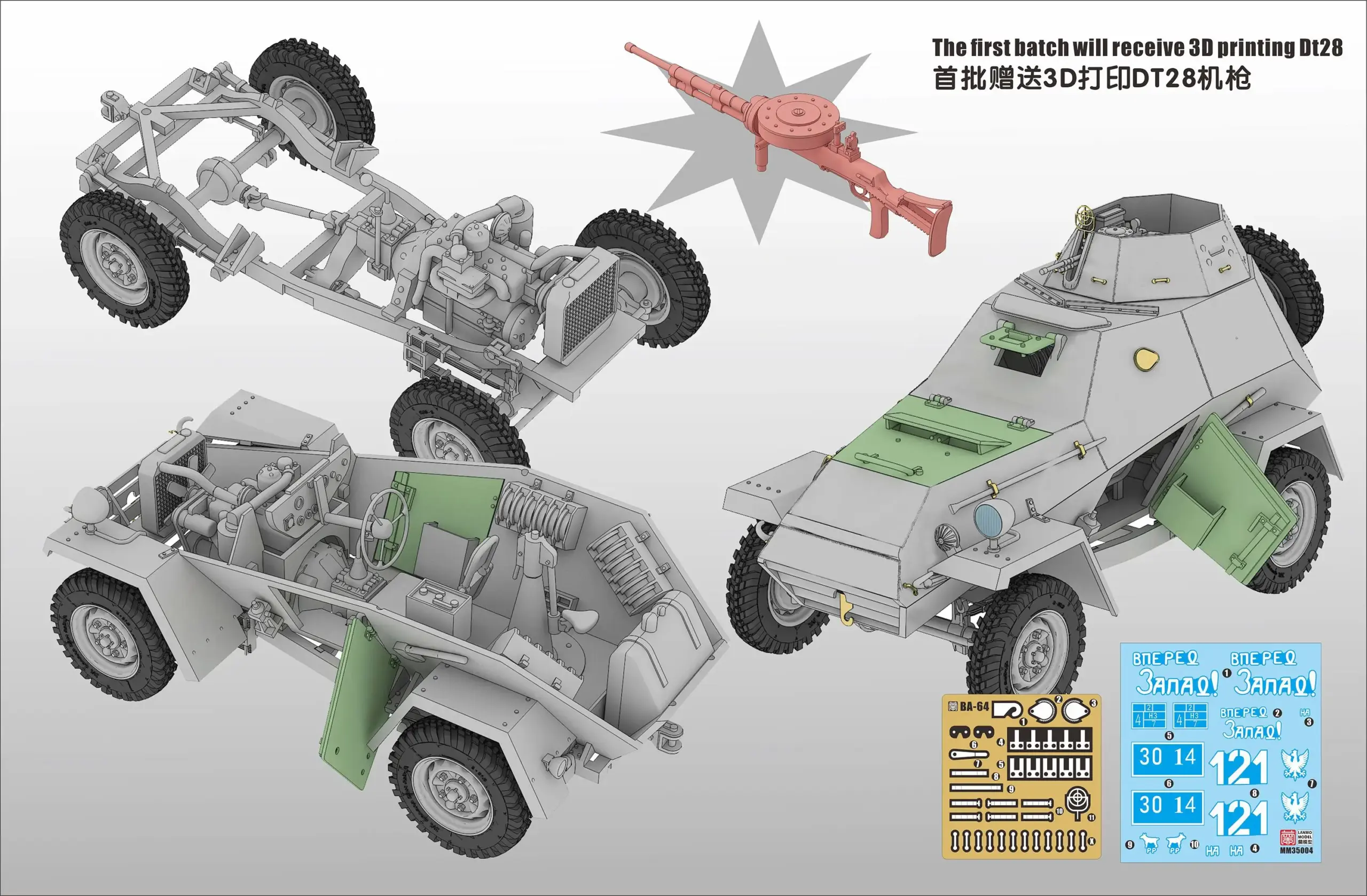 The Heavy Hobby Lanmo MM35003 1/35 scale model of the Soviet BA-64B Full Interior Light Armored Car is designed for collectors and enthusiasts who appreciate intricate detail and history. This model showcases a rugged military green body with textured, weathered finishes, promising a realistic representation of a vehicle used in combat. The meticulously crafted model features an angular structure, complete with a fully detailed interior visible through an open rear door. With its machine gun and 3D printed accessory (Dt28), this model stands out, inviting you to immerse yourself in constructing and displaying this iconic piece of military history.