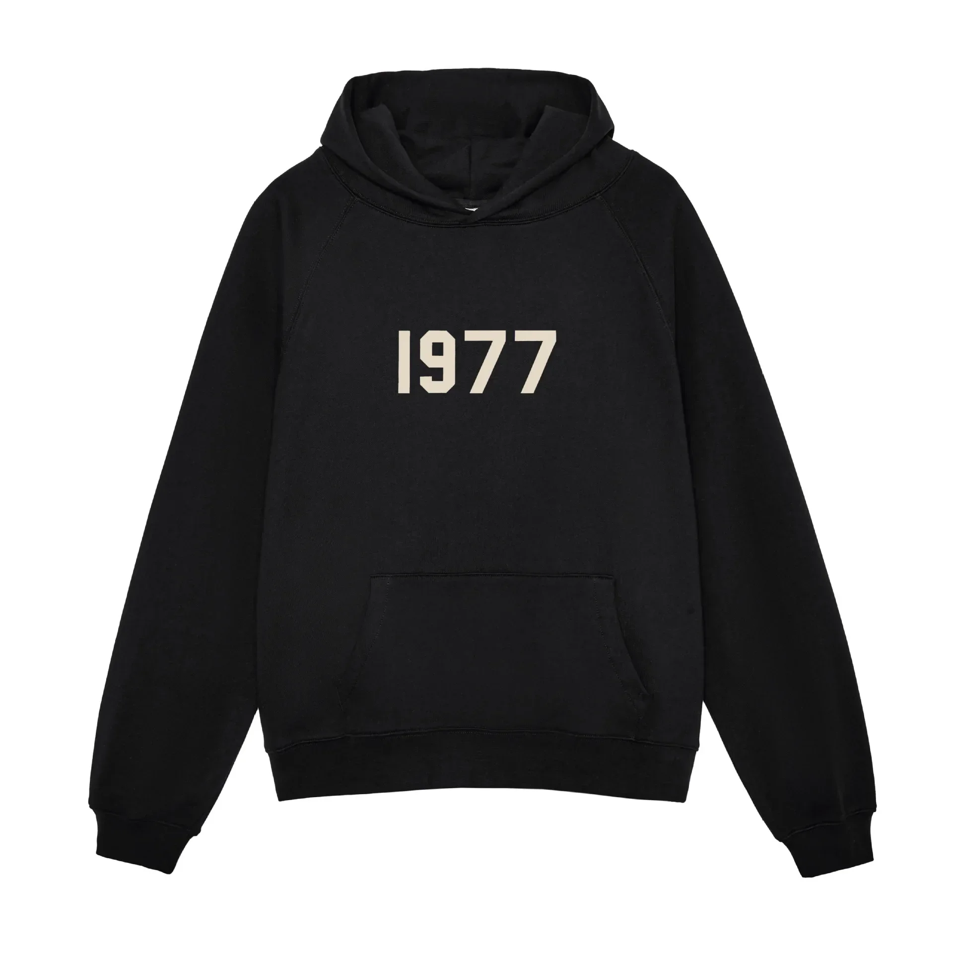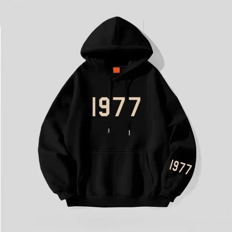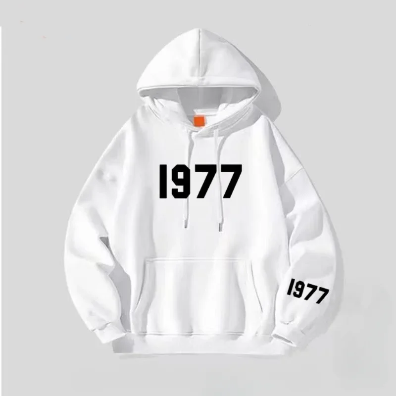 Experience casual comfort with this high-quality heavyweight men's hoodie designed for autumn and winter. Crafted from plush fleece material, it offers warmth and durability, making it perfect for daily wear. Its minimalist design features a bold black “1977” print on the chest and a subtle version on the lower left sleeve, adding a trendy touch. The attached hood is adjustable with drawstrings, providing a personalized fit, while its large front kangaroo pocket ensures practicality. The full-length sleeves with ribbed cuffs, straight hem that covers the hips, and relaxed fit combine to offer a timeless, sporty look that is easy to style with your everyday wardrobe. This hoodie is ideal for those who value comfort and modern streetwear aesthetics.