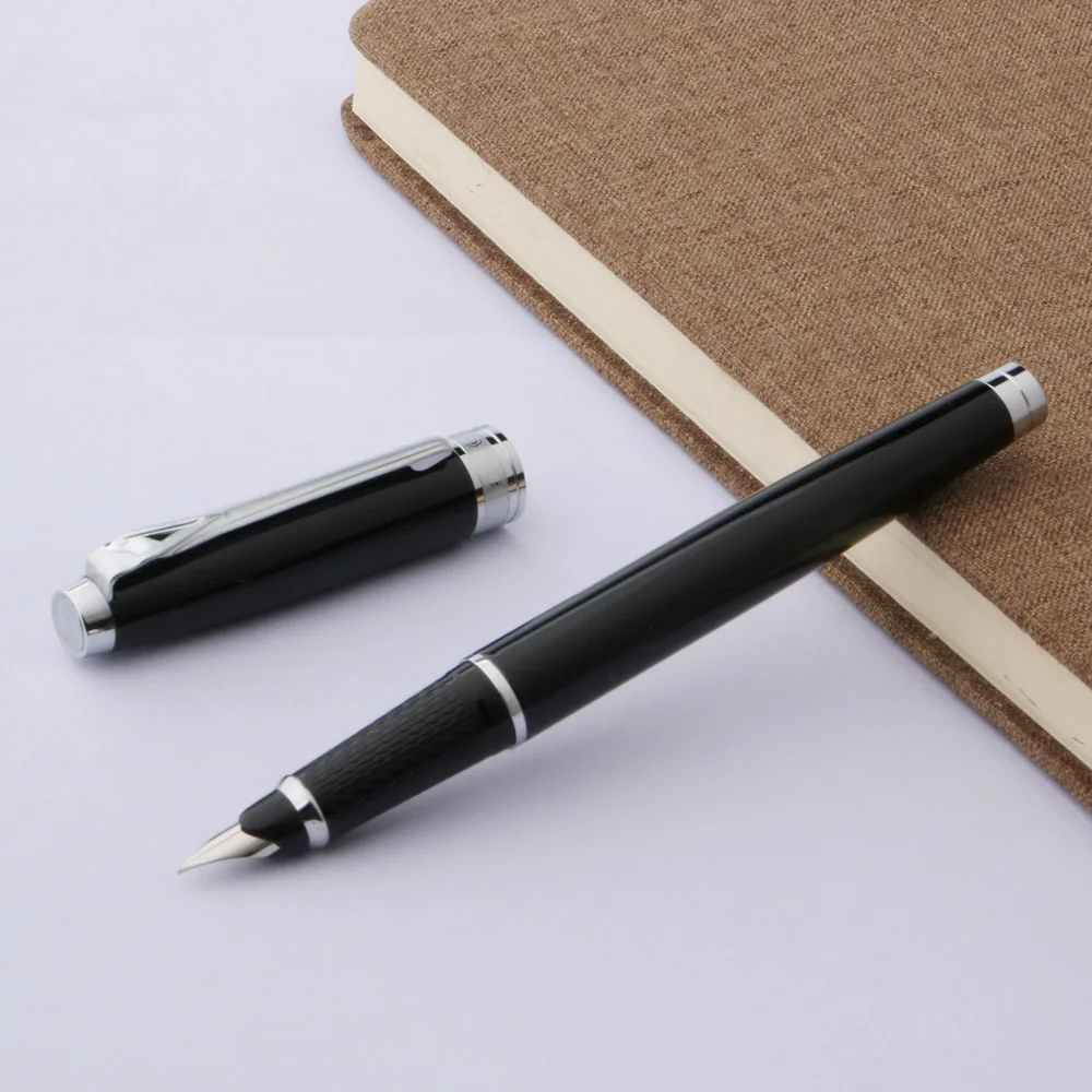 Experience the perfect balance of vintage charm and modern elegance with this black Hero 606A Retro Fountain Pen. Designed for enthusiasts and professionals alike, it features a sleek high-gloss black body adorned with shiny silver accents that evoke timeless sophistication. The pen's sturdy stainless steel nib, with a precise 0.7mm writing point, delivers smooth, consistent ink flow for flawless handwriting. Its textured grip section provides comfort and control, making each stroke effortless. The cap, matching in polished black, complete with a silver band, ensures secure closure while maintaining the pen’s minimalist appeal. Crafted with durable, quality materials, this pen is ideal for daily use, whether in the office, classroom, or personal stationery collection. Its classic design suits any writing style or occasion, making it an essential tool for refined writing.