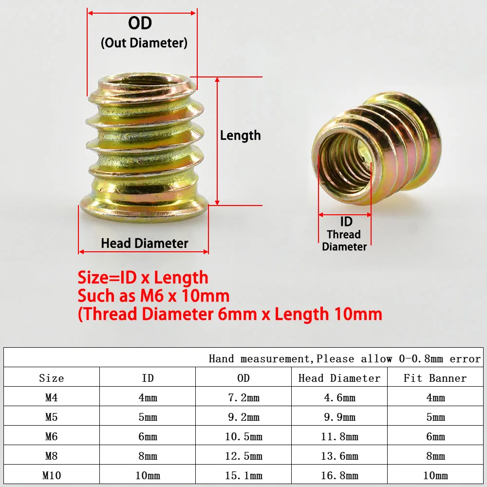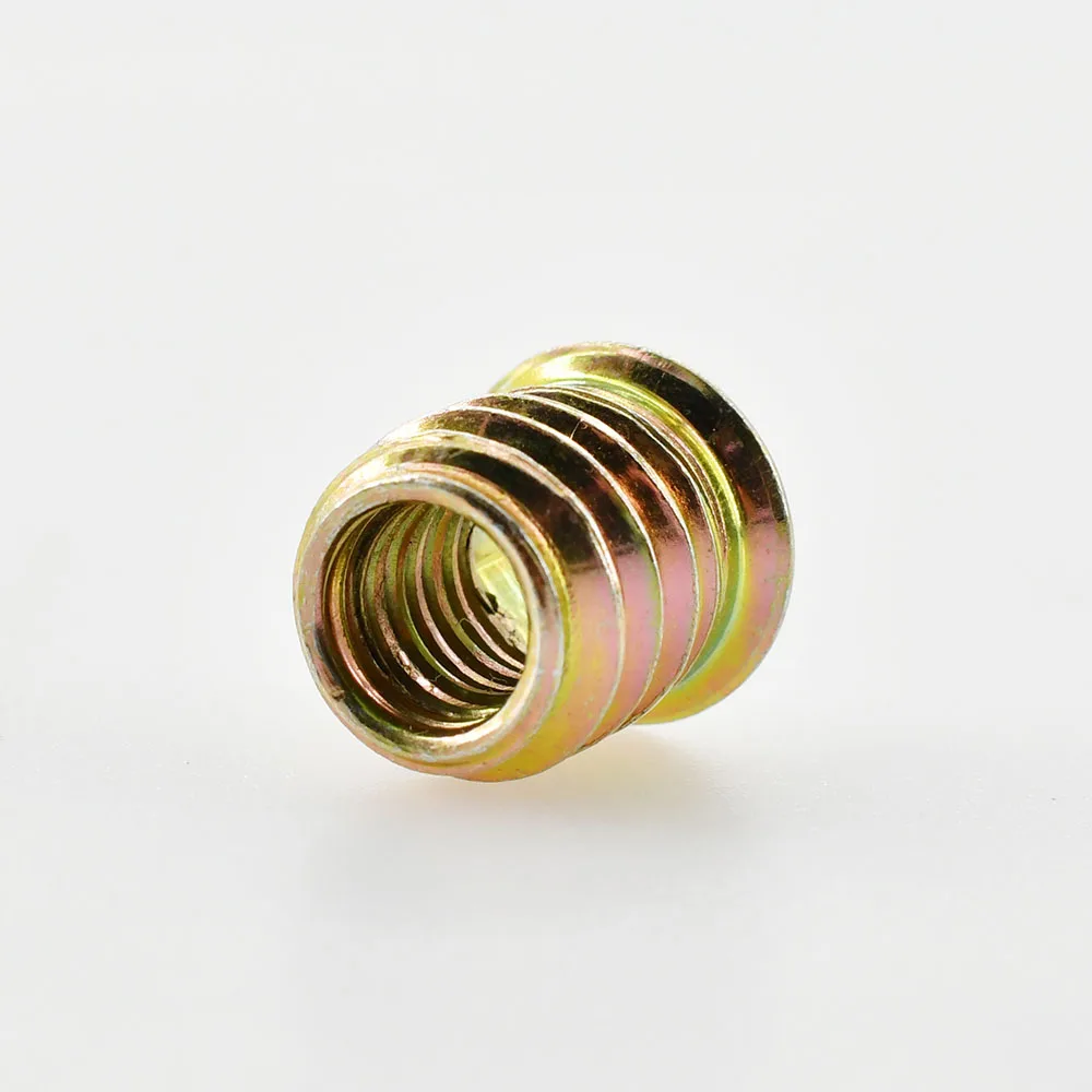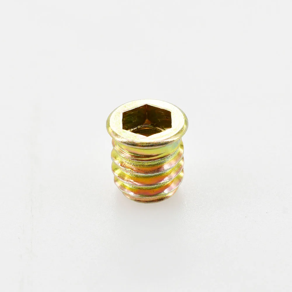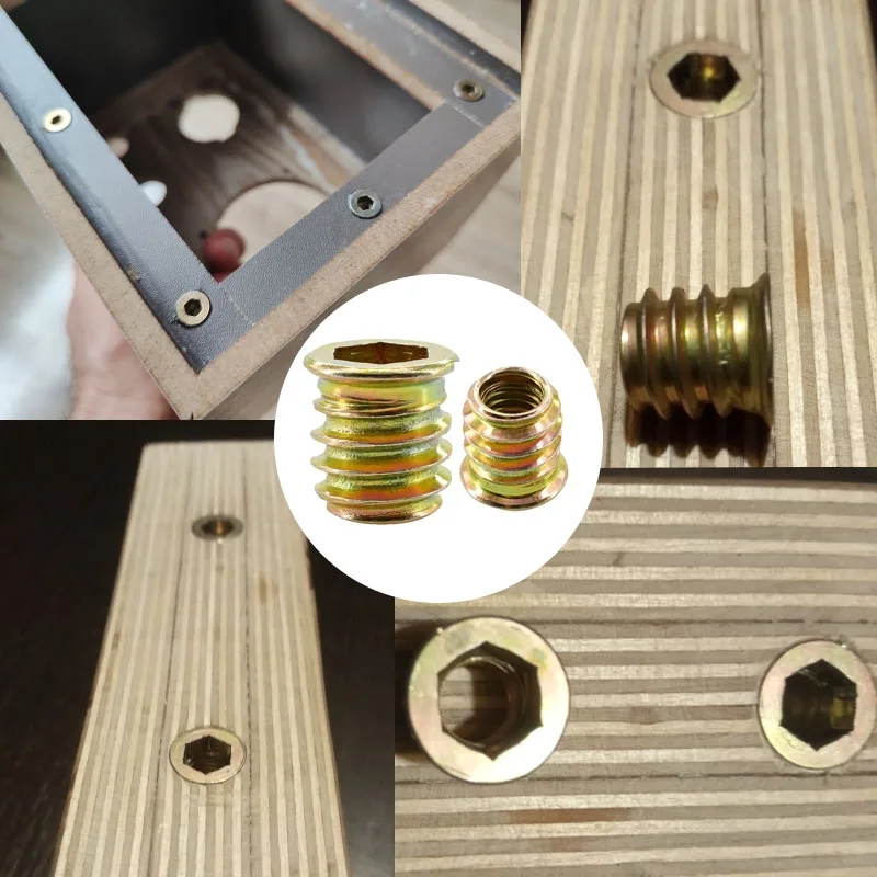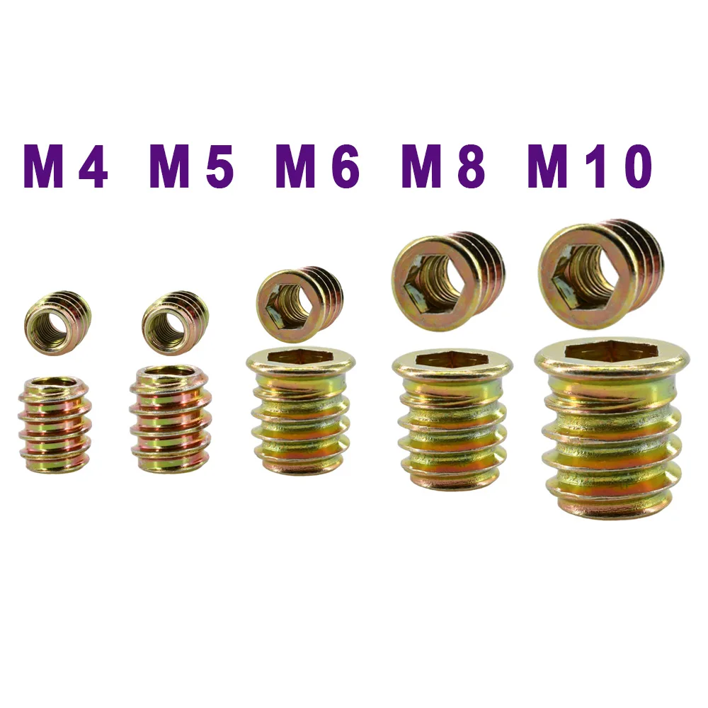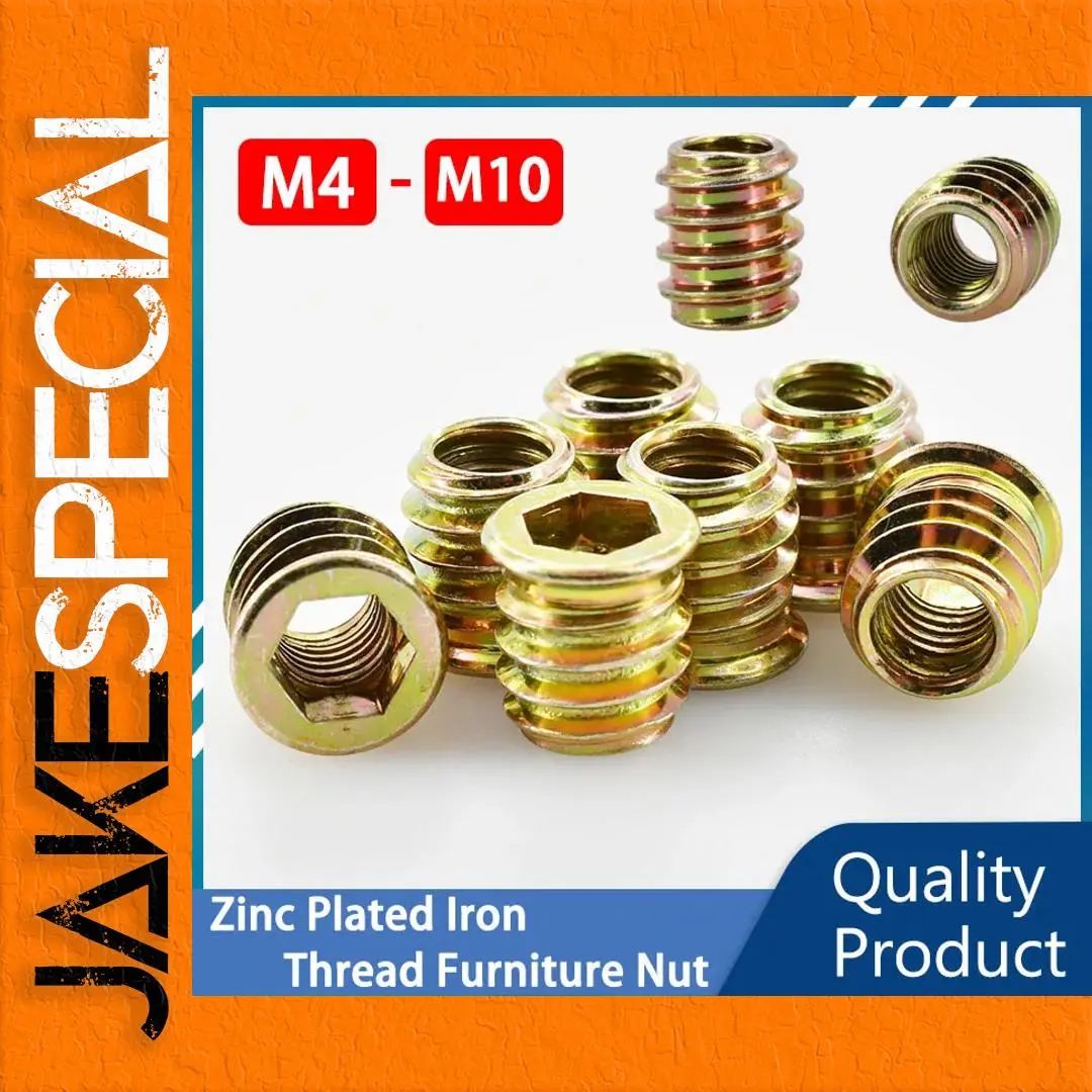 Transform your woodworking projects with this set of hexagon insert nuts, crafted from durable carbon steel with a corrosion-resistant zinc plating. Available in sizes M4, M5, M6, M8, and M10, these nuts cater to all your furniture assembly needs. Their hexagonal design and grooves provide a secure grip, ensuring efficient fastening whether you're creating or repairing wood furniture. With lengths varying from 10mm to 30mm, you'll find the perfect fit for your application. Enjoy the metallic gold shine that enhances your toolkit while benefiting from the reliability that these nuts offer for successful woodworking endeavors.