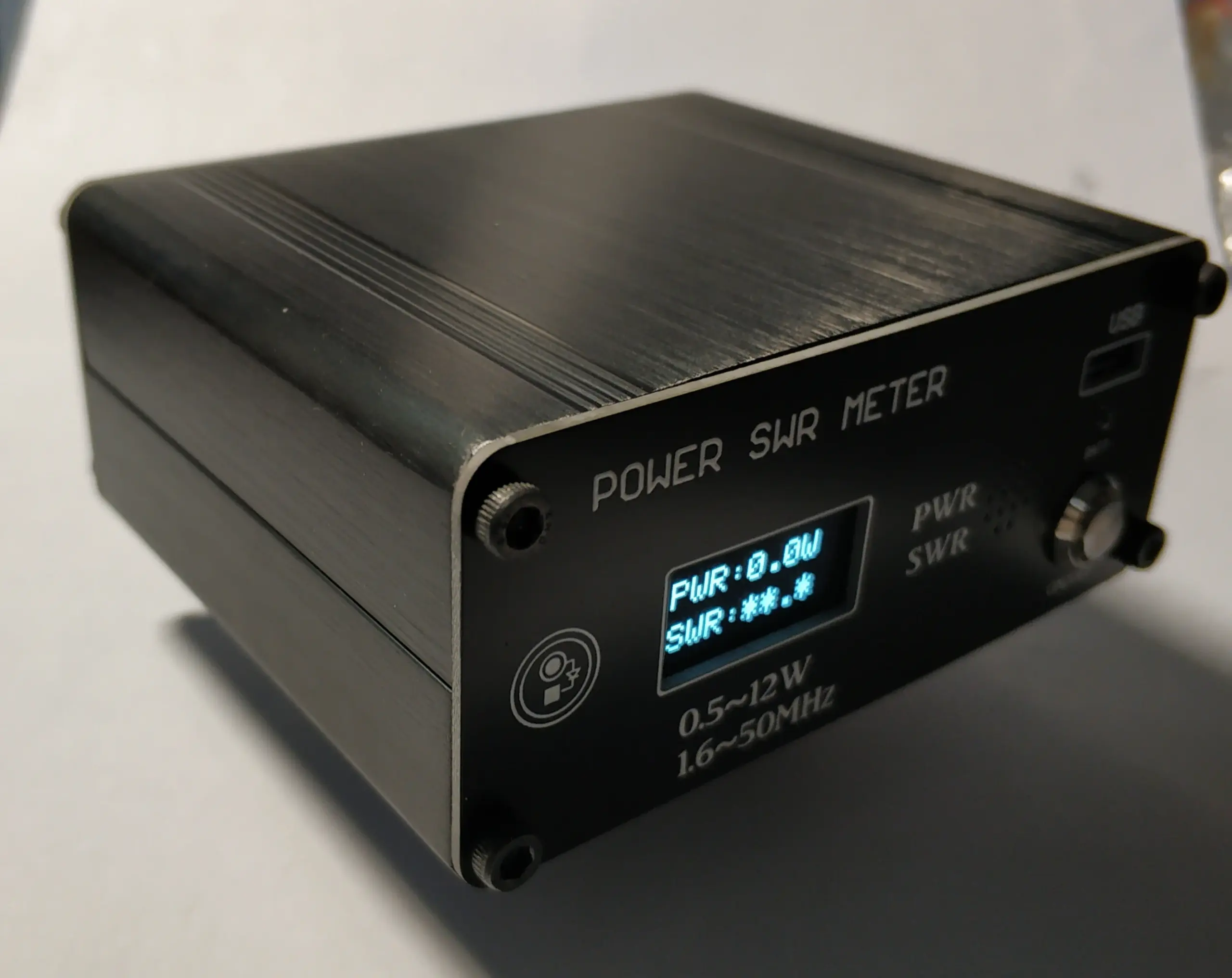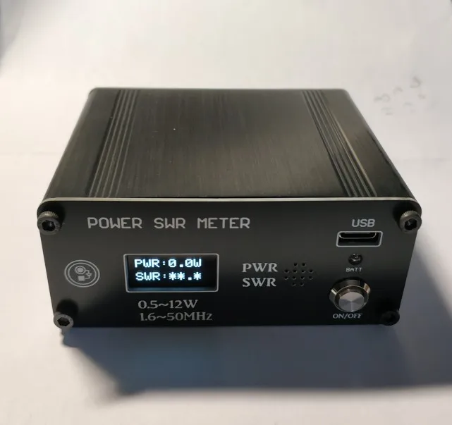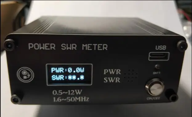 Experience precise RF power and standing wave measurements with this compact 1.6-30MHz, 0.1-11W meter. Encased in a durable matte black housing, it features a sleek OLED12864 display that shows real-time data, including power output (“PWR: 0.0W”) and SWR (“SWR: ##. *”). The device includes a BNC RF interface (customizable to M-type or N-type), a Type-C charging port, a 800mAh built-in battery, and a metallic rotary ON/OFF knob for easy control. Its minimalistic, rectangular design ensures portability and ease of use, making it an essential tool for RF enthusiasts and HAM radio operators seeking reliable, accurate measurements.