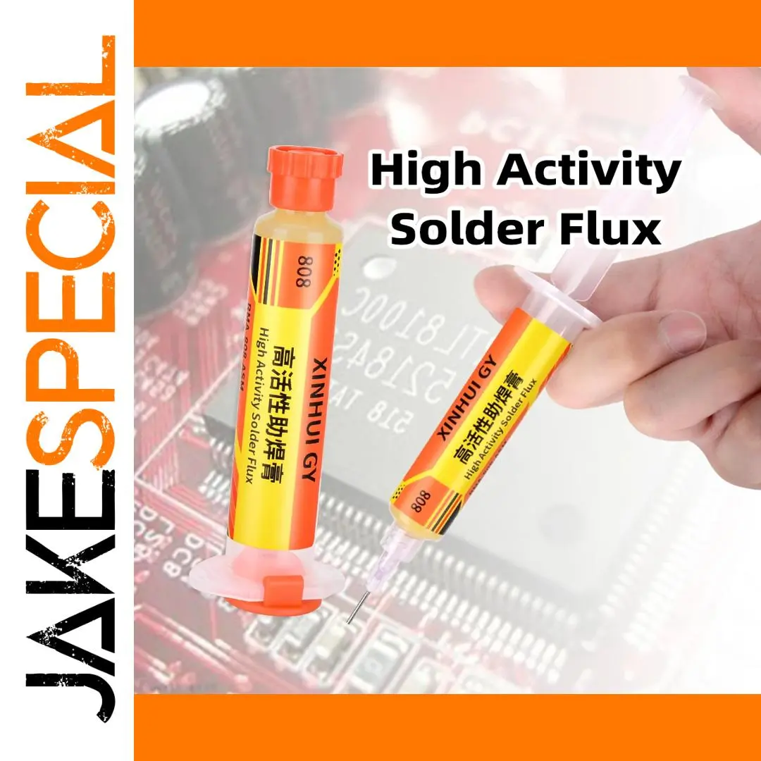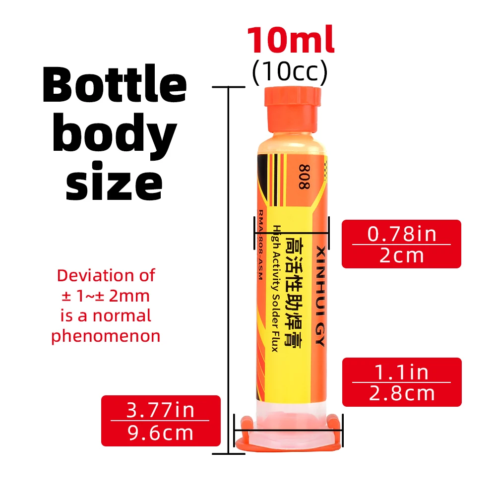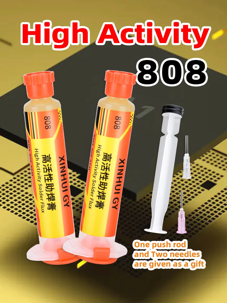 Experience professional electronic repairs with this high-activity solder flux. The 10ml container features a vibrant yellow body with a bold orange cap, designed for precision application. Its detailed label, displaying model number 808 and dual-language technical features, emphasizes quality and reliability. The needle grip is ergonomically designed for quick, effortless dispensation, making delicate chip bonding, component welding, and mobile phone repairs seamless. This lead-free and halogen-free flux ensures environmentally responsible usage while providing excellent non-oxidation, insulation, and antioxidation properties. Its fluidity and durability make it suitable for both DIY repair enthusiasts and professionals aiming for high-quality results. Every detail of this flux exudes a modern, efficient, and trustworthy aesthetic that boosts confidence during intricate electronic maintenance tasks.