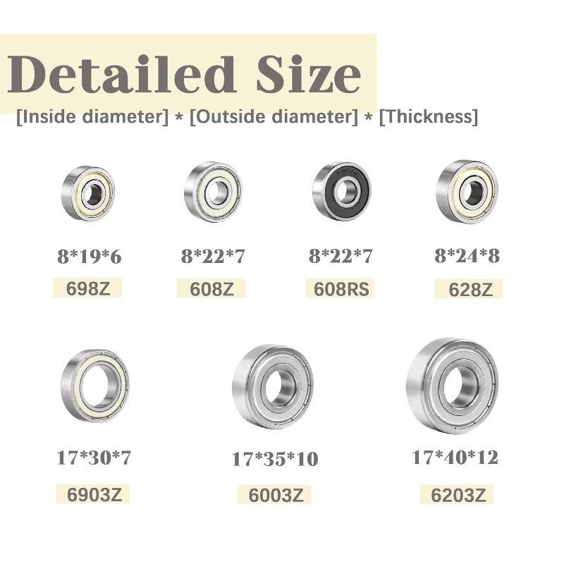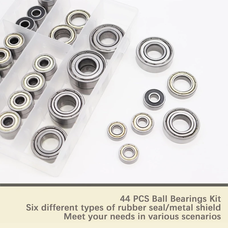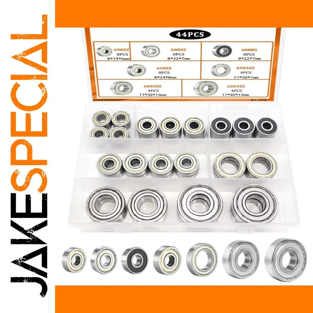 - Includes 44 bearings of multiple sizes: 608RS, 608ZZ, 698ZZ, 628ZZ, 6903ZZ, 6003ZZ, 6203ZZ, offering versatility for various projects.