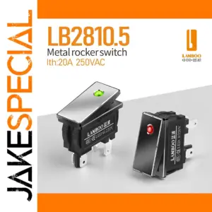 The 2810.5 series high-current rocker switch offers a sleek, durable design with a metallic, oxidized aluminum key and IP65 waterproof and fireproof rating. Featuring a 16A capacity at 250VAC and a 4000W resistive load, this 2-position ON-OFF switch includes 4 pins with a latching mechanism, suitable for 12V and 24V systems. It displays a bright red or green LED indicator operating at 9-24V, adding both style and functionality. Made of high-quality plastic with certifications including CCC, CE, CQC, and ROHS, it combines industrial robustness with modern aesthetics, ideal for high-end electrical and industrial applications.