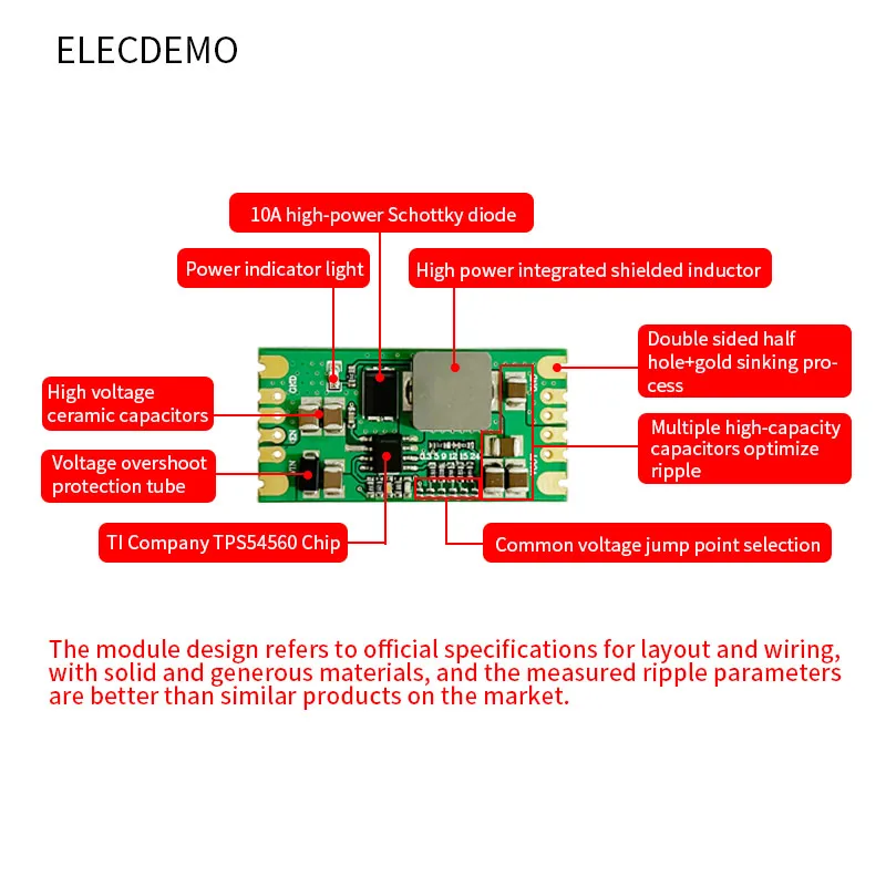 Experience reliable power conversion with this ElecDemo power module, built around the efficient TPS54560 chip. Designed for high-current applications, it supports input voltages from 5.5V to 60V and delivers up to 5A of current. With a compact size of 40.64mm x 20.32mm x 5.28mm, it fits seamlessly into your projects while providing adjustable output voltage options including 3.3V, 5V, 9V, 12V, 15V, and 24V via jumper settings. The module features advanced overheating protection for safer operation and requires the input voltage to be at least 2V higher than the output for optimal stability. Carefully tested before shipping, it’s an ideal choice for DIY enthusiasts, students, or anyone needing a dependable, high-quality DCDC step-down power supply.