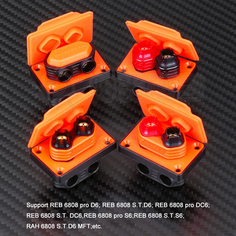 This high-current lithium battery connector by DIVEDEER features a modern, industrial design with a sleek black rectangular body with smooth, rounded edges. It is complemented by a striking orange protective cover that adds visual contrast and emphasizes safety. The gold-plated onboard plug ensures excellent electrical conductivity and long-lasting durability, giving a polished appearance suitable for professional use. Thick gauge red and black cables extend outward, indicating positive and negative terminals, presenting a robust and high-performance look. The assembly is mounted on an orange, L-shaped stand, highlighting its functional and aesthetic appeal. Its textured dark background further emphasizes its industrial, durable vibe, making it ideal for demanding electronic projects and high-power applications.