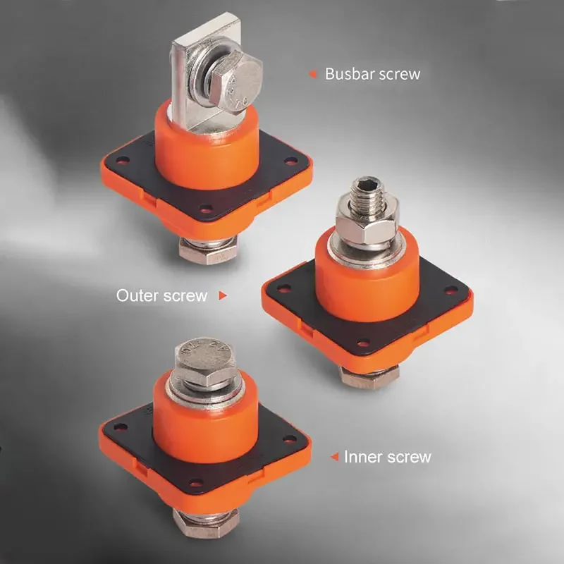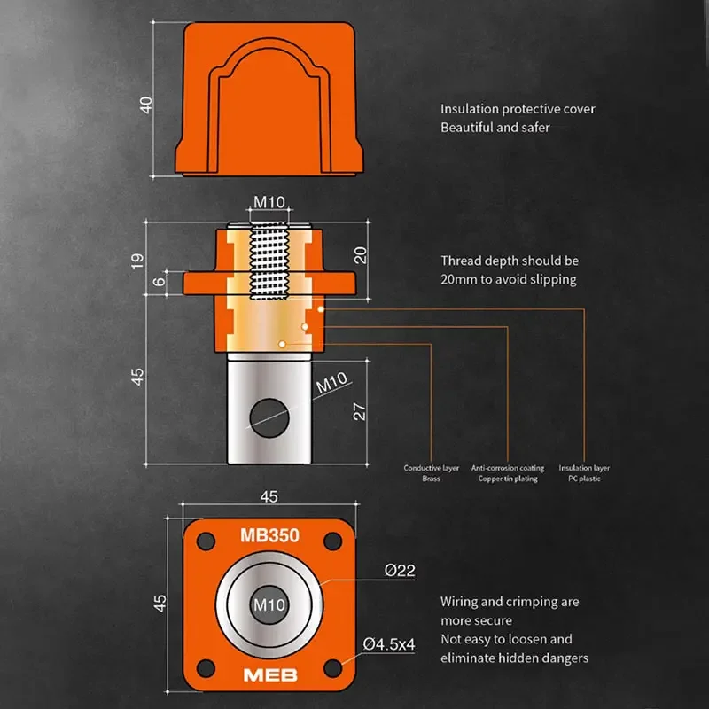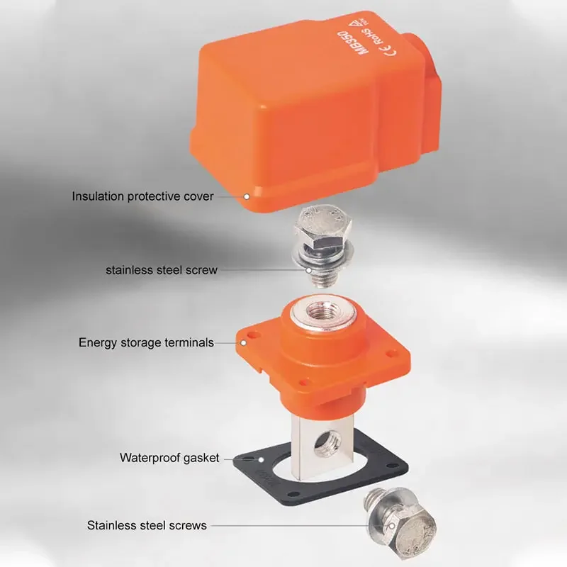Experience the robust design and high performance of this high-current energy storage terminal, perfect for your lithium battery system. Featuring a sleek, industrial style, it combines vibrant orange and sleek black tones with precise, geometric shapes that emphasize durability and safety. The large, rectangular plastic cover offers protection with a matte finish, clearly labeled with model information and safety symbols, reinforcing its professional appearance. The shiny copper terminal post, with a square base and rounded edges, provides a secure connection point, complemented by a top slot for easy usability. The black gasket seals the assembly against dust and moisture. Designed for high current capacities, this terminal ensures reliable power transfer, elevating your energy storage setup with confidence.
